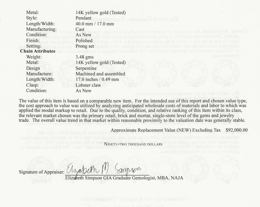 Spectacular Statement Piece - Huge 27.93 carat G.I.A. Certified Natural Emerald and Diamond Pendant featuring a rectangular cut Brazilian Emerald with rich Blue Green color. The Emerald is brilliantly accented with 2 round cut Diamonds weighing 1.15 carats with H-I colors and VS clarity set in a fine, custom crafted 14 karat yellow gold designer setting. Fine Luxury Jewelry Collection. Full Retail Appraisal - $92,500.00.
