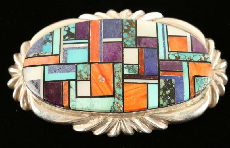 Made by Alvin Yellowhorse, marked on back. Beautiful geometric stone inlay set in sterling silver.