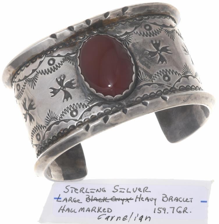 Native American Heavy Gauge Sterling Silver Cuff Set with a Carnelian cabochon with deep rust color and stamped design. Hand hammered details complete the design. 2” Wide. Hallmarked and stamped Sterling. 7.5" 1.5"GAP 159.7GR Total weight. Maker marked with sun burst and arrows.