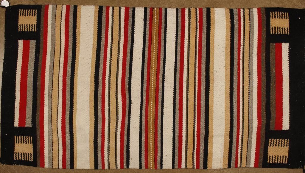 Striped pattern in red, tan, black and white. Measures 61"x32". Overall good condition, showing some piling.