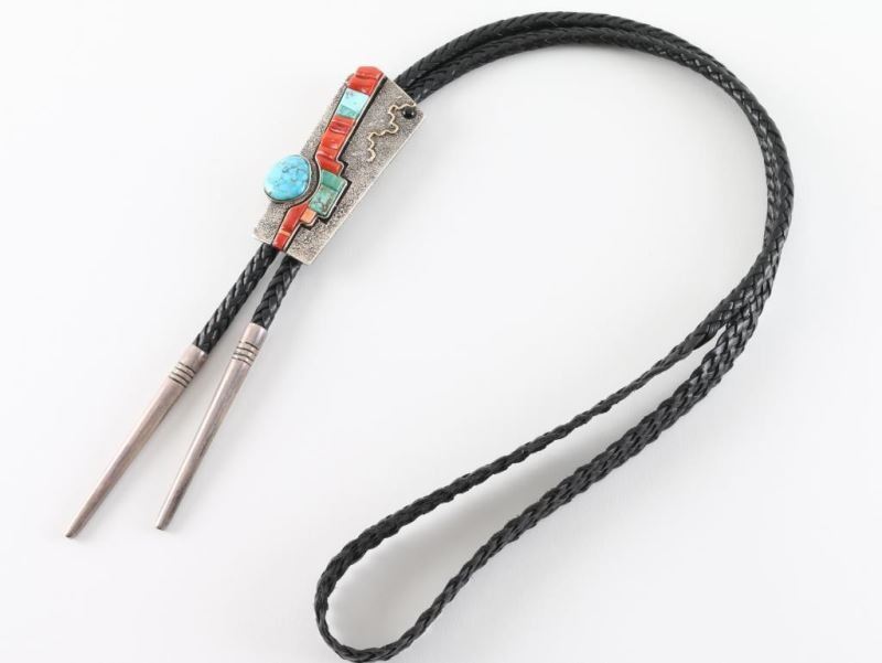all sterling with coral, turquoise, and onyx in abstract design maker marked Begay with braided string and sterling tips.