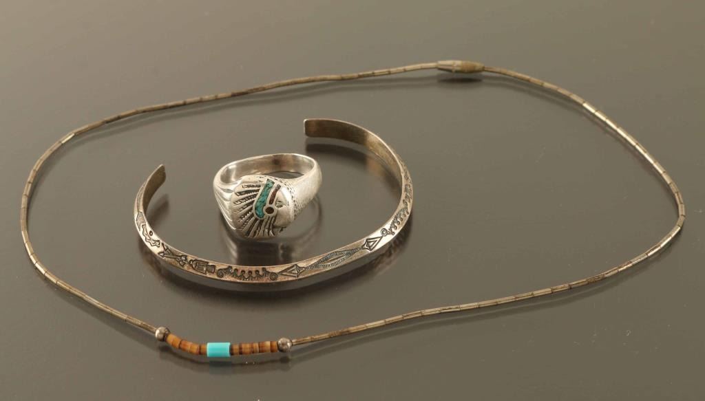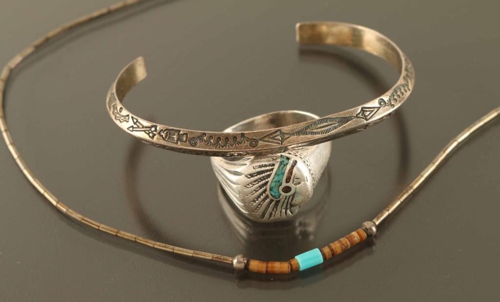 Including a mens sterling ring with Indian chief design, a stamp sterling cuff, and a thin sterling beaded necklace.