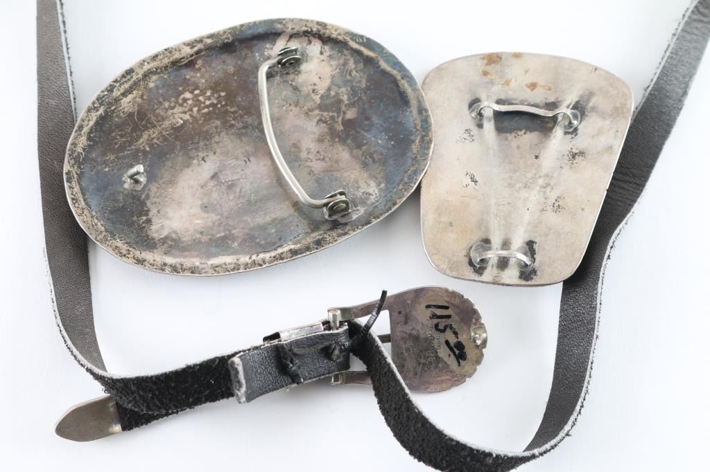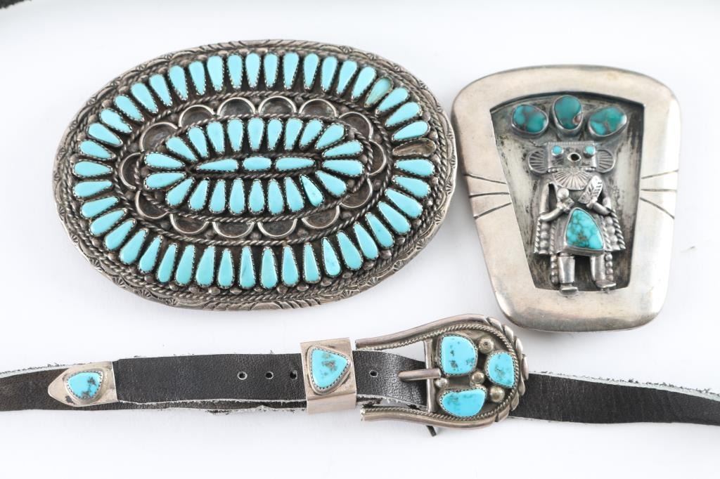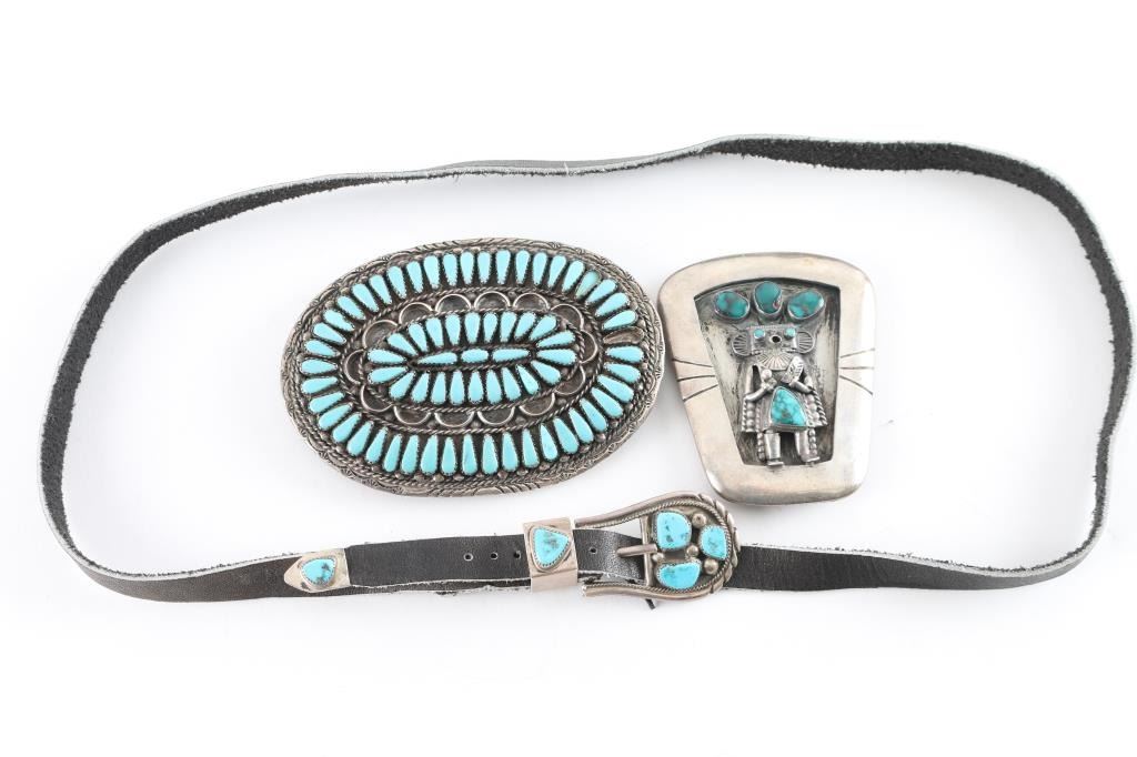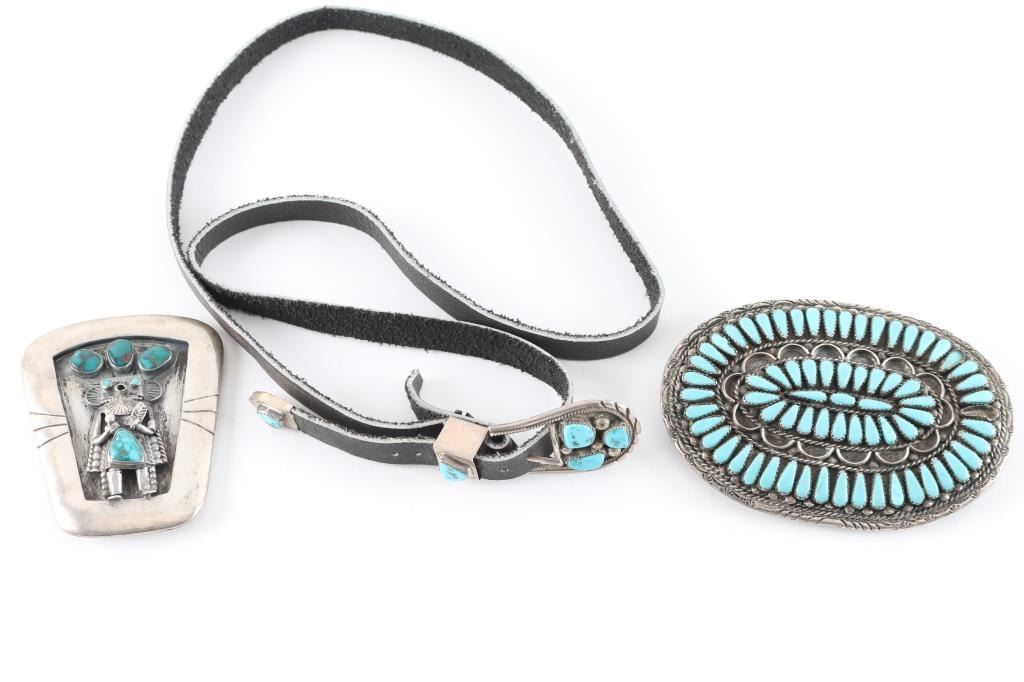 (1) Navajo Jewelry Lot including a 4-stone Kachina bolo tie, no strings. (1) Navajo turquoise cluster belt buckle, missing one small stone. (1) Navajo hat band, maker marked T. More, sterling construction accented with turquoise stones.