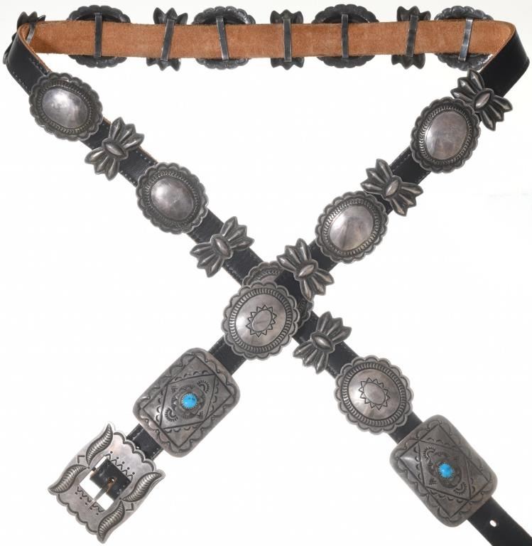 Decorated with (24) sterling silver conchos, two of which are decorated with very small turquoise stones done in traditional oval and butterfly design on black leather belt . Maker marked "R". Measures 50" end to end.