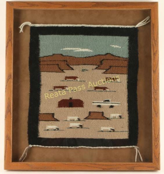 Framed, by Joanne Benally depicting cows at pasture. Measures 15 1/2"x16 1/2", won first place at the 44th Annual Navajo Fair in 1991.