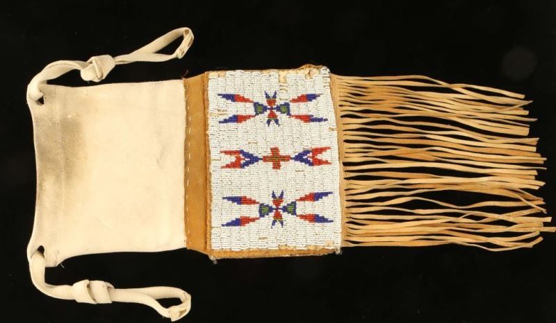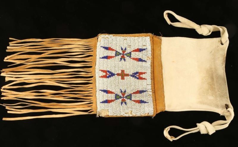 Leather bag with fringe that is beaded on both sides with a geometric pattern. Some losses to beadwork on both sides.