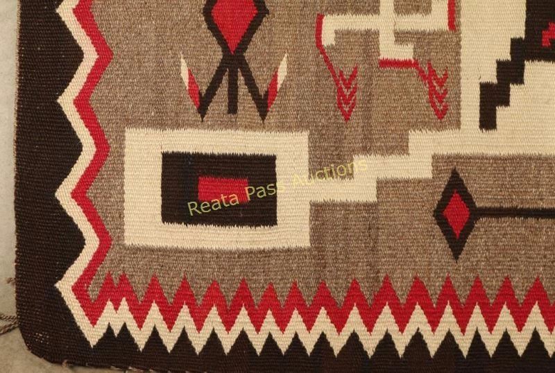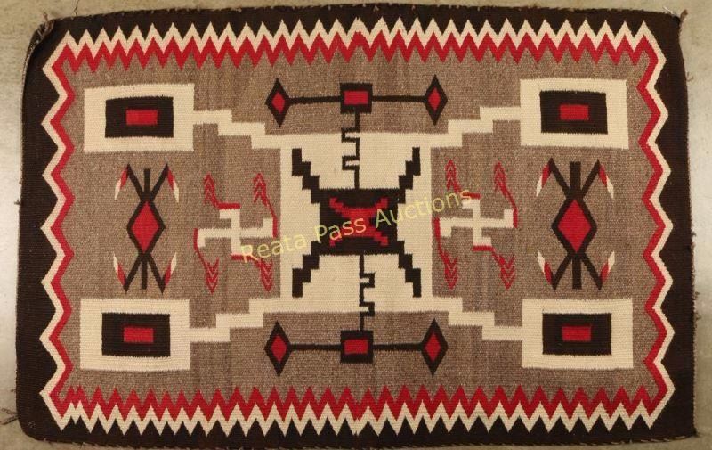Storm pattern in red, black and white with rolling good luck symbol. Purchased from the Dewey Galleries in New Mexico. Classic J.B. Moore, measures 46"l x 29"w.