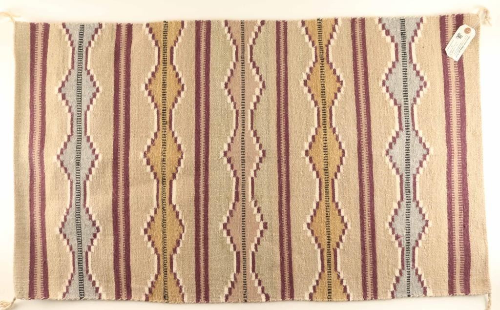 in beige, white, gray and light purple. With original tag stating it was done Helen Silago from Dalton Pass NM, 26"x44.5.Excellent condition