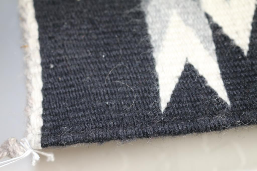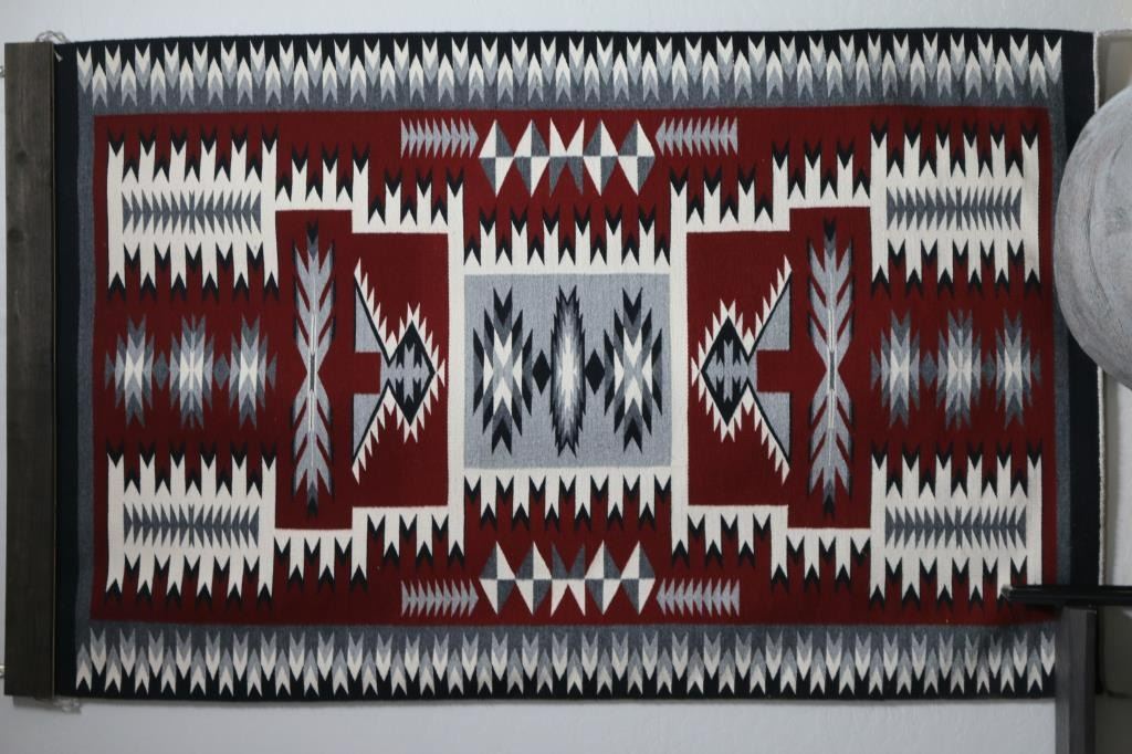 Ganado rug. Measures: 95"L X 48"W. Storm pattern. Gray, black, natural white, maroon colors. Mounting board attached for hanging. Excellent condition.