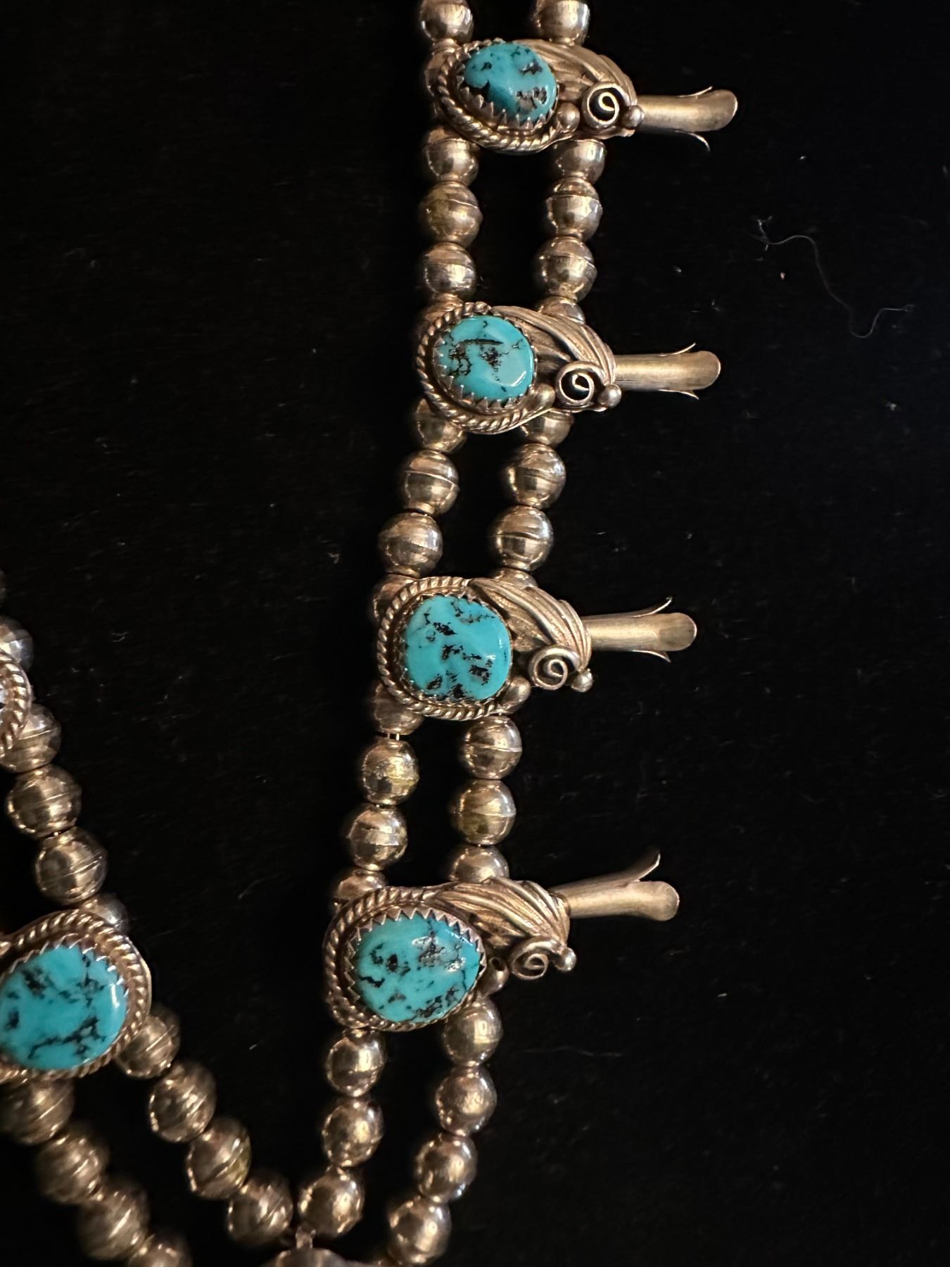 This magnificent circa 1950’s Navajo Squash Blossom Necklace showcases a Double Stand design of Silver Pearls with Kingman Turquoise; 4 Turquoise nuggets of per side and 5 Turquoise nuggets on the Naja.