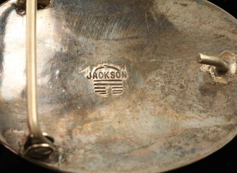 Oval of sterling silver with two carved bears facing each other with a turquoise cab on the top and bottom of the buckle. Marked 'Jackson'.