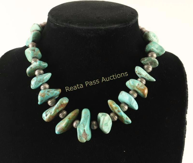 Classic 1970s, with chunky natural turquoise stones and hand seamed sterling naja beads. A great statement piece.
