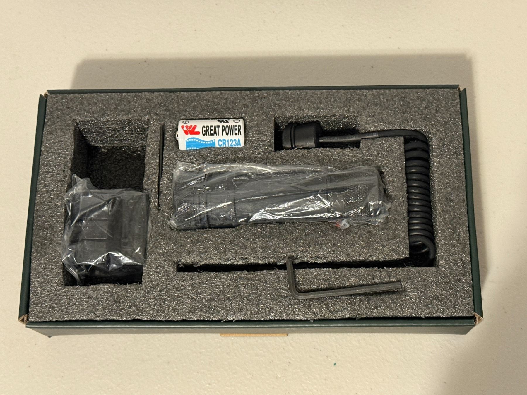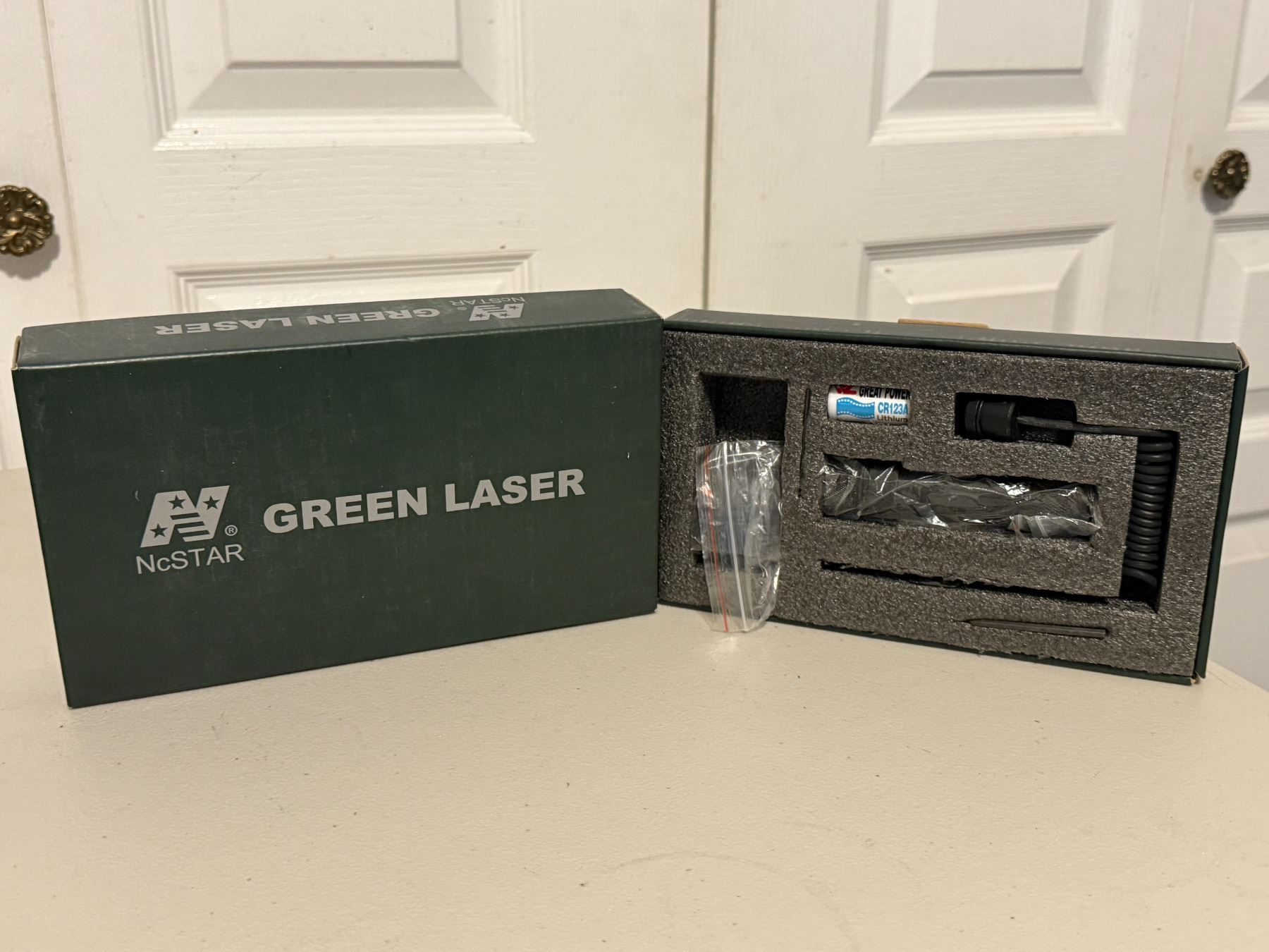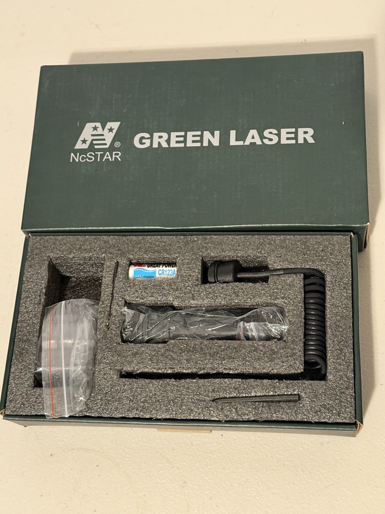 NcSTAR green laser sight with original box and accessories as shown. Includes pressure switch, battery, and mounting hardware. Appears lightly used. Untested. Sold as-is.