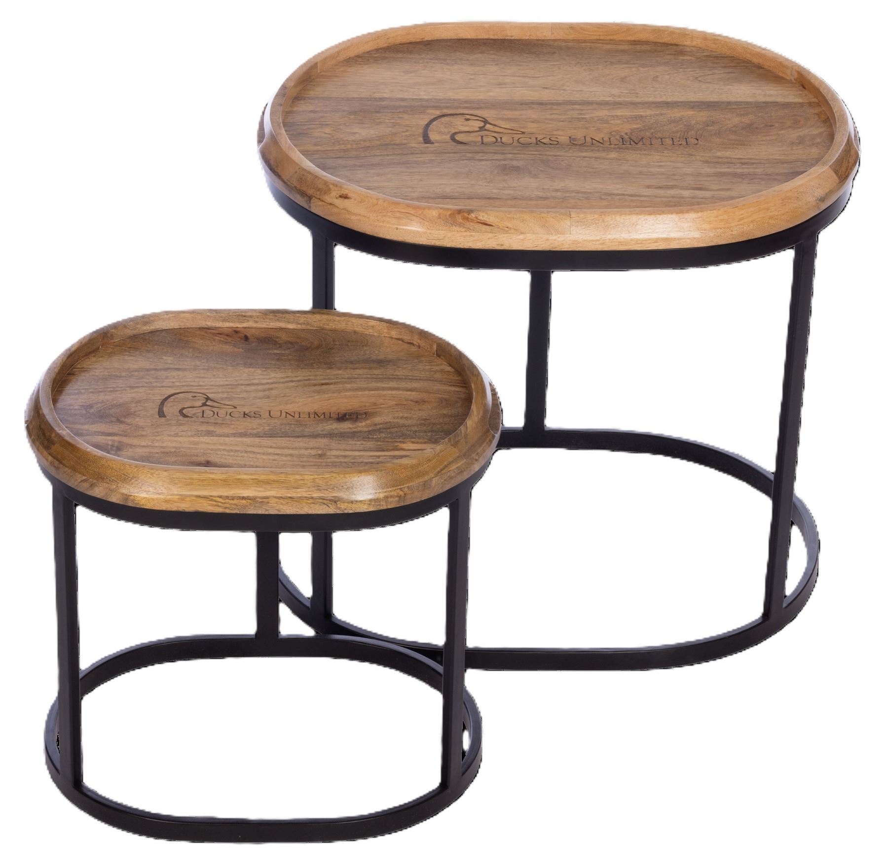 Introducing a versatile addition to your living space, these oval nesting tables offer both style and functionality. Handcrafted in solid mango wood with a sleek powder-coated metal base finished in black, these tables exude a modern yet timeless aesthetic. Their multi-functional design allows for easy adaptation to your needs; the tabletops can be effortlessly removed and used as serving trays, adding convenience to your entertaining endeavors. Laser-etched with the distinguished Ducks Unlimited logo on each top, these tables also showcase your passion for outdoor conservation. The larger table measures 25” x 18.5” x 21.75”, while the smaller counterpart measures 18.5” x 13.5” x 17”, providing ample surface area while offering space-saving nesting capabilities. Whether used together or separately, these nesting tables effortlessly blend form and function in any home décor setting.