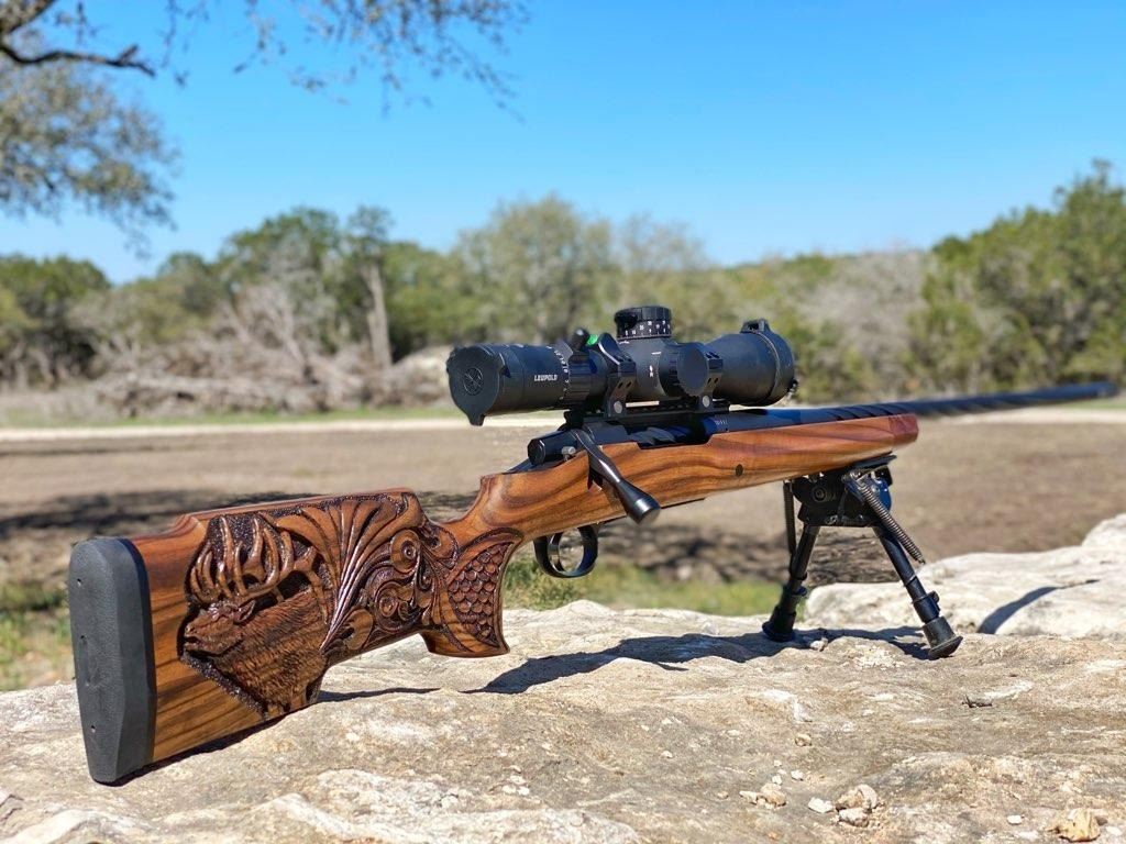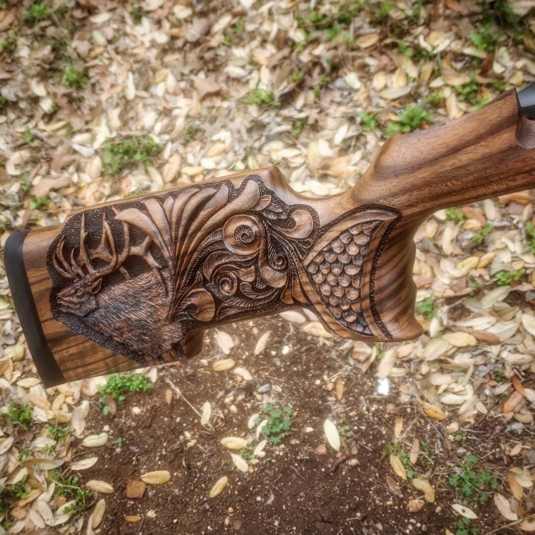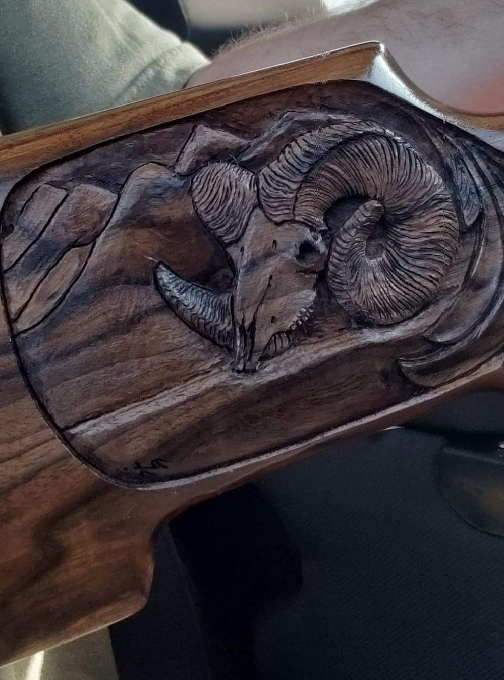 One of a kind hand carved custom rifle by Nevada Grassie. Stock is carved with a bull elk on one side and bighorn sheep on the other. The rifle is a 300 PRC built on Curtis Custom Helix action w/ 20 moa picatinny rail scope base. 24" spiral fluted barrel. Hawkins BDL hinged floor plate and internal mag parts. TriggerTech Special adjustable trigger.