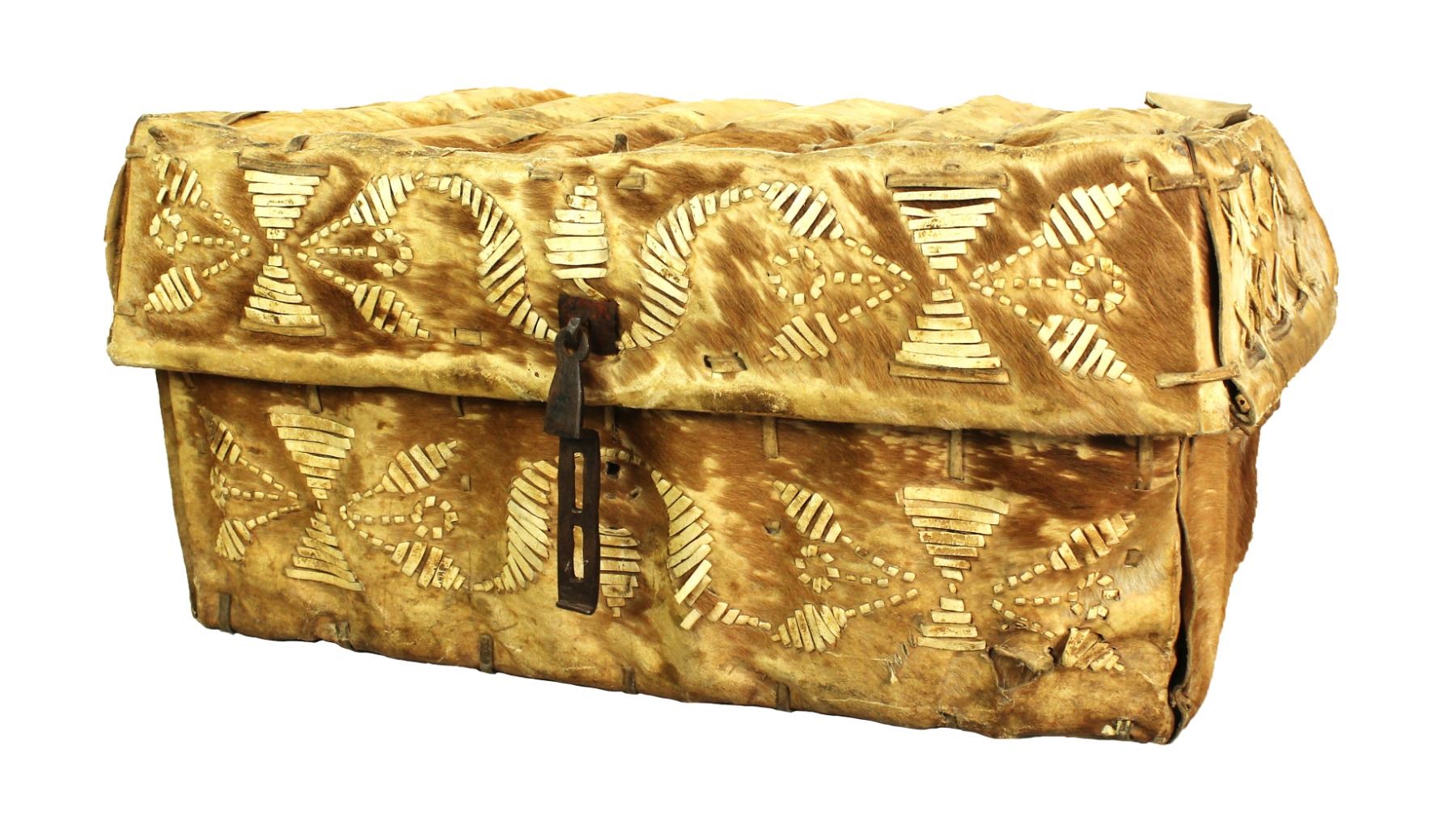 Dazzling, very early Spanish Colonial period, 18th Century hair-on cowhide traveling trunk, adorned with beautiful patterns of laced leather, and hand forged hinge. Incredibly preserved and shwing great condition and patina. Measuring 26"wide x 16"deep x 13"tall.