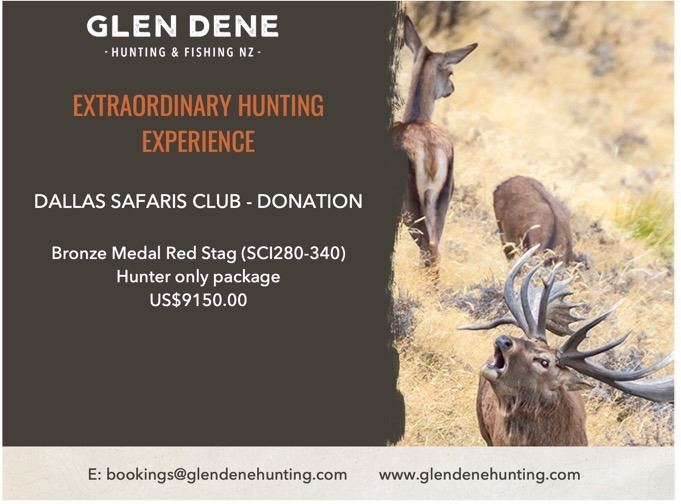 6 nights Single Accommodation. All meals included (Beer and Wine with Dinners). 5 days guiding (1 - 2 hunters to 1 guide) 1 Bronze Medal Red Stag (SCI280-340) Transfer to and from Queenstown Airport Gun Hire Included for the week. Valid for 2 full years from Auction Date. Options to upgrade or add on other animals. Does not include Costs for Expediting of Trophy and Airfare to and from New Zealand. Dates need to be inquired.