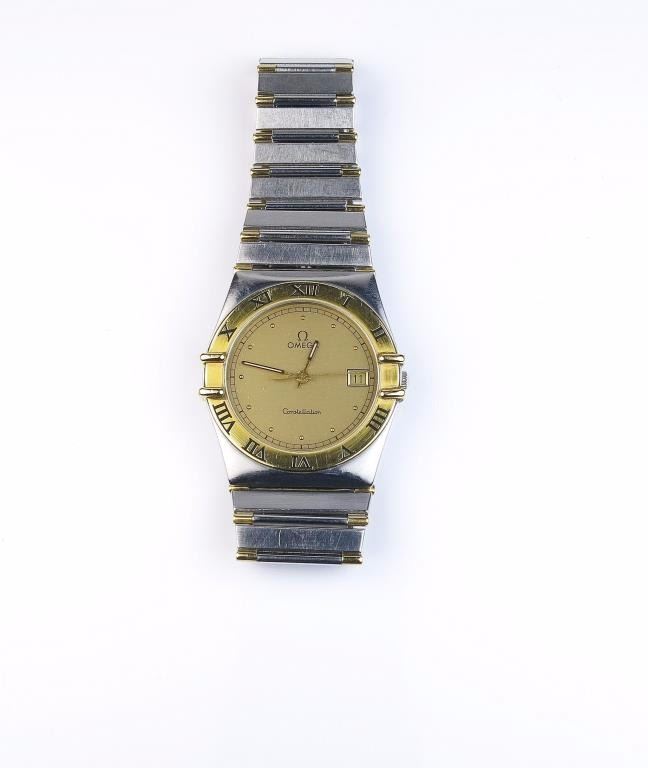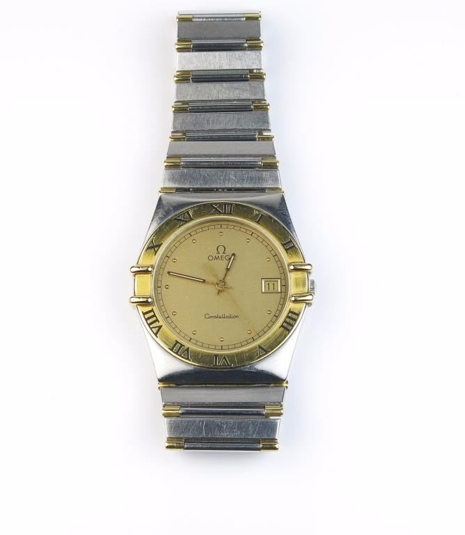 Nice Gents Omega Constellation watch in 18 karat yellow gold and stainless steel has been overhauled and cleaned and in mint running condition. Estimates $1,000-$1,500
