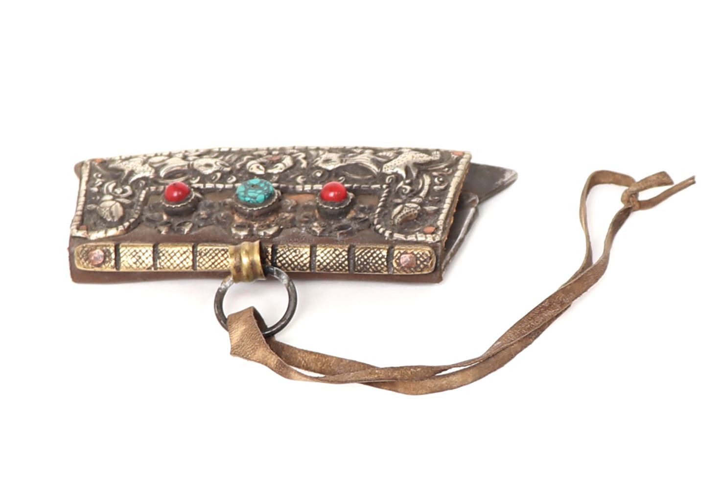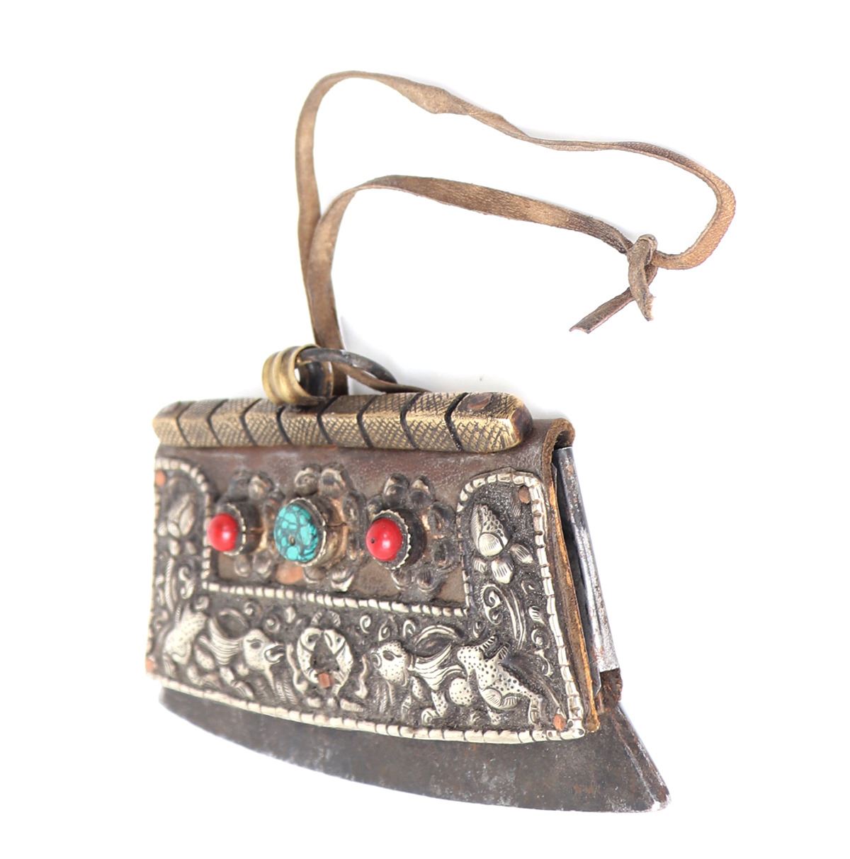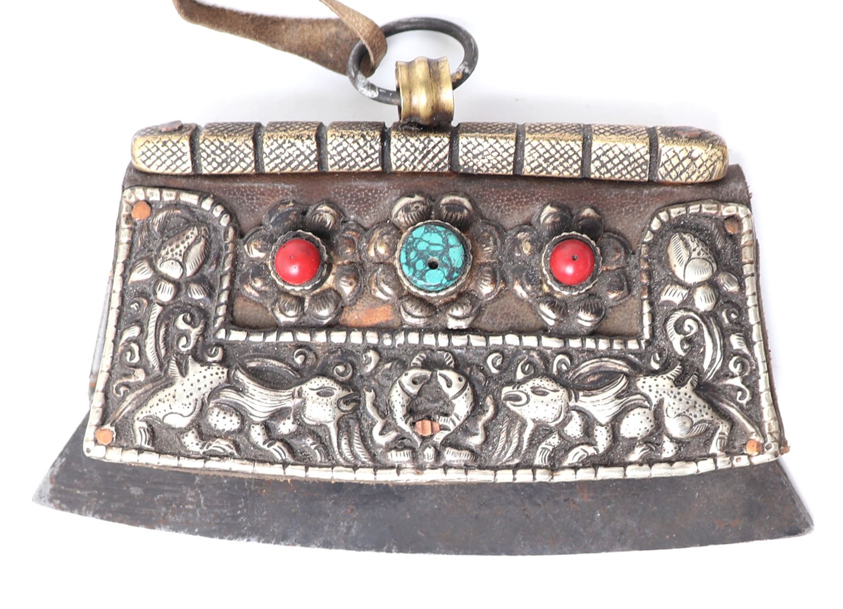 Tibetan flint striker, or chuckmuck purse comprised of a thick stiff leather purse with a sturdy curved steel striker attached using three rivets. Sides and flap of the purse are either sewn or fixed by this beautiful ornamental metal plaque. Plaque depicts two zoomorphic cat like animals preying on two fish, with flowers and flora surrounded them - all in high relief. Three beautiful natural stones also decorate the face in turquoise and coral. Crass cap with loop and metal ring, short leather strap to be hung from the belt, a chain, leather thong or loin cloth. Size 6" W x 3 1/4" H. Condition: Nice condition throughout with patina throughout.