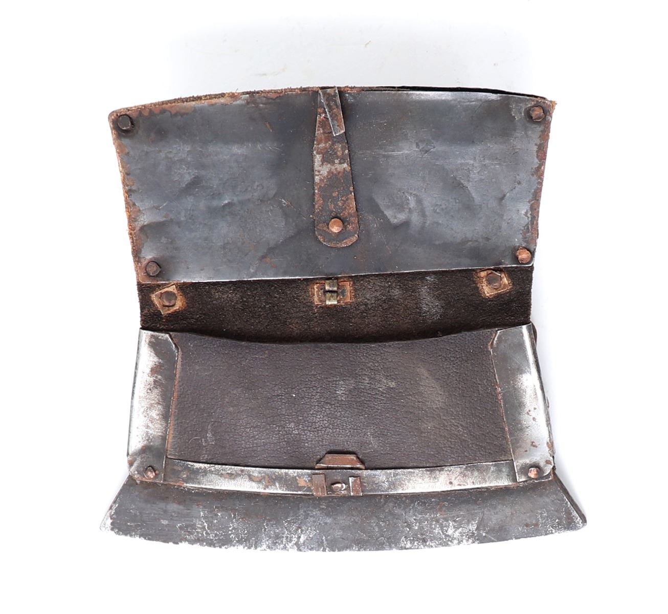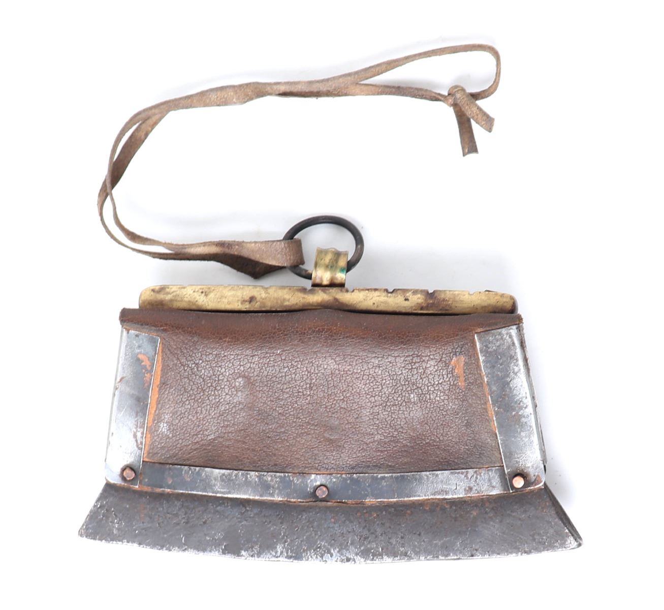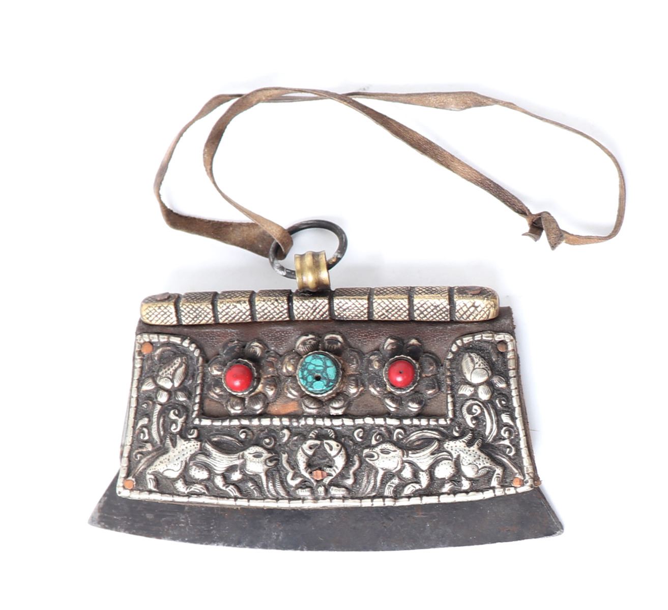 Tibetan flint striker, or chuckmuck purse comprised of a thick stiff leather purse with a sturdy curved steel striker attached using three rivets. Sides and flap of the purse are either sewn or fixed by this beautiful ornamental metal plaque. Plaque depicts two zoomorphic cat like animals preying on two fish, with flowers and flora surrounded them - all in high relief. Three beautiful natural stones also decorate the face in turquoise and coral. Crass cap with loop and metal ring, short leather strap to be hung from the belt, a chain, leather thong or loin cloth. Size 6" W x 3 1/4" H. Condition: Nice condition throughout with patina throughout.