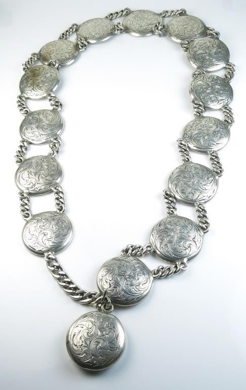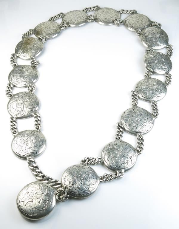 Nice ladies Concho Sterling Silver belt weighing approx. 300 grams (10 ounces) measures approx. 35 inches. Custom made and stamped by NEWMANS Silver Shop in Reno Nevada. Retail $2,000-$3,000 Estimates$1,200-$1,500
