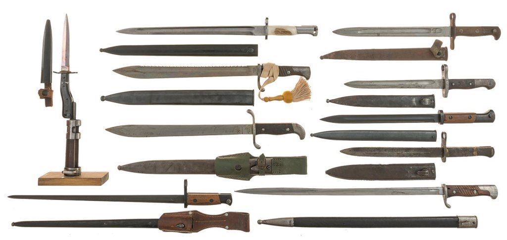 Most, if not all, of the items were manufactured in Germany. 1) "11167" marked bayonet with scabbard. 2) German K98 bayonet with scabbard mounted on a K98 forend piece with base. 3) Unmarked bayonet and scabbard with stag scales. 4) "dot" and "2330/j" marked bayonet with "dot/42" scabbard. 5) V. C. Schilling saw-back bayonet with yellow and beige portepee and scabbard. 6) Model Argentino 1909 short sword with matching numbered scabbard and frog. 7) Unmarked rifle bayonet with scabbard and frog. 8) "24537" bayonet with mismatched scabbard. 9) Unmarked bayonet with scabbard. 10) Waffenfabrik Neuhausen bayonet with scabbard. Condition: The final two items are poor, but the rest are fine or better and some are refinished.