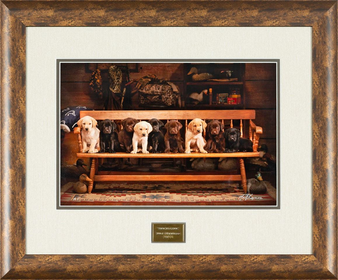 This image shows nine lab puppies sitting on a wooden bench with hunting gear in the background. The framed and matted 10”x 15” photograph is signed and numbered by photographer Marty Keeven and includes a brass title medallion inlaid in the mat. Overall dimensions are 18 3/4”x 22 ½.”