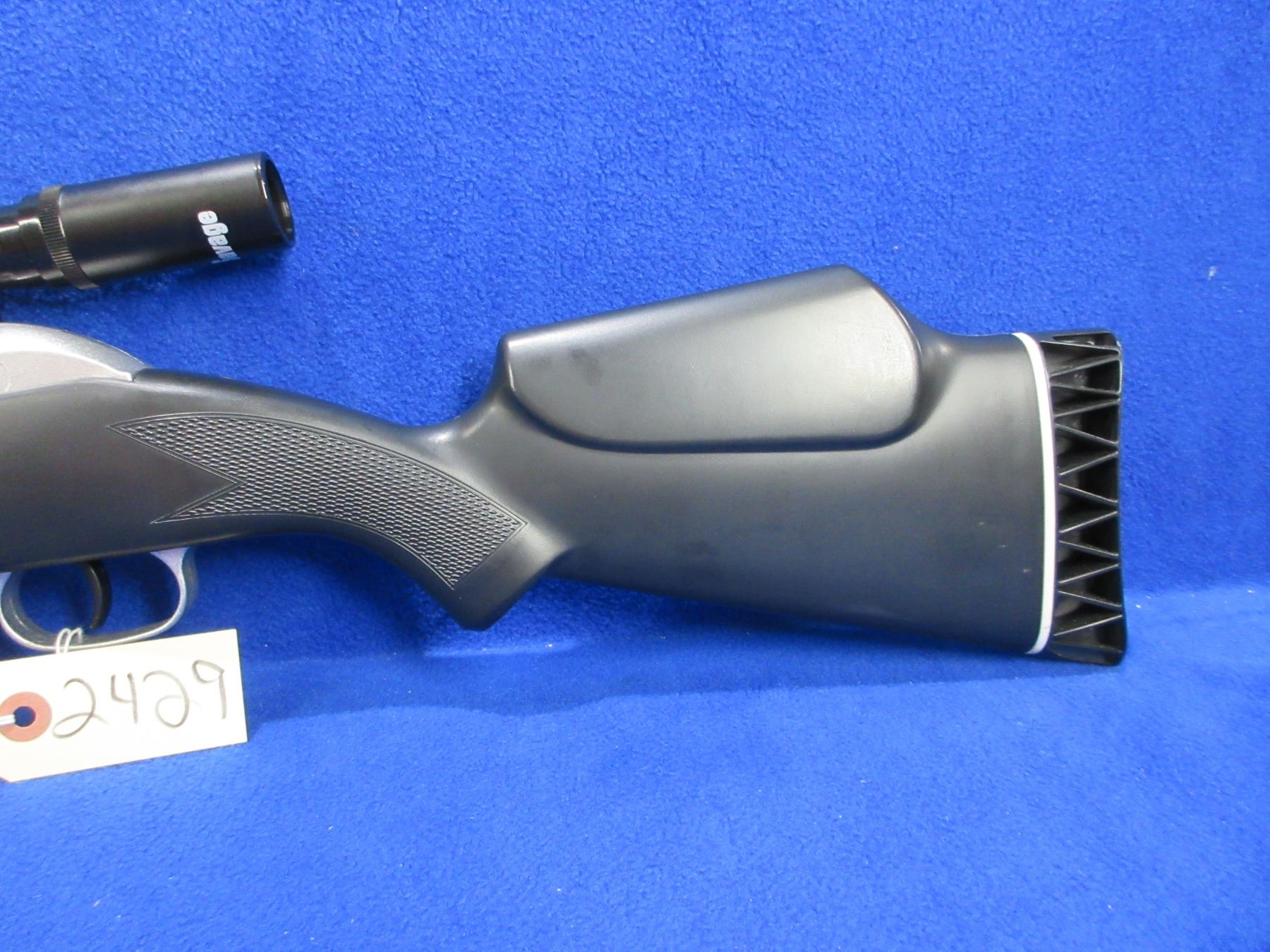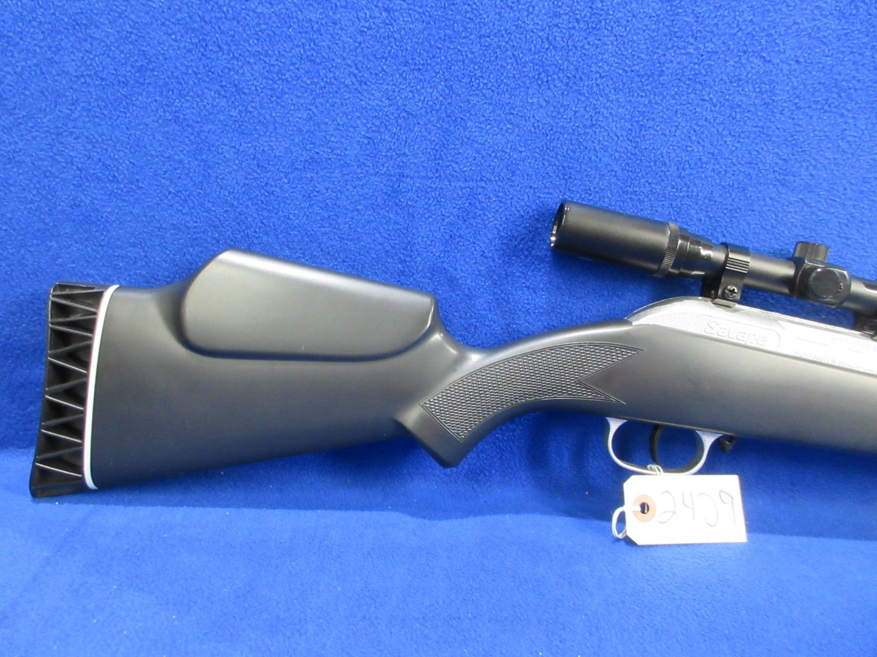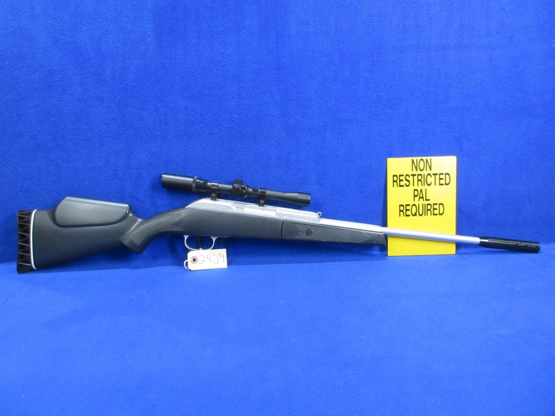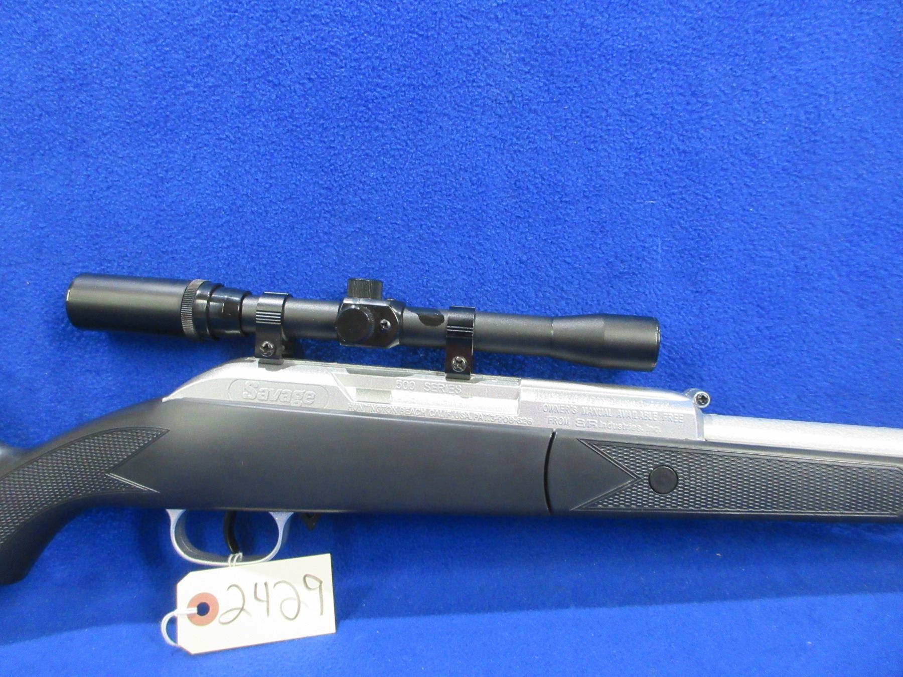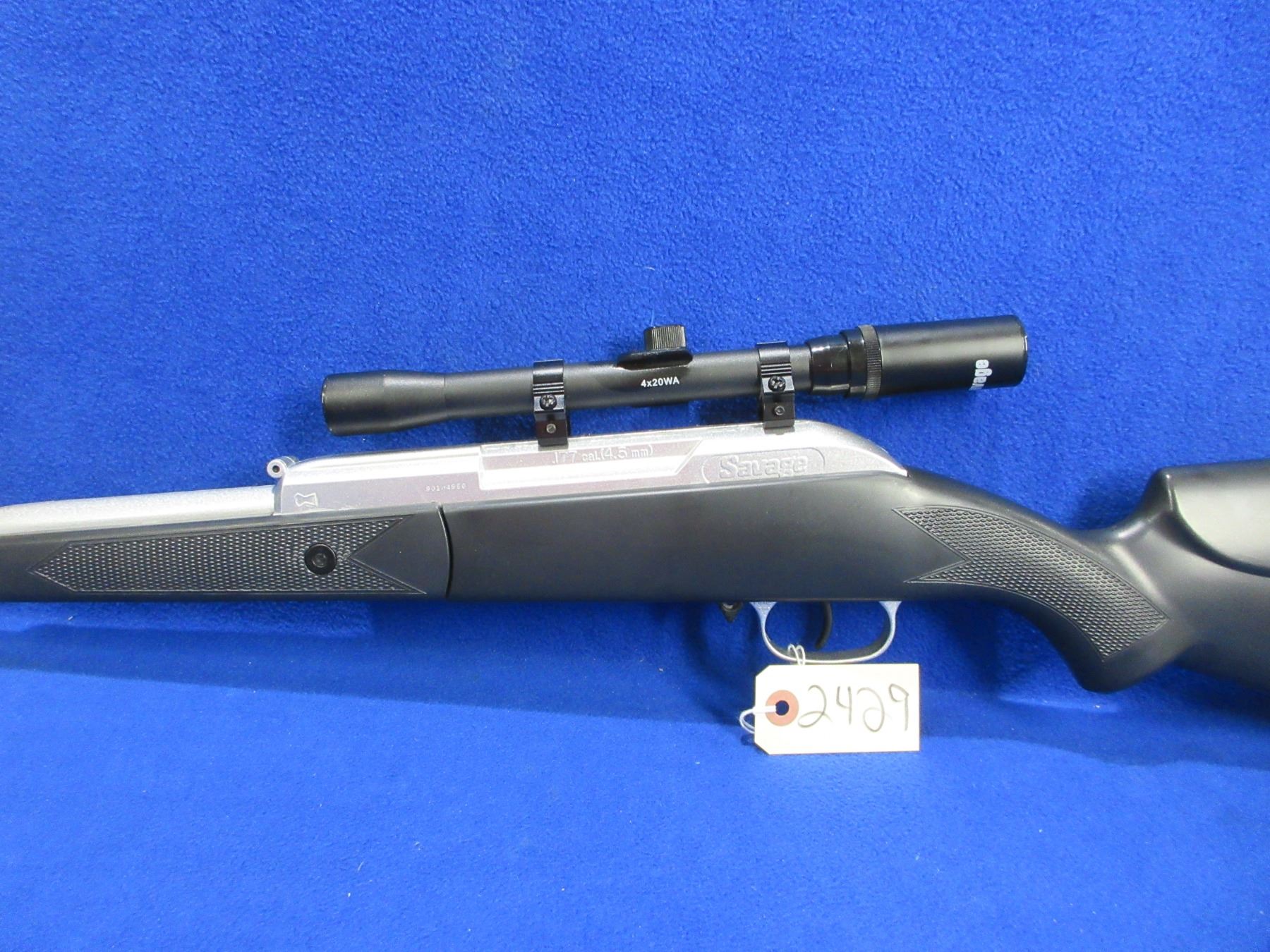 No PAL Required as 495 FPS - Savage 500 Series in .177 Cal. - This break barrel action single shot air rifle appears to be in good to very good working order. Barrel is 16", rifling is good to very good, silver finish is good to very good, has no sights but has Savage 4x20 wide angle scope - duplex reticle - appears clear, stock is good, plastic butt pad good. Ser # 90104950