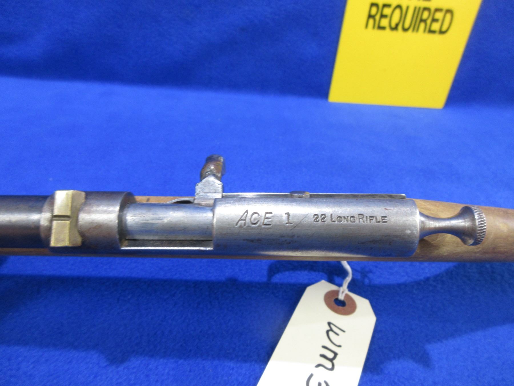 Non-Restricted - Ace1 by Cooey in 22 LR - This single shot bolt action rifle appears to be in good working order but bolt handle has been repaired. Barrel is 17", rifling is good to very good, bluing is good for age, has both sights but rear sight is brass and may not be original, stock is good for age but has a crack by trigger guard, no butt plate. Ser # None