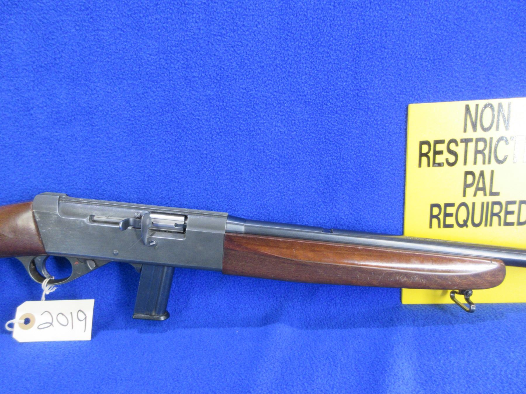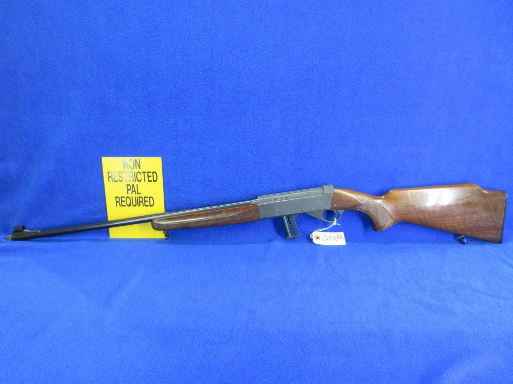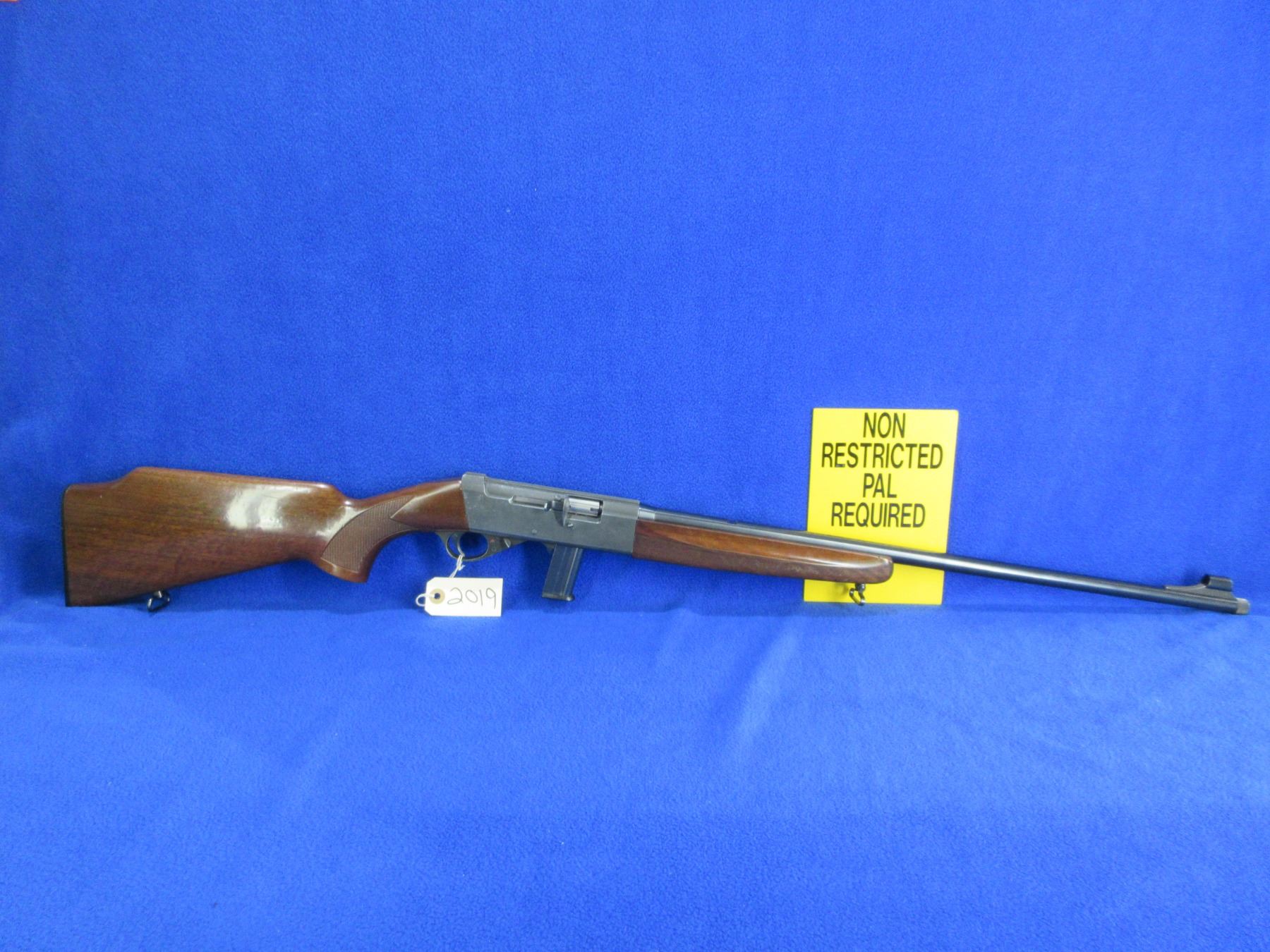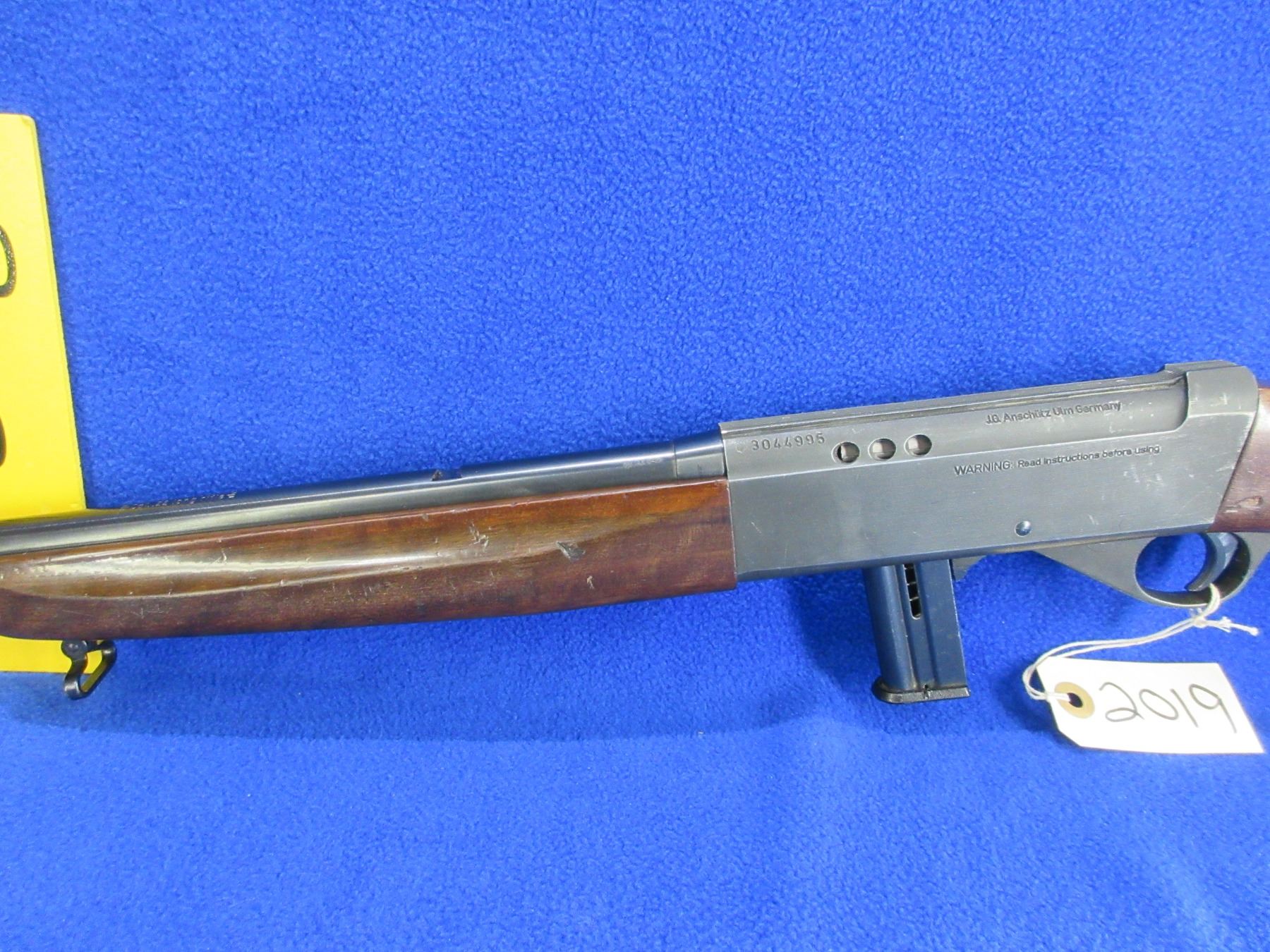 Non-Restricted - Anschutz Model 525 in 22 LR - This is a semi-auto rifle with removable magazine, action appears to be in good to very good working order. Barrel is 23 3/4", rifling is good to very good, bluing is good, has front sight, missing rear sight but has integral base, stock and forearm are good with usage marks, length of pull is 14", butt plate good, comes with swivels and thread cap. Ser # 3044995