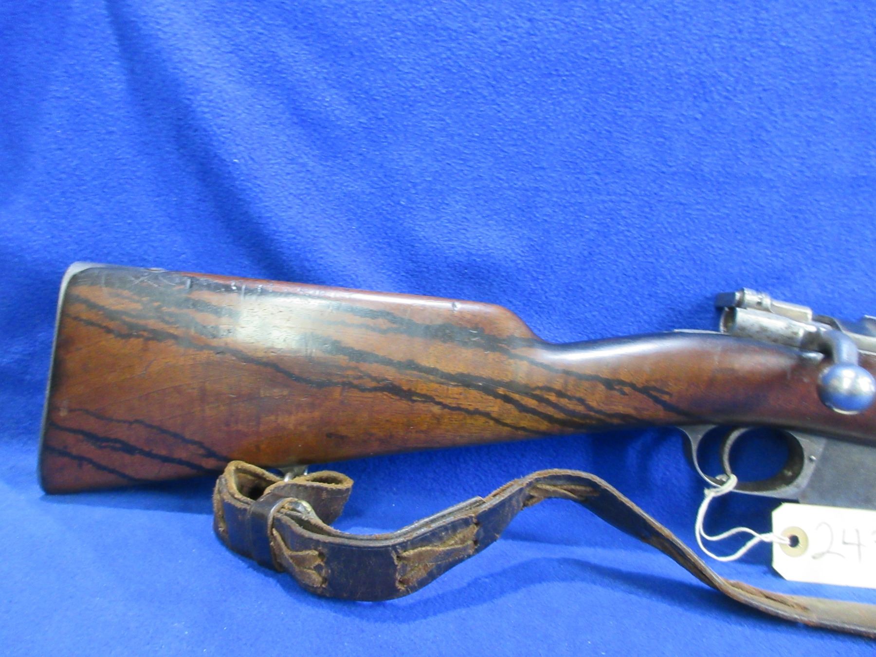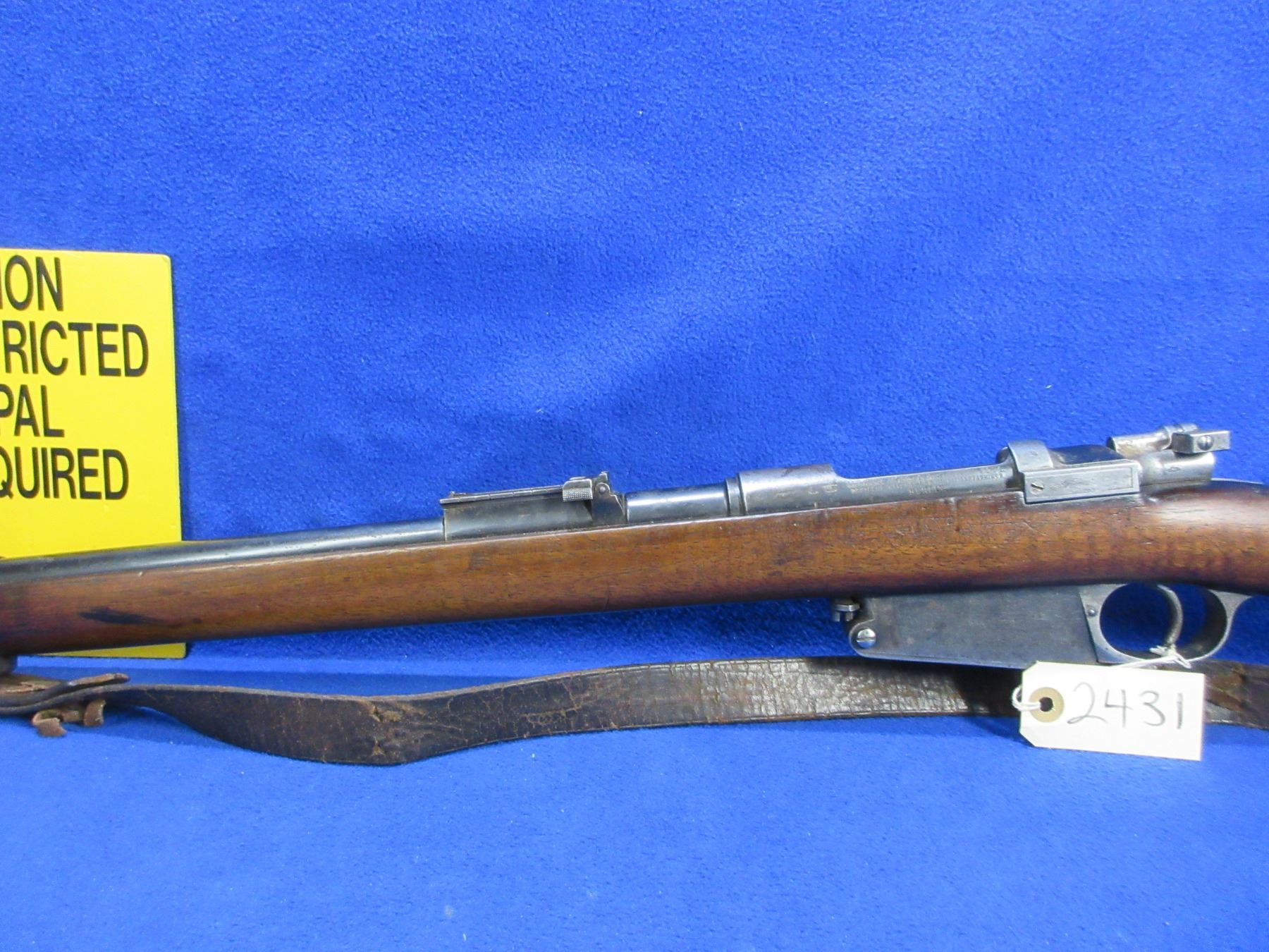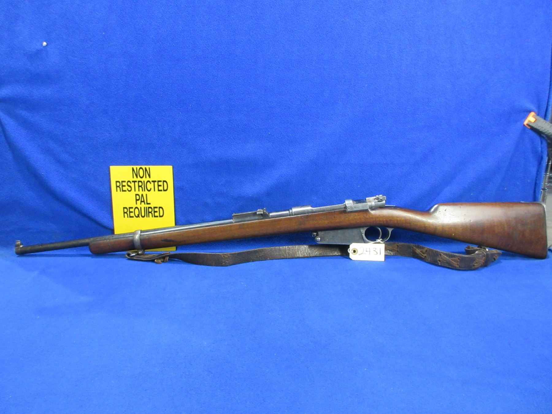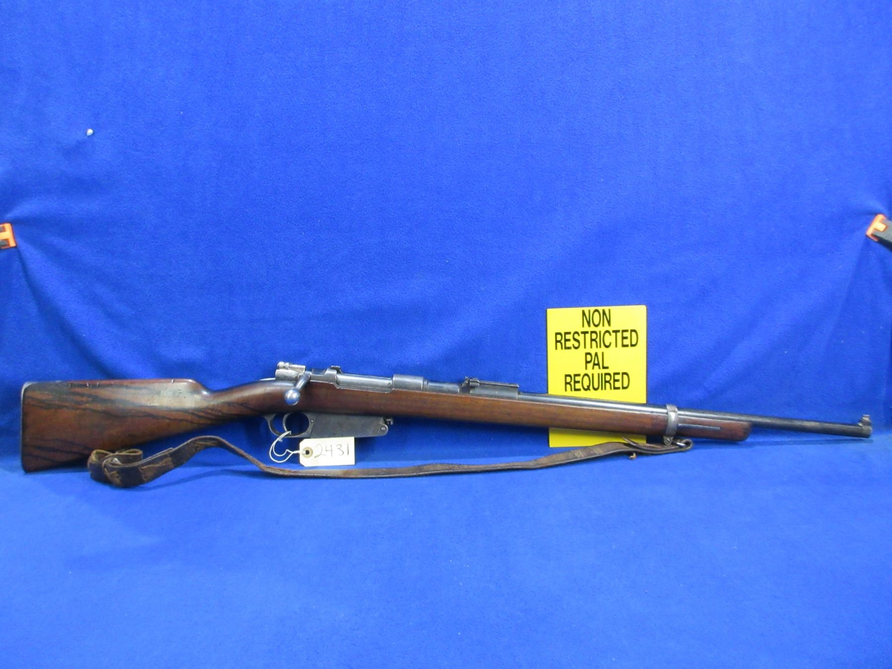 Non-Restricted - Argentine Mauser 1891 in 7.65x53 - Interesting grain on this one. Made in Berlin, this bolt action rifle with internal magazine appears to be in good to very good working order. Barrel is 24", rifling is good to very good, bluing is turning grey with light pitting, has both sights (front sight has a repair), stock is good with usage marks, metal butt plate good, comes with swivels and sling, appears all numbers matching. Ser #U8364