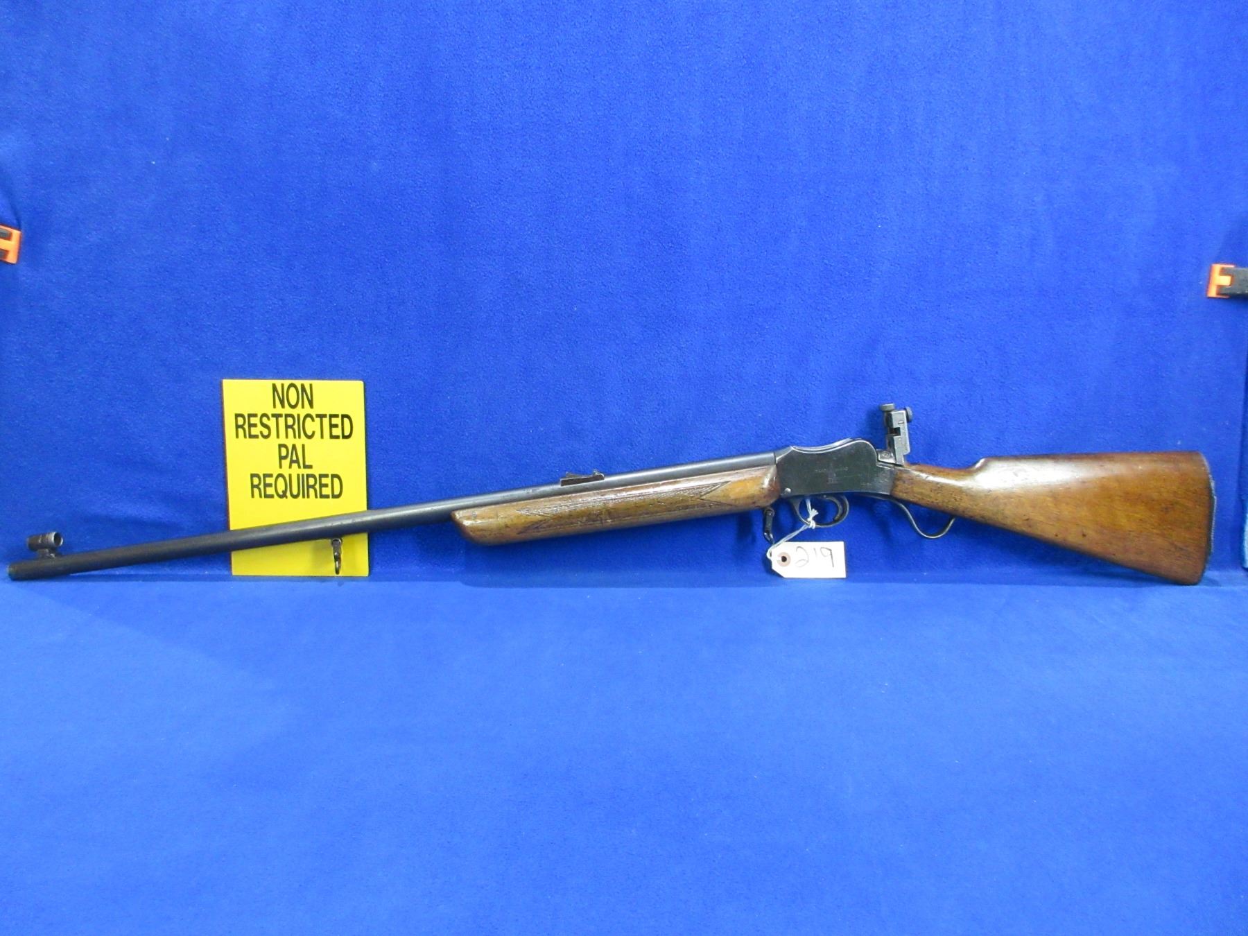 Non-Restricted - BSA Model Martini in 220 LR - This single shot falling block rifle appears to be in good to very good working order. Barrel is 29", rifling is good to very good, bluing is good with light pitting, has front and rear peep sights but mid sight is missing, stock is good for age with many usage marks, forearm has a crack on the right side at the front, butt plate is broken, comes with swivels. Ser # 42911