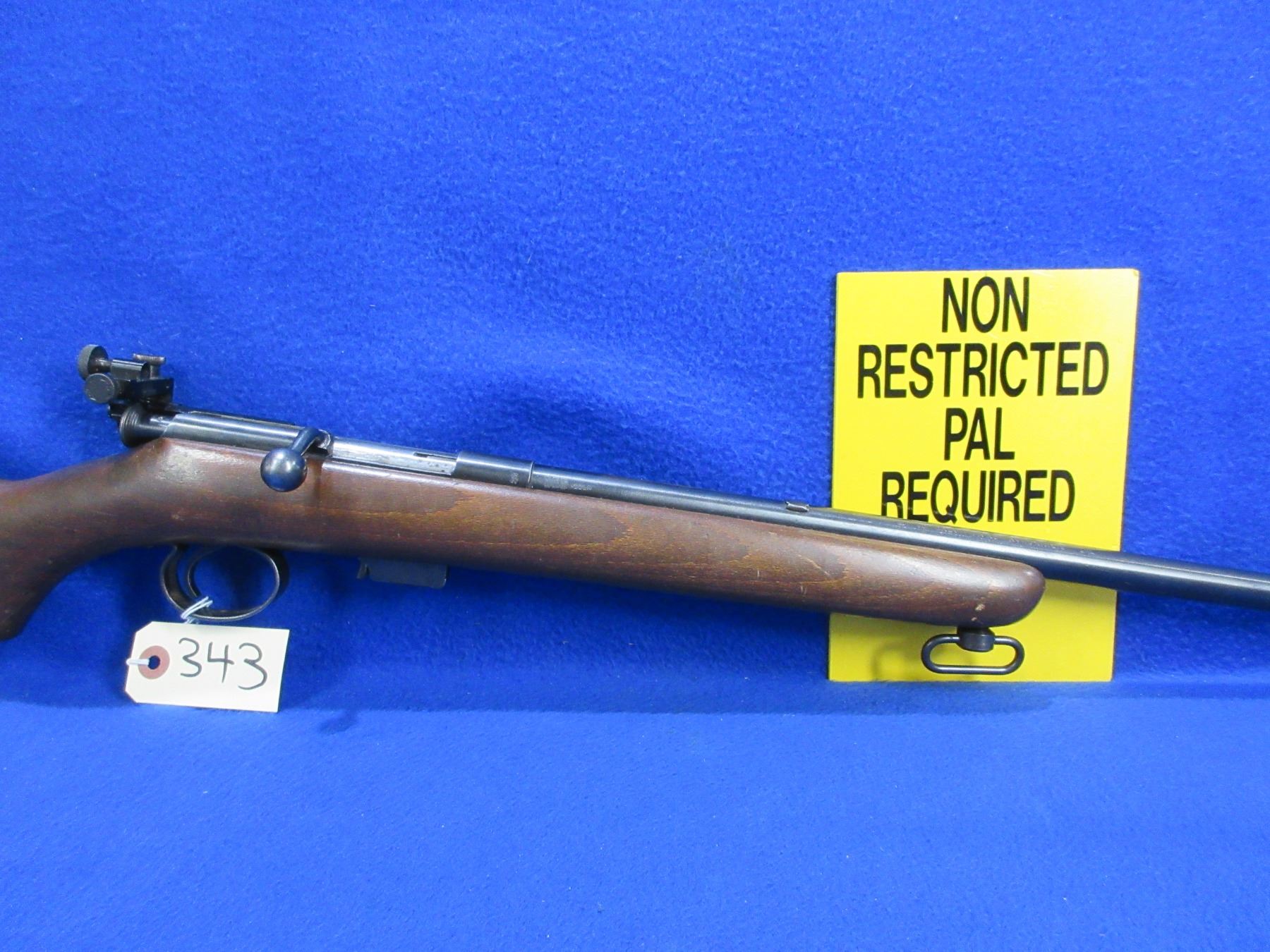 Non-Restricted - BSA Sportsman-Five in 22 LR - This bolt action rifle with removable magazine appears to be in good to very good working order. Barrel is 25", rifling is good to very good, bluing is good, has front globe sight, rear sight removed but added rear peep sight, stock is good to very good, comes with swivels. Ser # KB44767