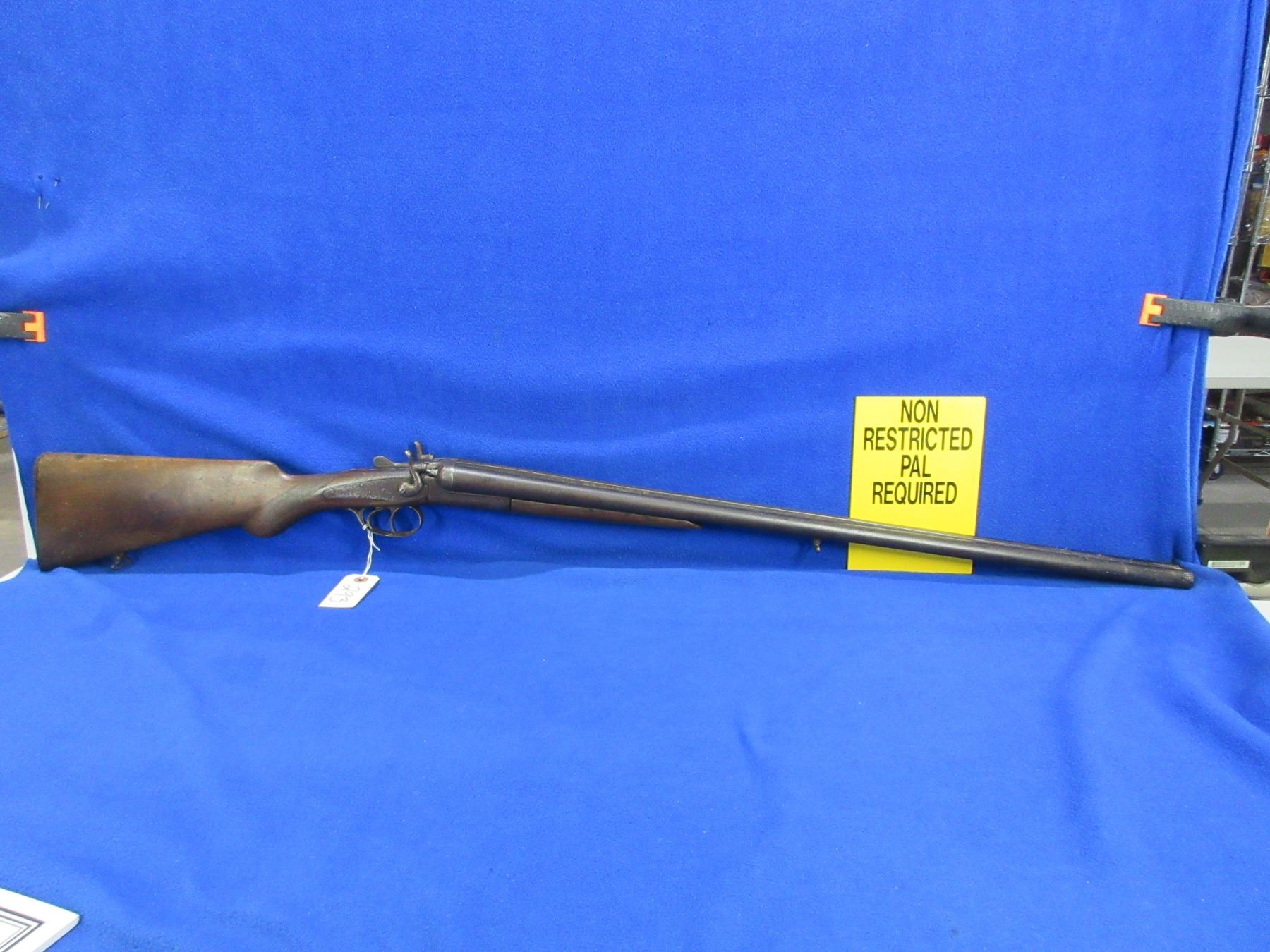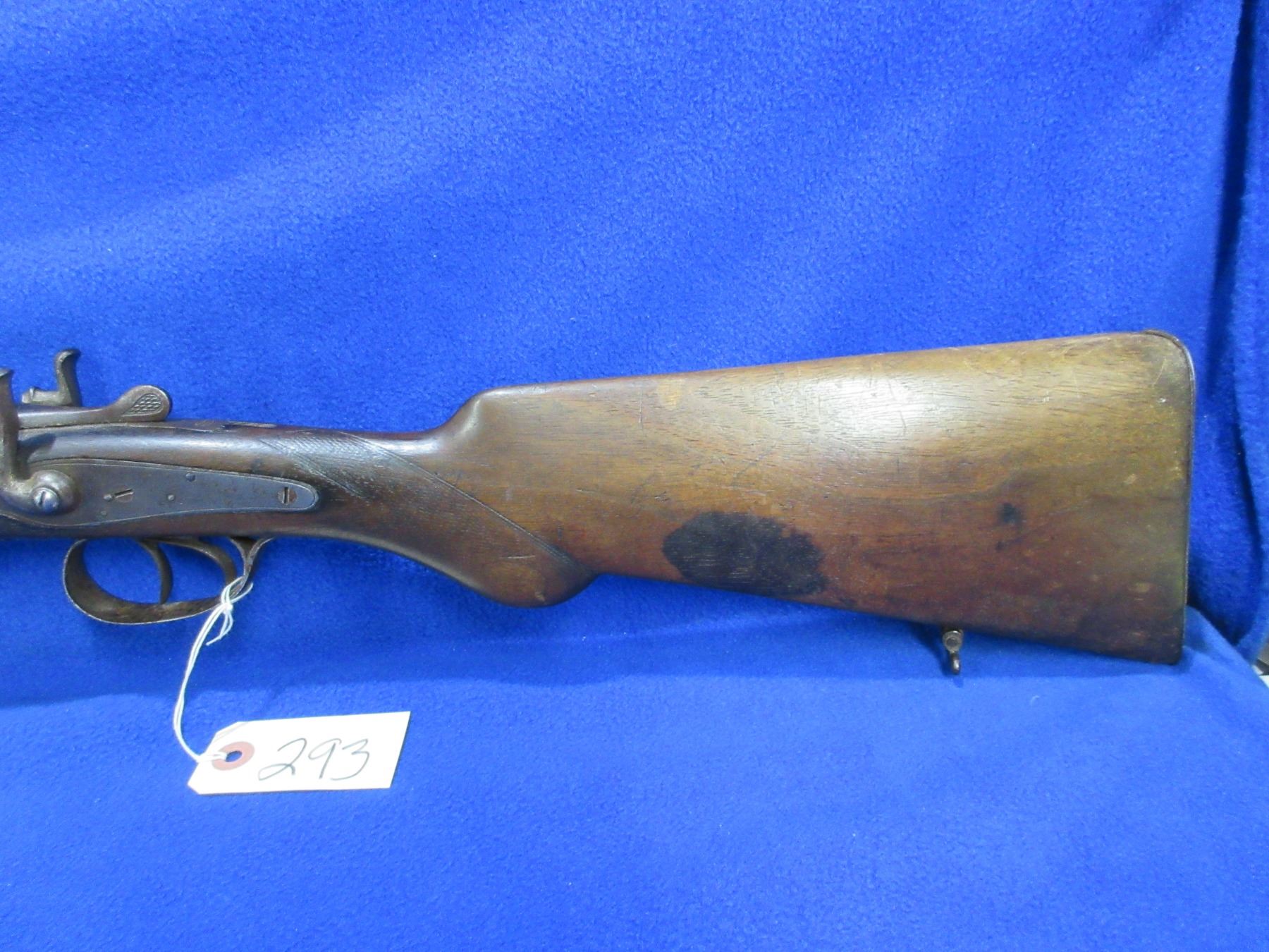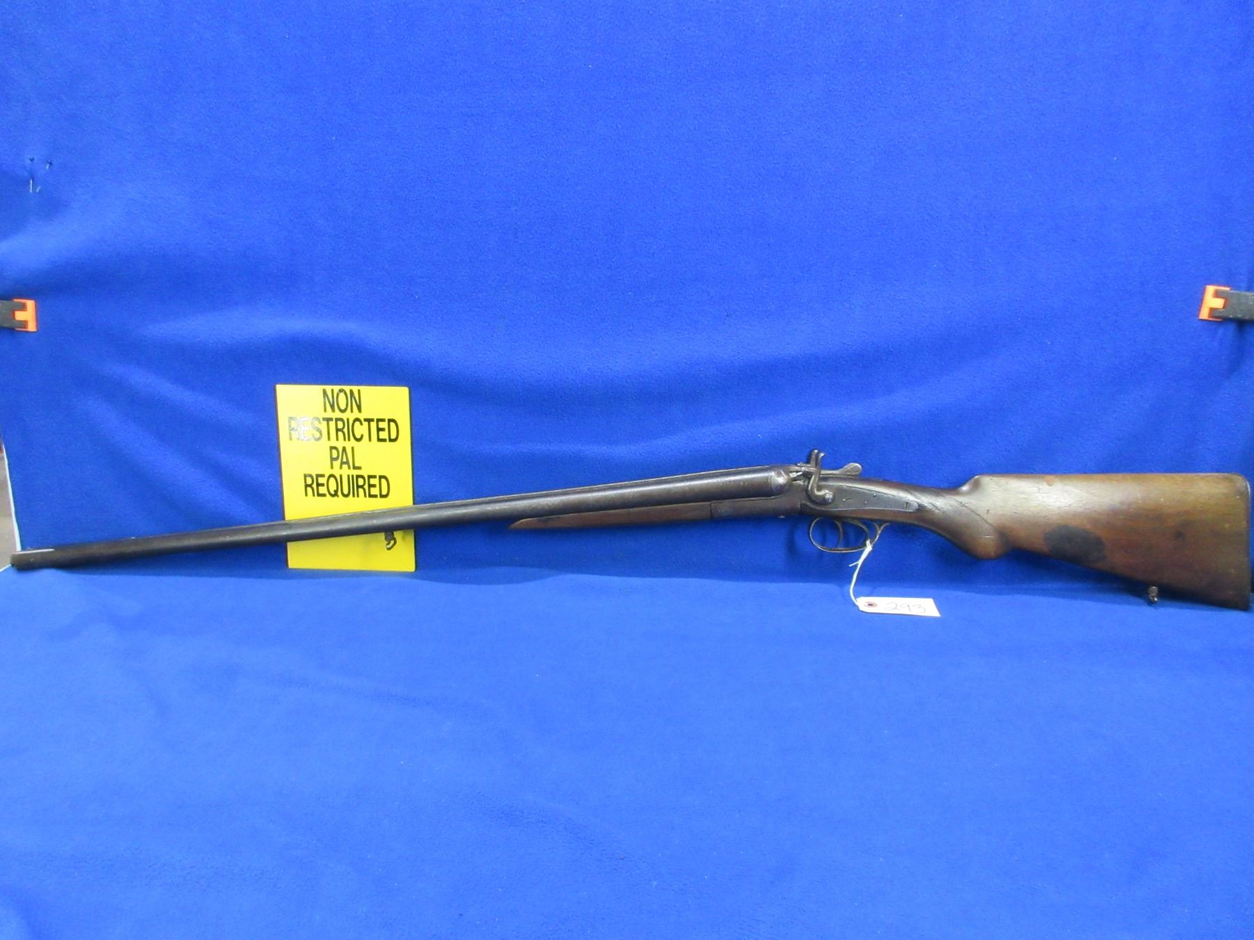 Non-Restricted - Belgian Rauchlos Beschossen SXS in 16Ga. 2 1/2" - This tip up hammer SXS shotgun appears to be in working order but action is loose and doesn't close properly, would make a great Wall Hanger. Barrels are 29 1/2", bores are good, bluing is gone and pitted, has bead front sight, stock is good with many usage marks, forearm has a crack at the back, metal butt plate. Ser # 15747