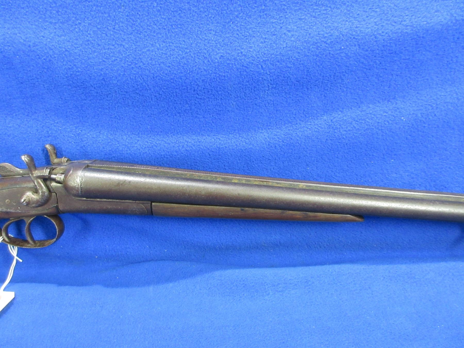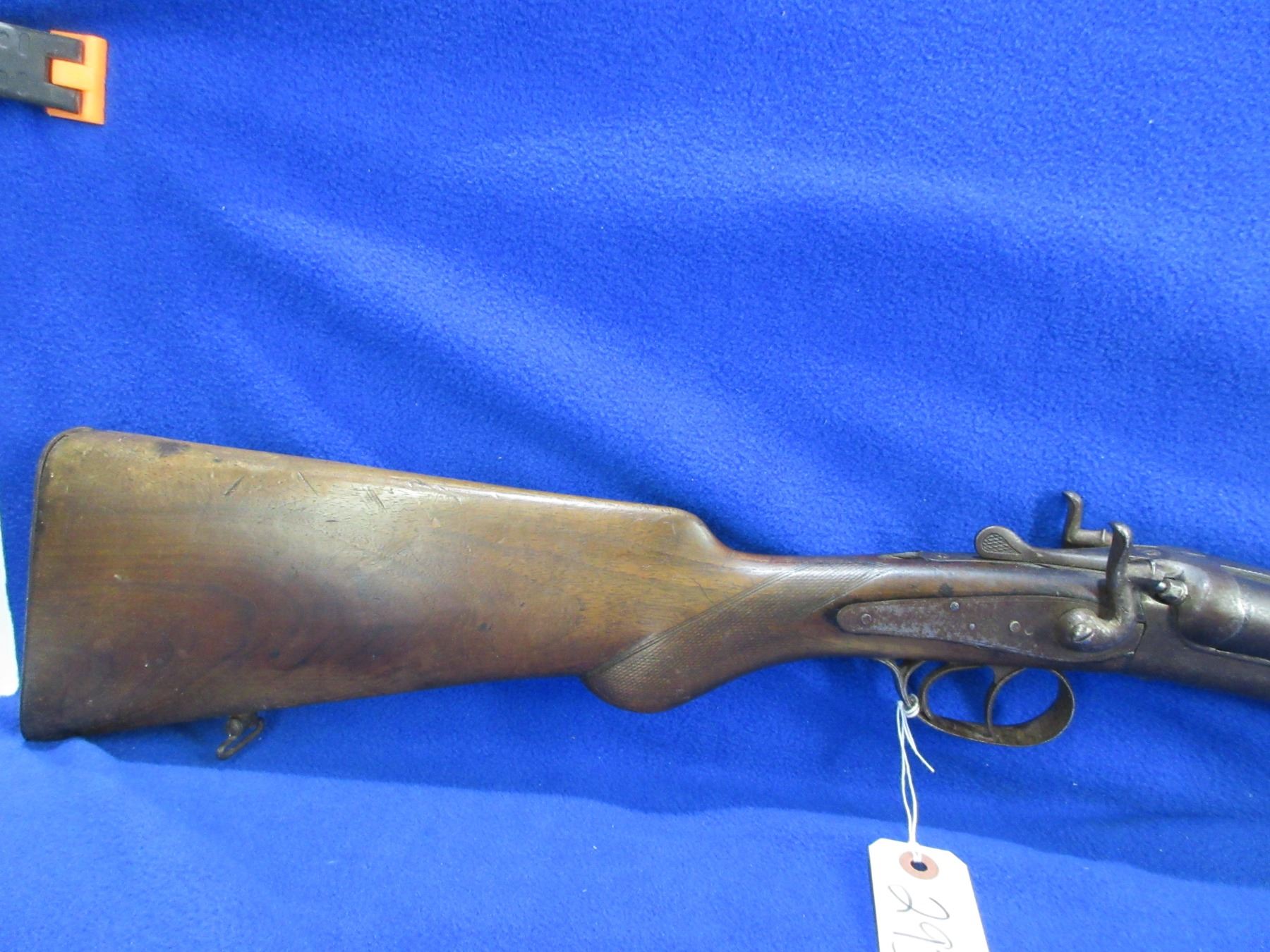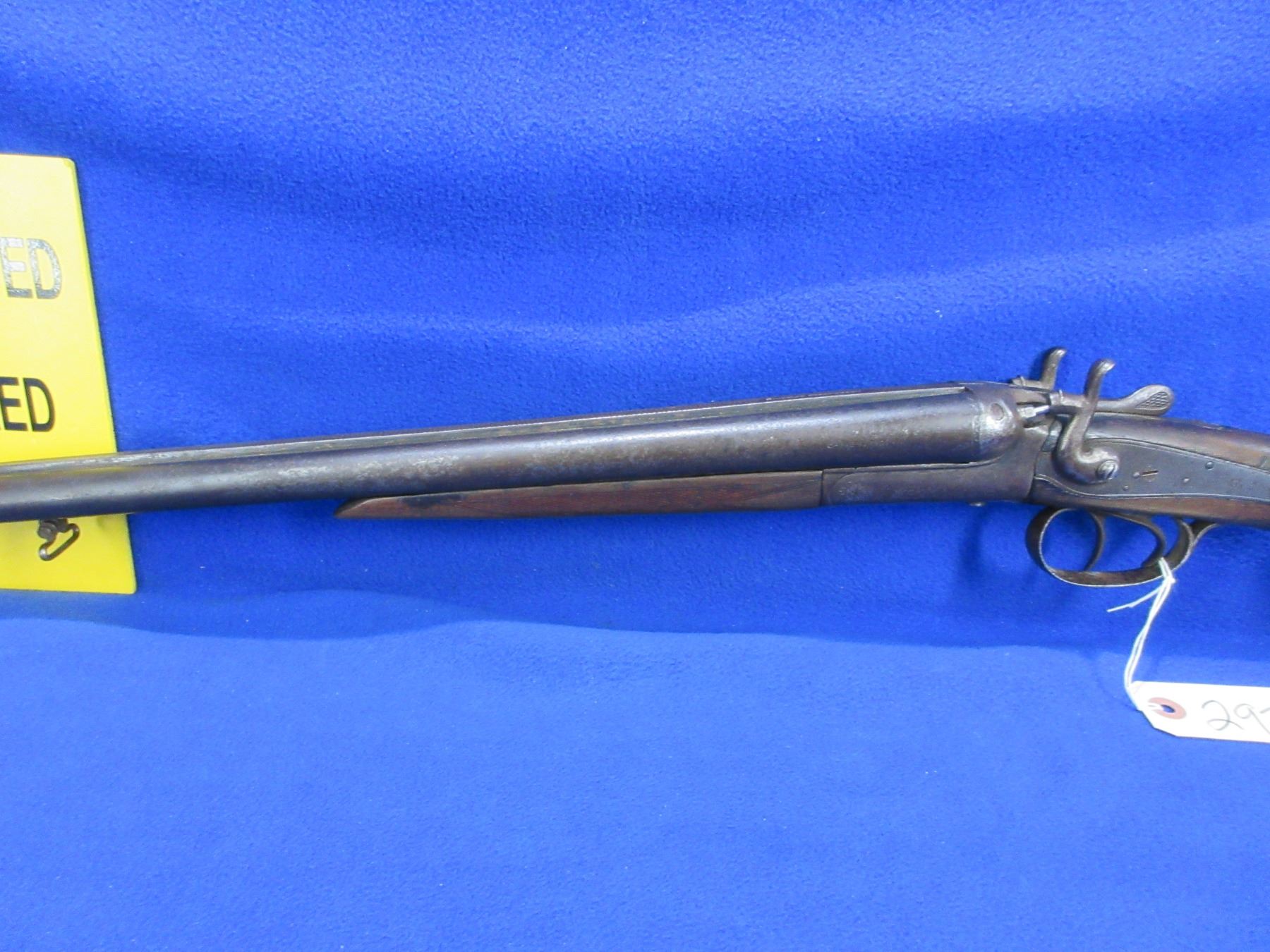 Non-Restricted - Belgian Rauchlos Beschossen SXS in 16Ga. 2 1/2" - This tip up hammer SXS shotgun appears to be in working order but action is loose and doesn't close properly, would make a great Wall Hanger. Barrels are 29 1/2", bores are good, bluing is gone and pitted, has bead front sight, stock is good with many usage marks, forearm has a crack at the back, metal butt plate. Ser # 15747