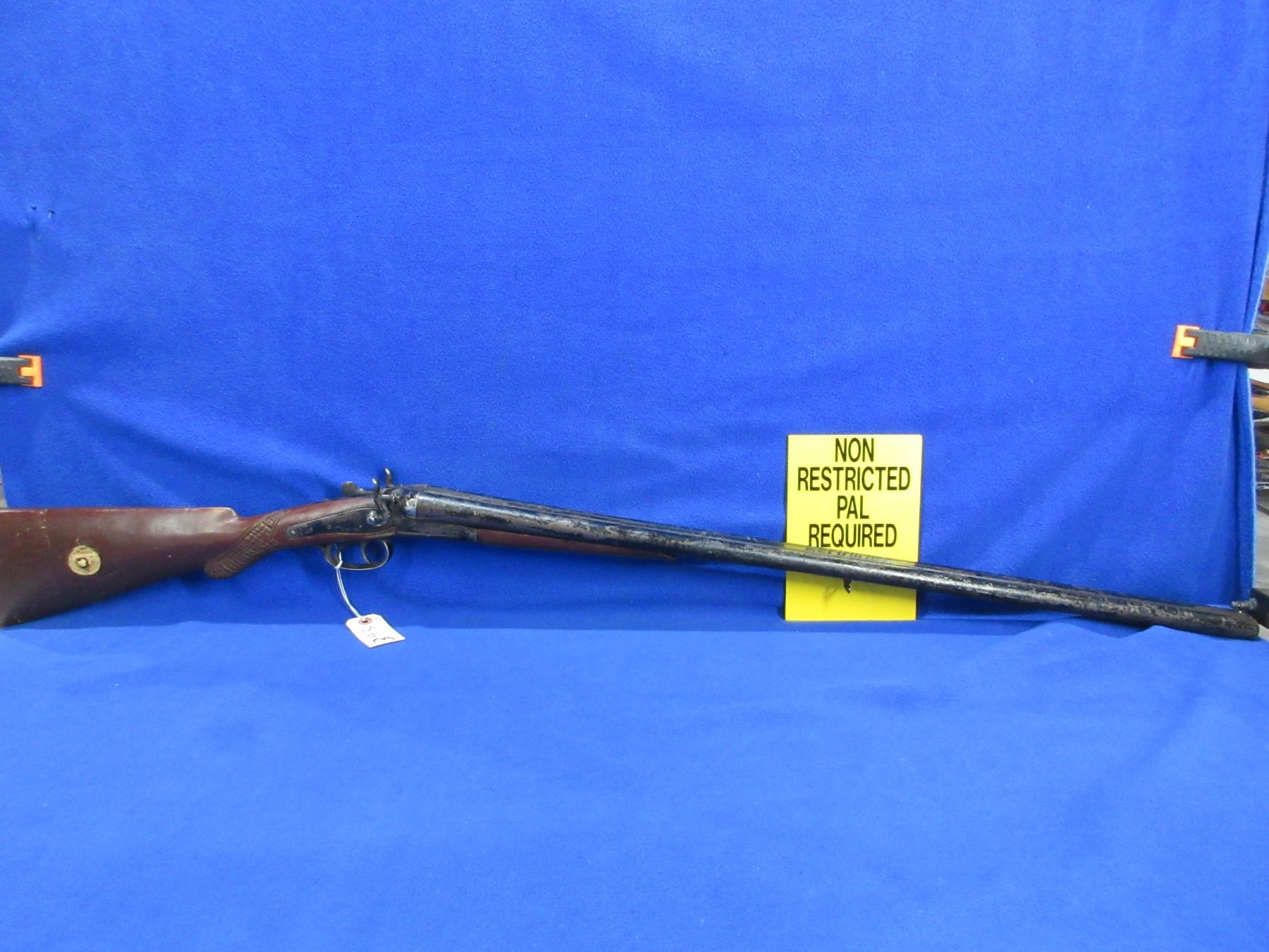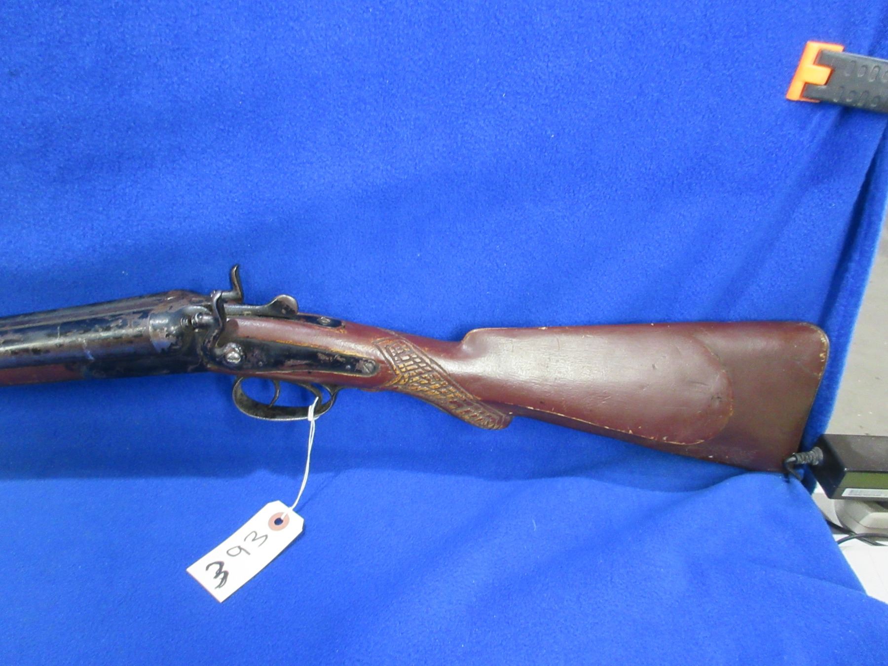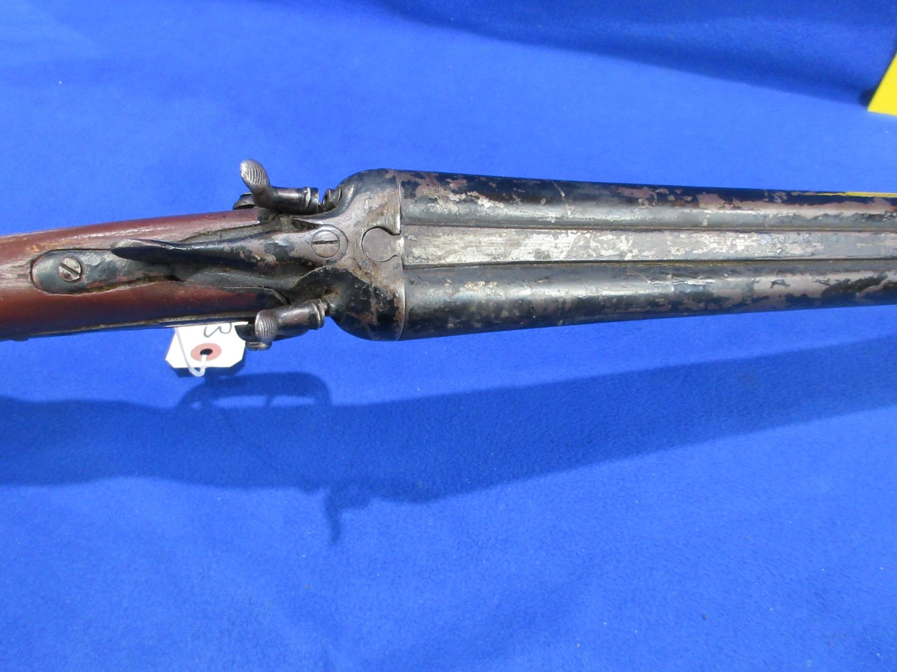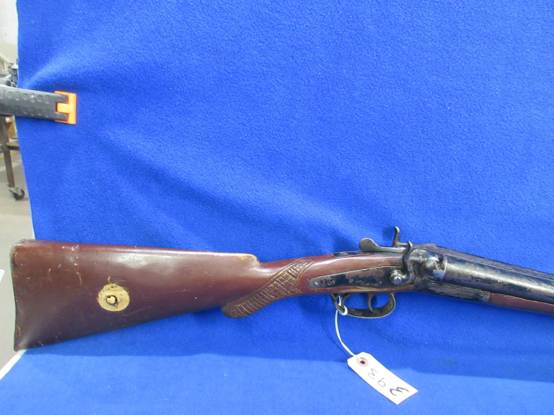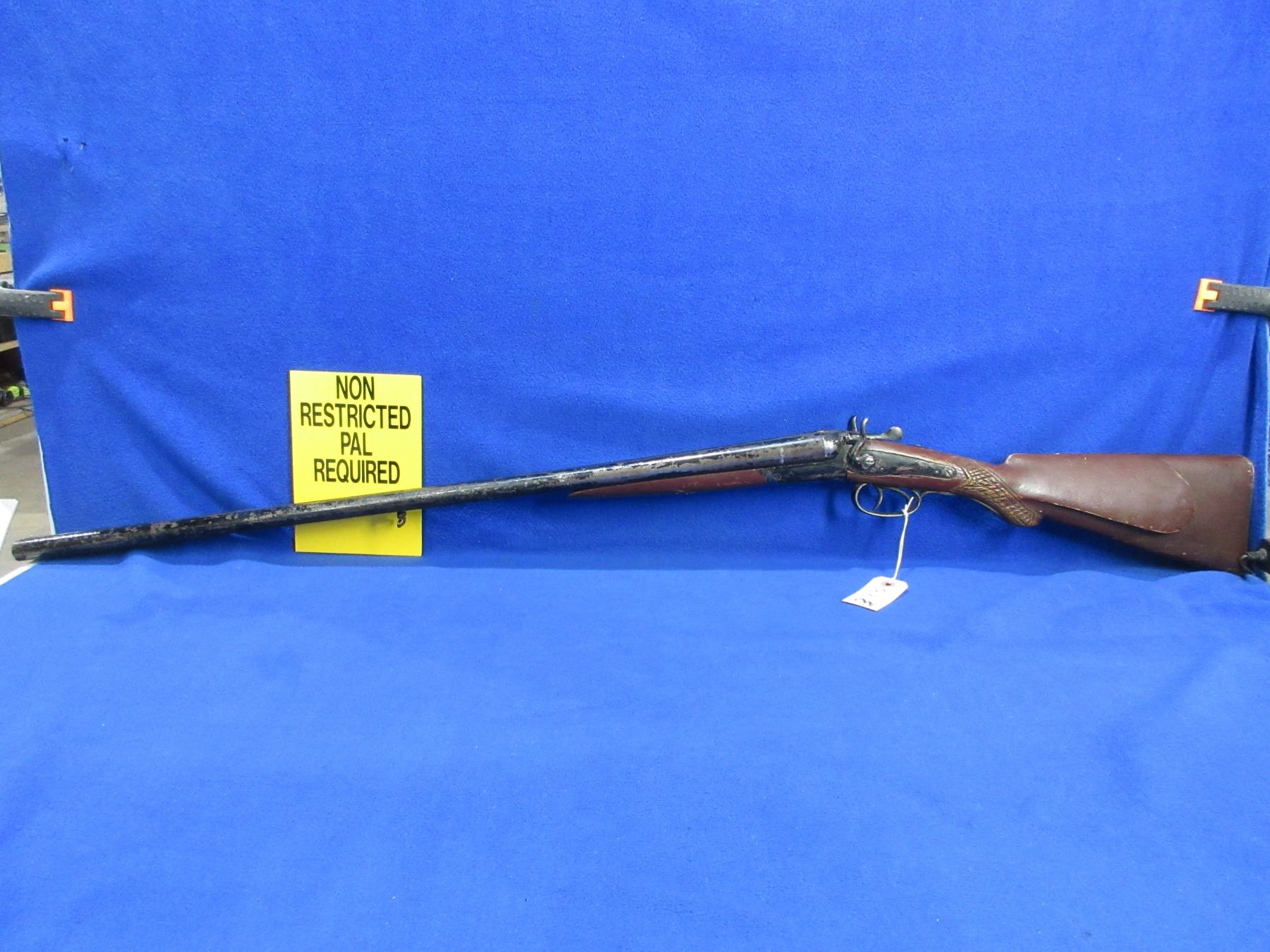 Non-Restricted - Belgian SXS hammer in 12Ga. - This tip up hammer SXS shotgun appears to be in working order but action is loose and should not be fired, would make a great Wall Hanger. Barrels are 31 1/2", bores are poor to fair, bluing is gone and been painted black, paint is peeling, has bead front sight, stock was painted and is poor with many usage marks, forearm is poor, metal butt plate. Ser # None