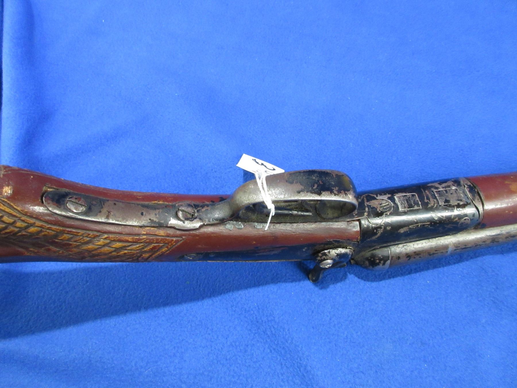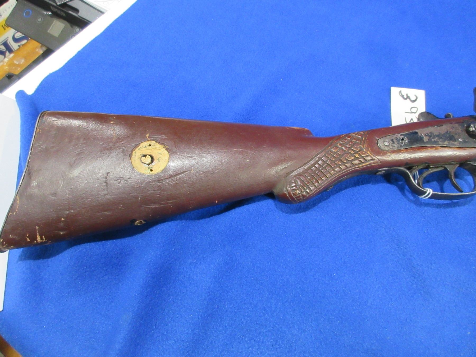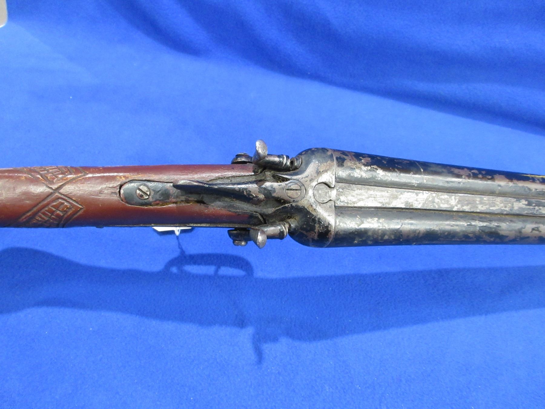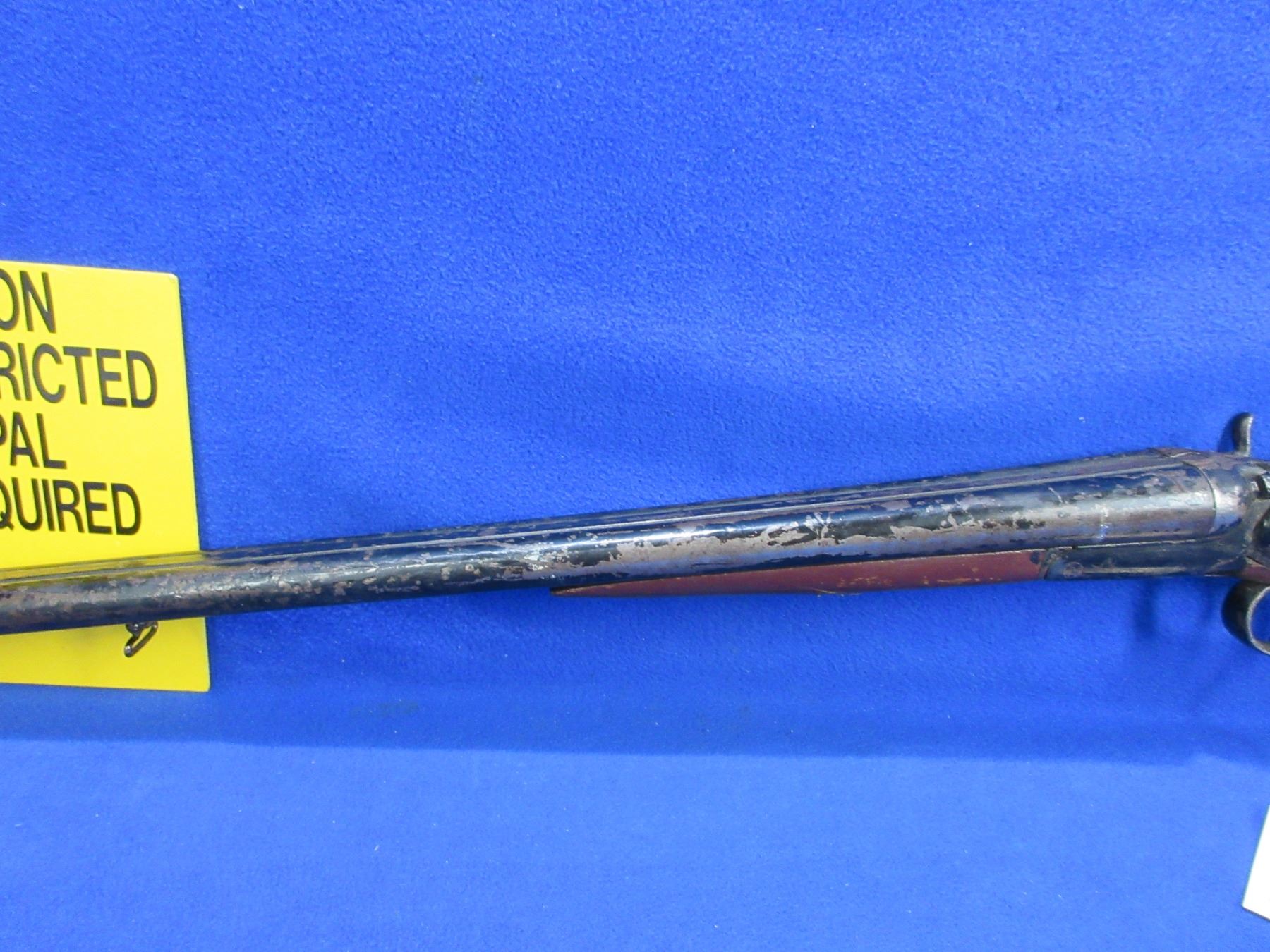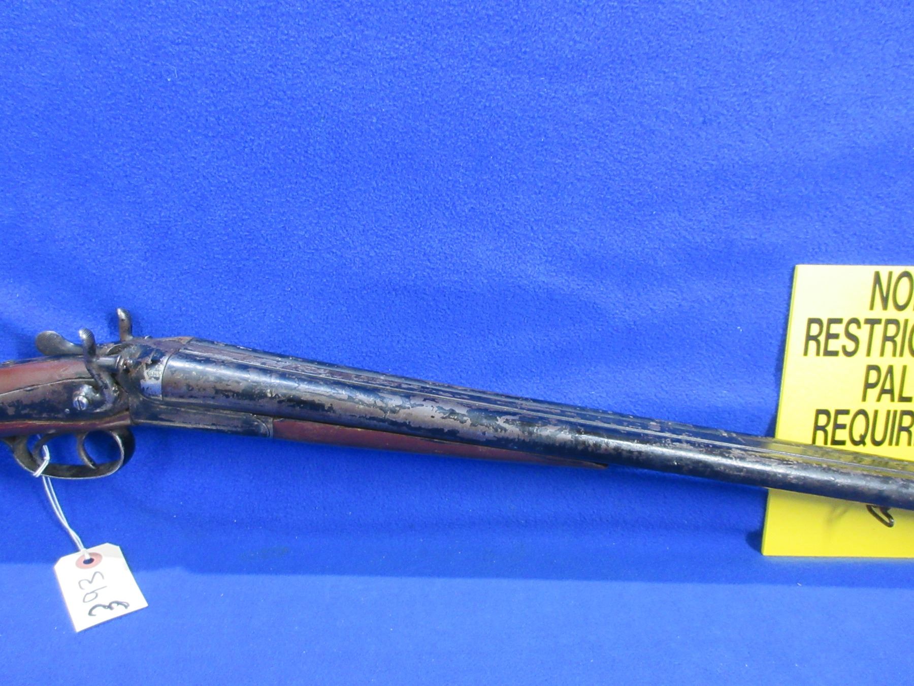 Non-Restricted - Belgian SXS hammer in 12Ga. - This tip up hammer SXS shotgun appears to be in working order but action is loose and should not be fired, would make a great Wall Hanger. Barrels are 31 1/2", bores are poor to fair, bluing is gone and been painted black, paint is peeling, has bead front sight, stock was painted and is poor with many usage marks, forearm is poor, metal butt plate. Ser # None