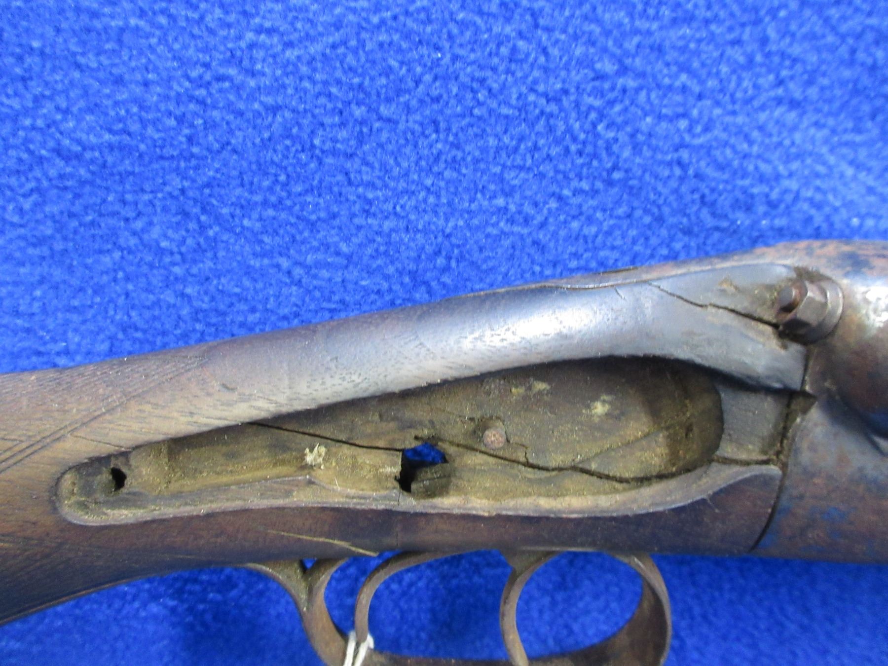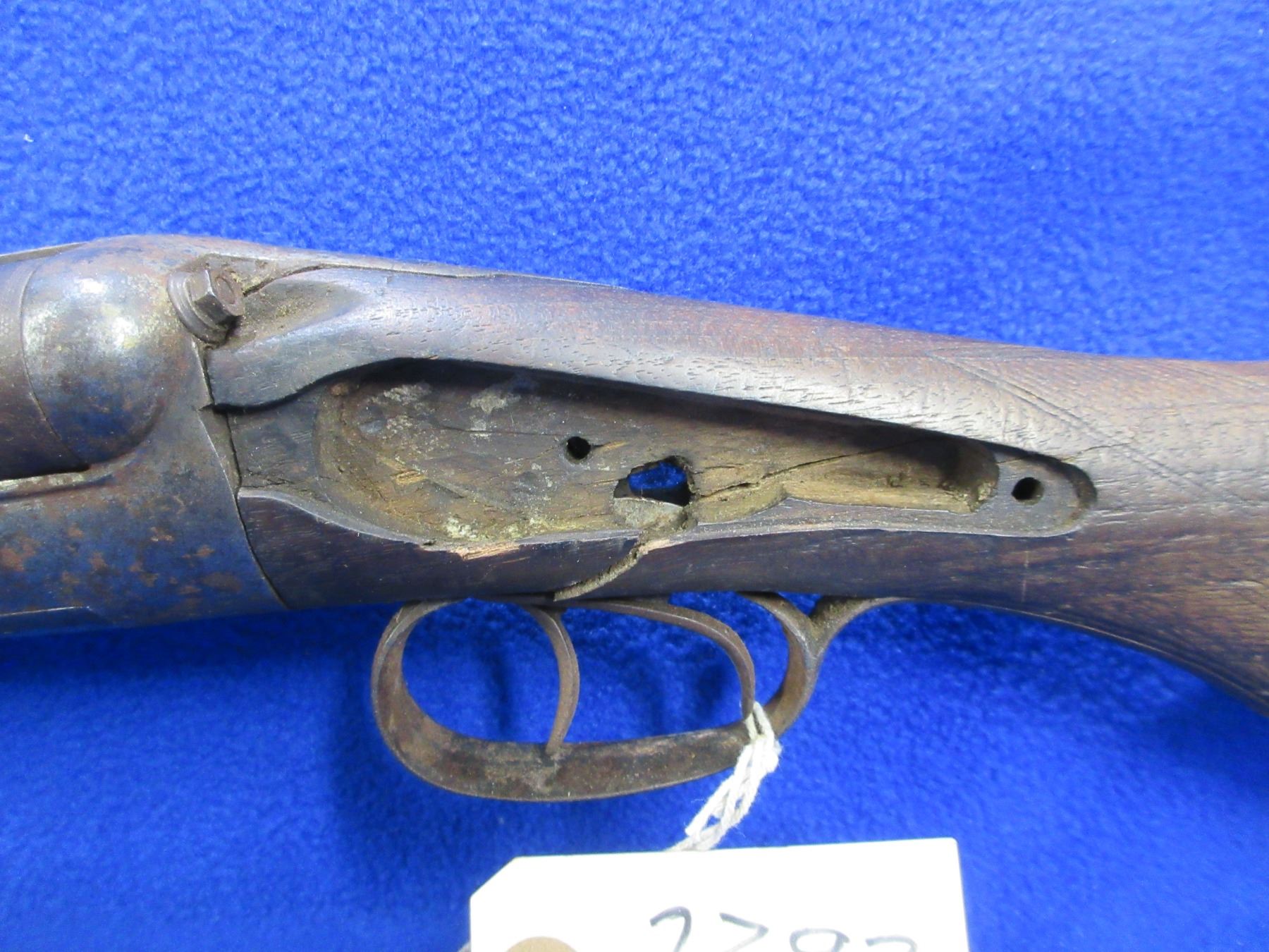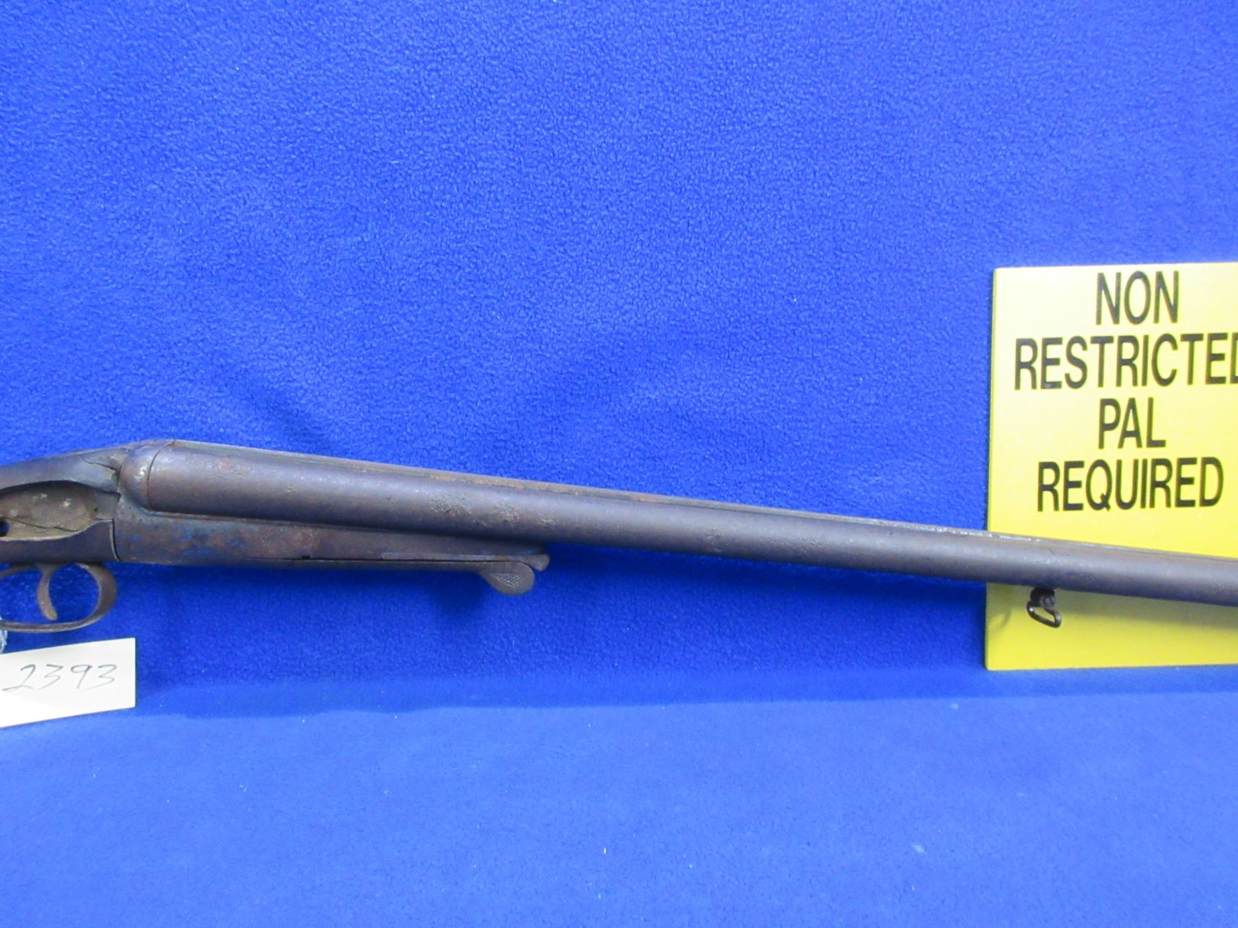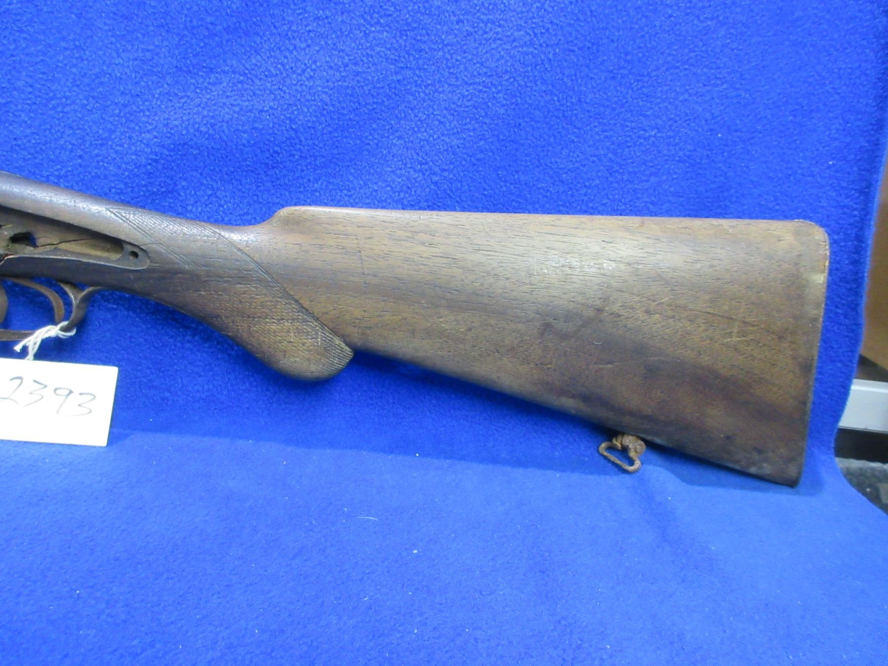 Non-Restricted - Belgian SXS Parts Gun in 16 Ga. 2 1/2" - This is an under lever tip up SXS hammer (hammers and locks missing) parts shotgun, action is tight but is in non working order. Barrels are 30", bores are poor to fair, bluing is pitted, has bead front sight, stock is broken, length of pull is 14 1/2", metal butt plate poor. Comes with swivels. Ser # 46804