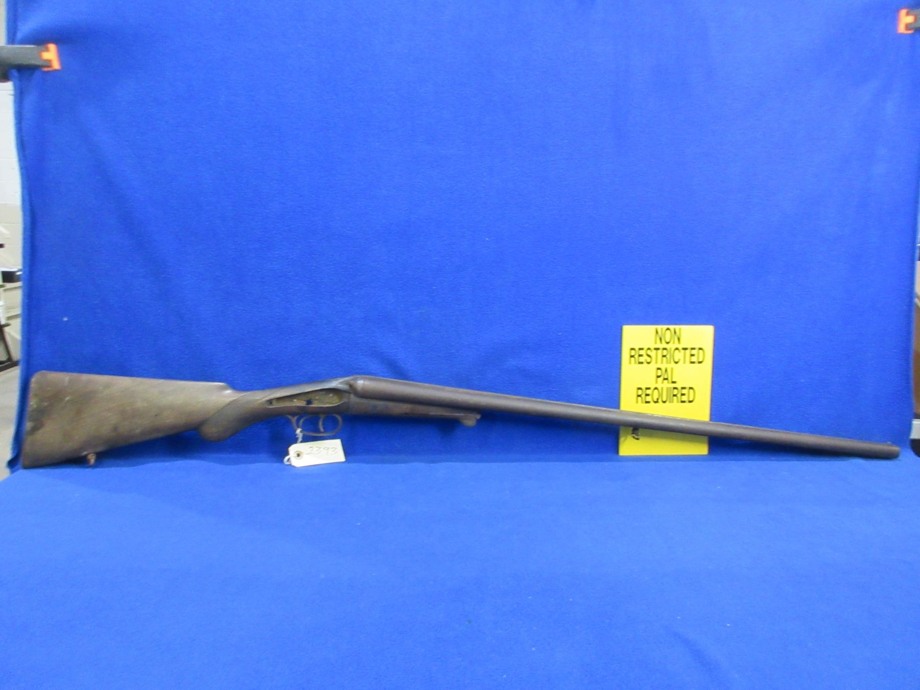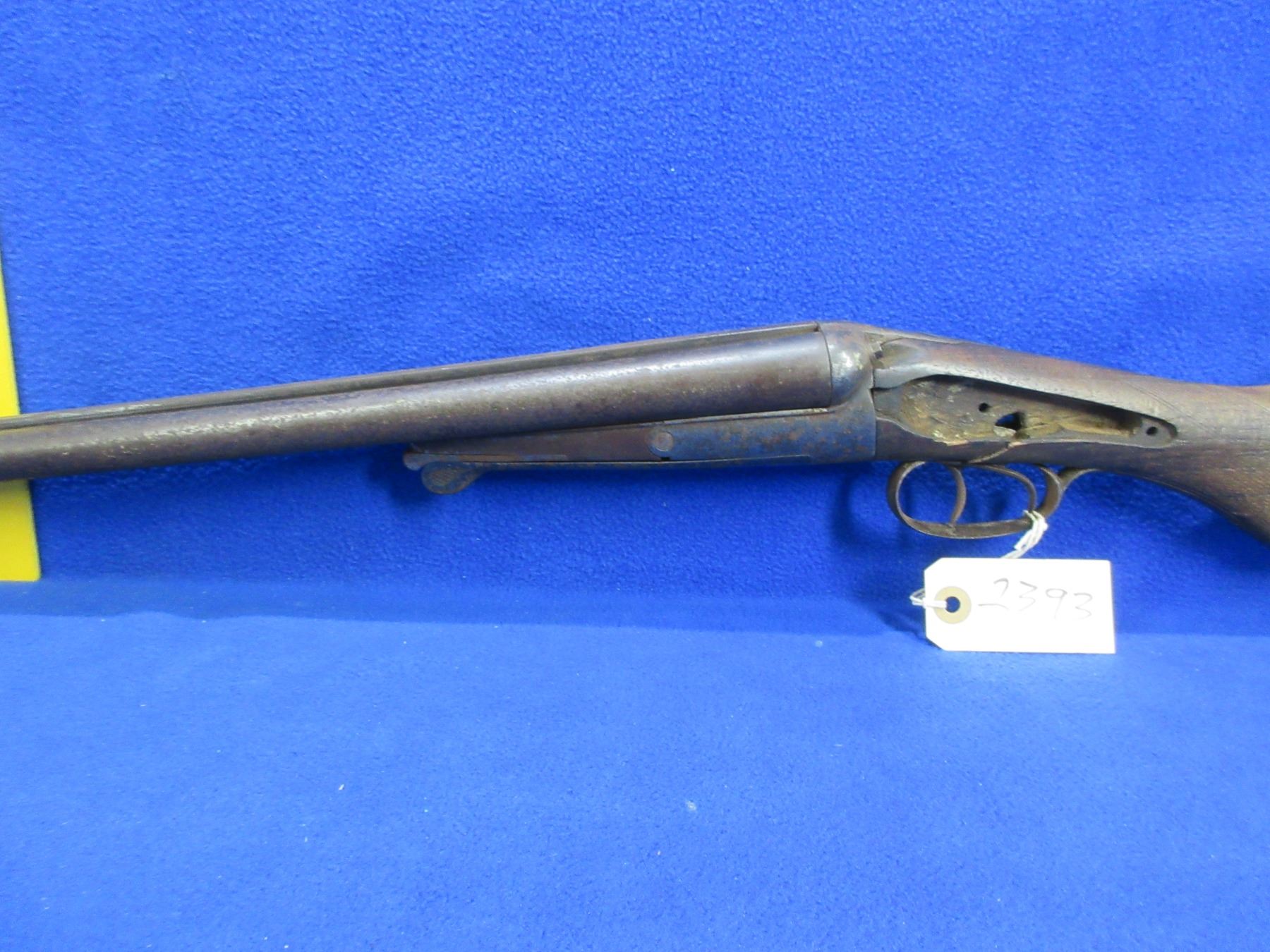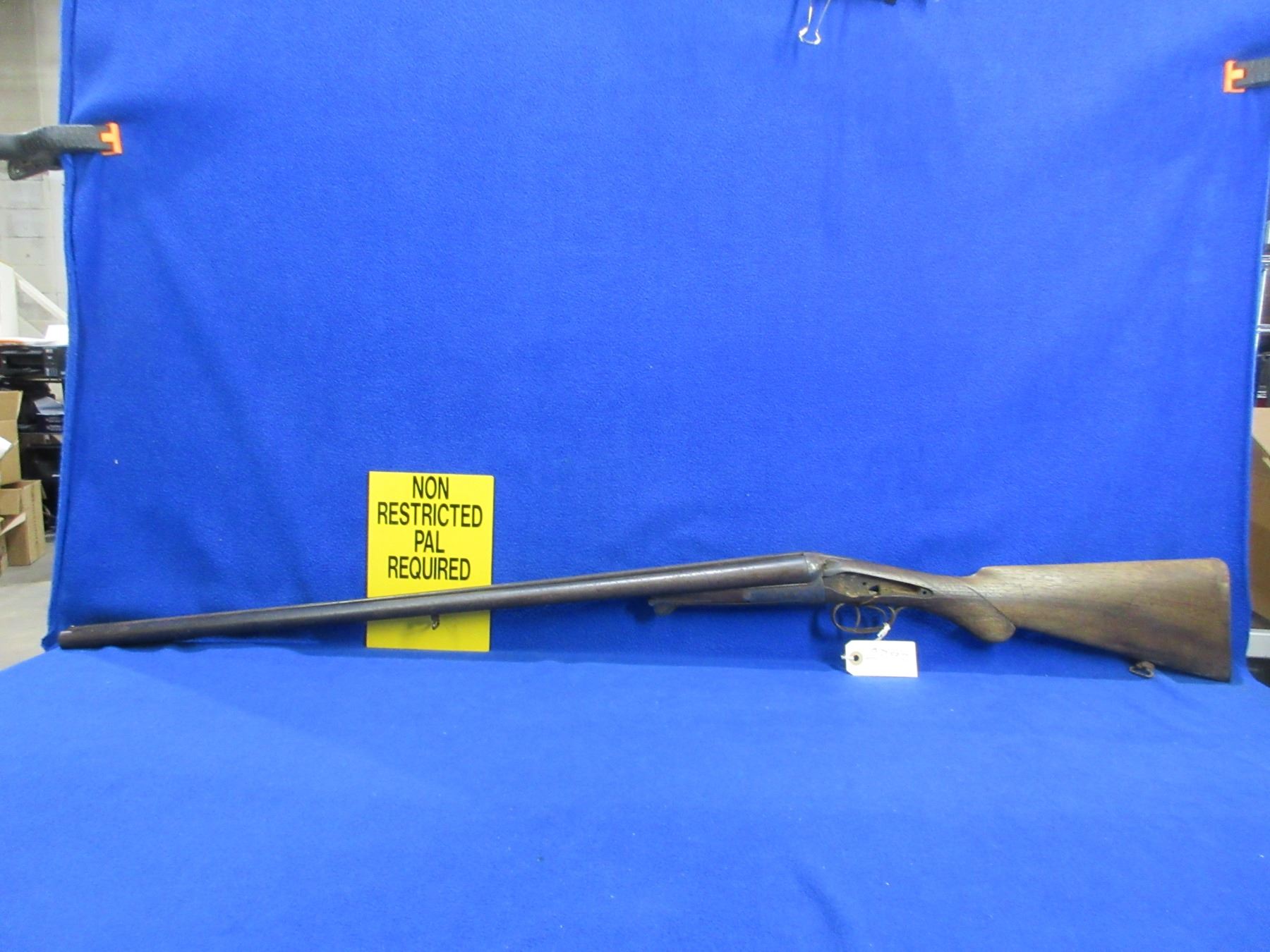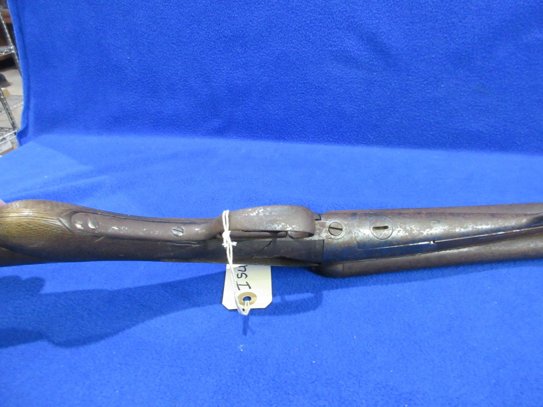 Non-Restricted - Belgian SXS Parts Gun in 16 Ga. 2 1/2" - This is an under lever tip up SXS hammer (hammers and locks missing) parts shotgun, action is tight but is in non working order. Barrels are 30", bores are poor to fair, bluing is pitted, has bead front sight, stock is broken, length of pull is 14 1/2", metal butt plate poor. Comes with swivels. Ser # 46804