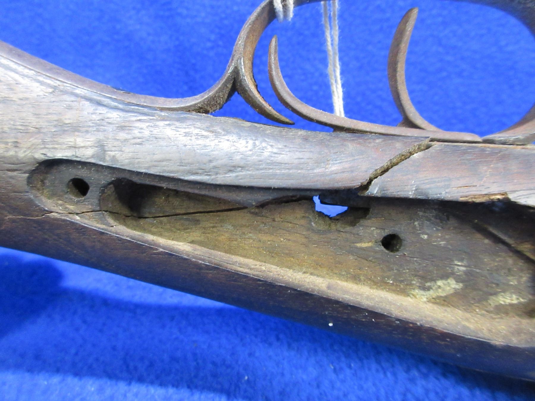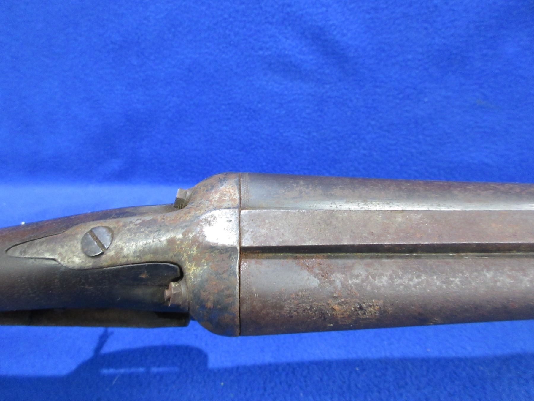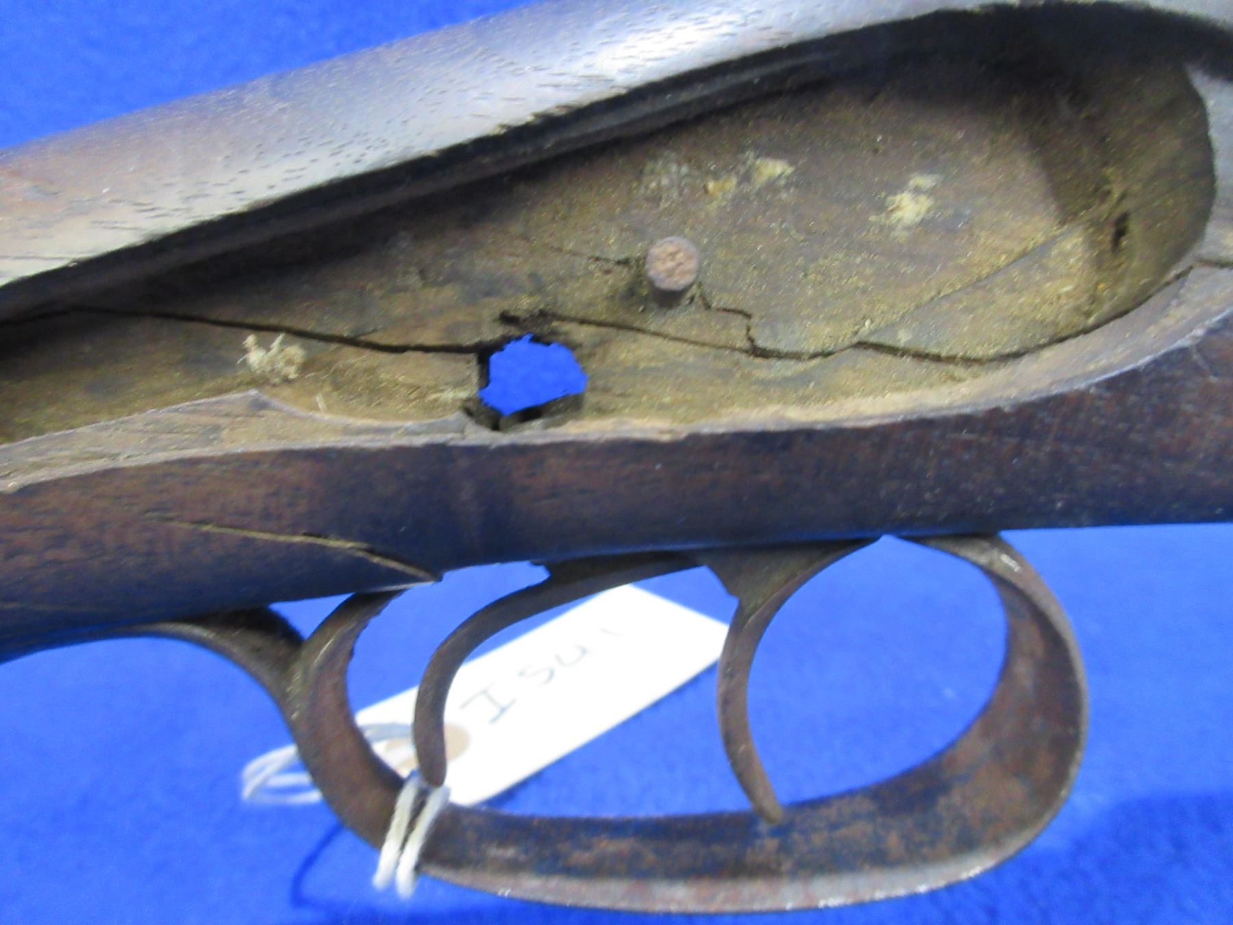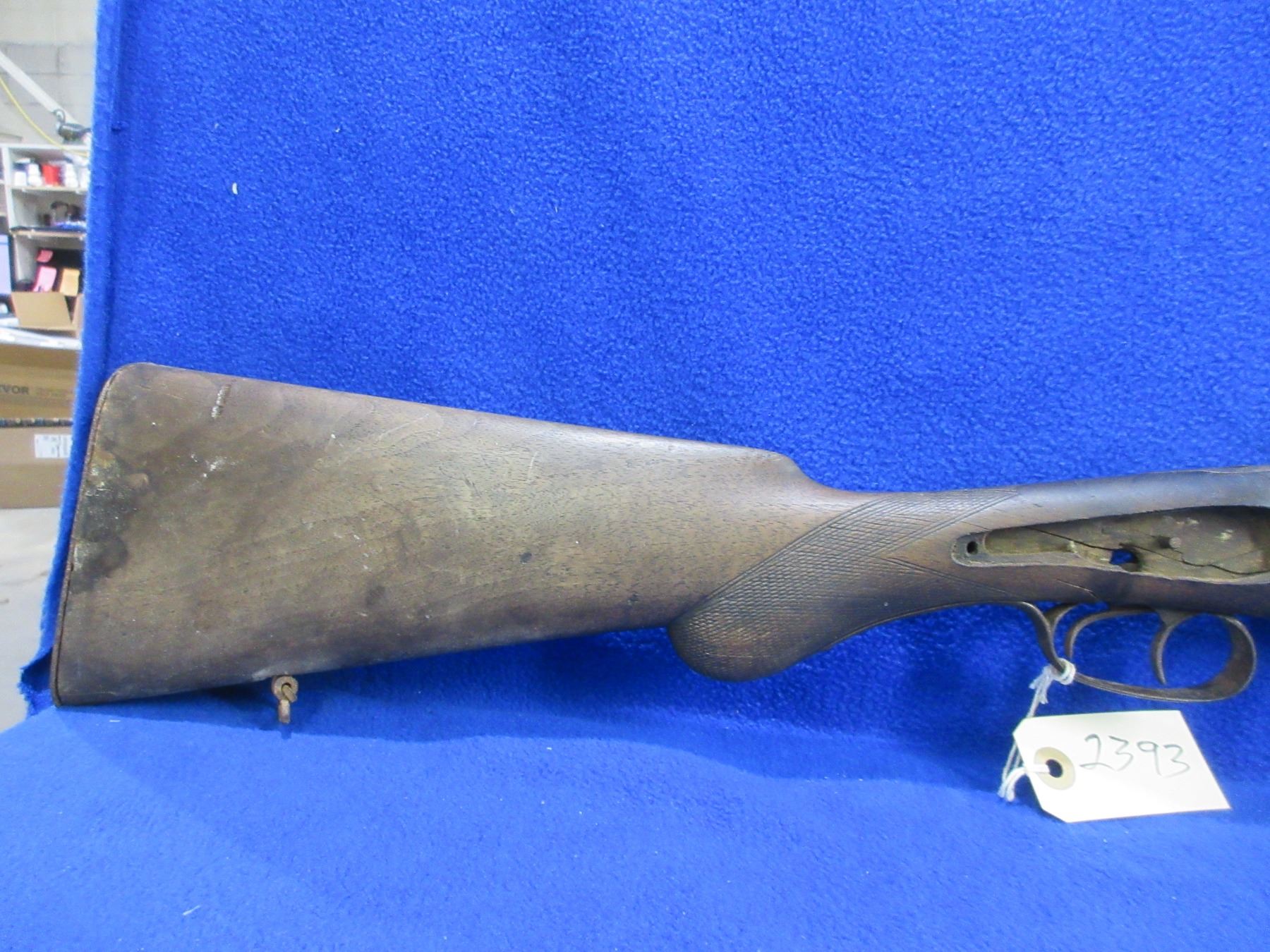 Non-Restricted - Belgian SXS Parts Gun in 16 Ga. 2 1/2" - This is an under lever tip up SXS hammer (hammers and locks missing) parts shotgun, action is tight but is in non working order. Barrels are 30", bores are poor to fair, bluing is pitted, has bead front sight, stock is broken, length of pull is 14 1/2", metal butt plate poor. Comes with swivels. Ser # 46804