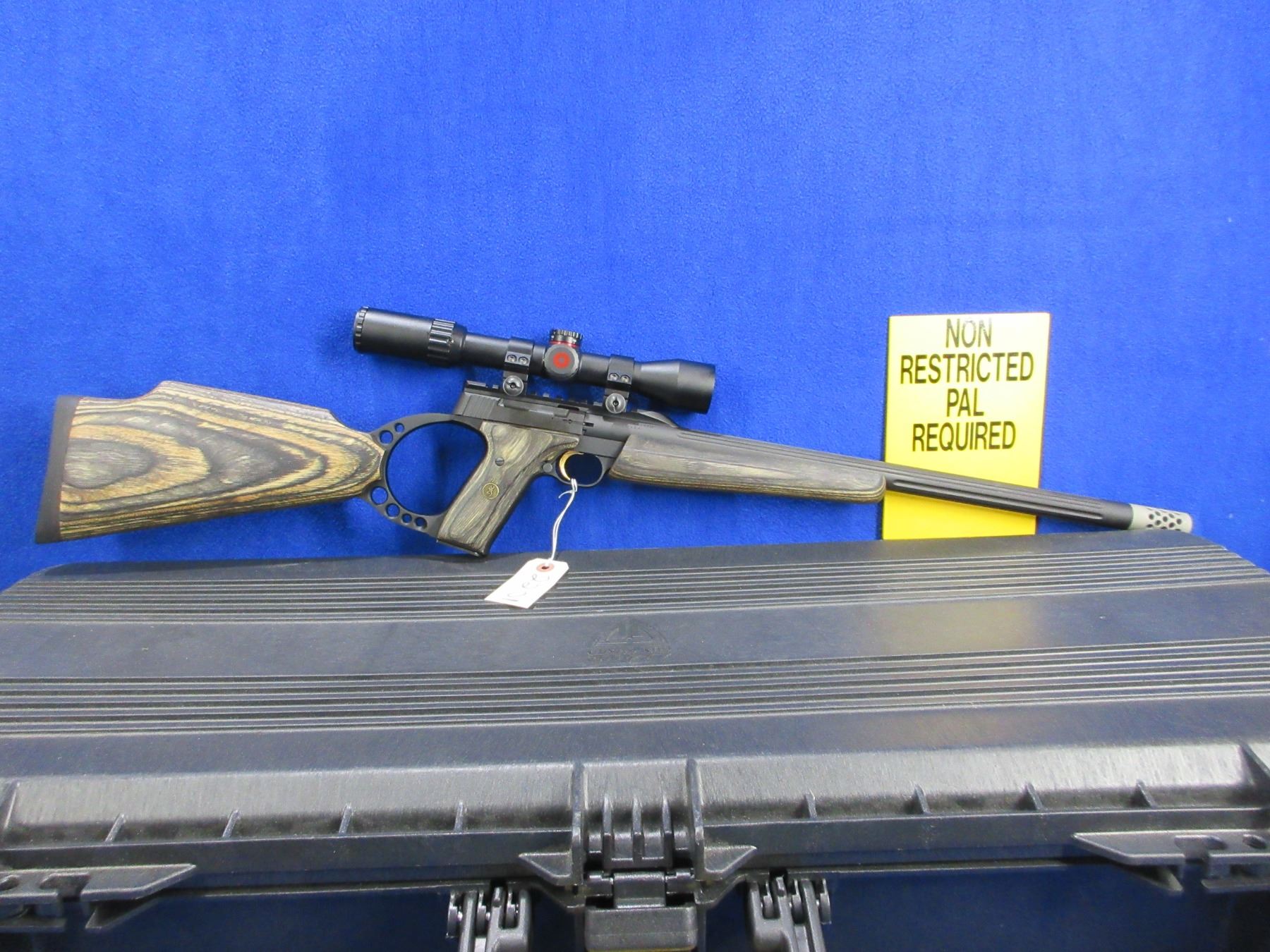 Non-Restricted - Browning Buck Mark in 22 LR - This semi-auto rifle with removable magazine (2021 Shot Show Special) appears to be in very good working order. Tapered sporter barrel is 18", rifling is very good, black finish is very good, has no sights but has Simmons 2-7x32 scope -duplex reticle - appears clear, laminated stock is very good, rubber pad good. Comes with lens caps, flash suppressor, Plano Gunguard waterproof case. Ser # BRUS01533ZN213