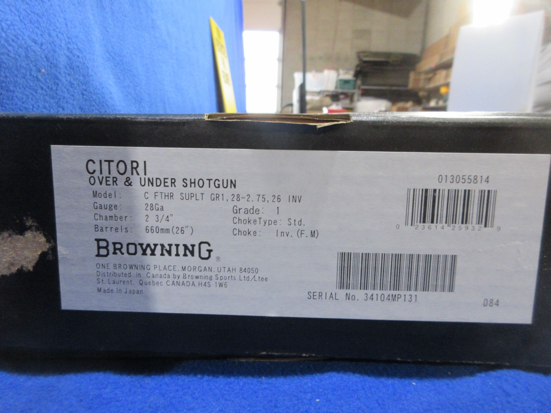 Non-Restricted - Browning Citori Grade 1 in 28 Ga. 2 3/4" - This is a beautiful over/under shotgun with removable chokes, nicely engraved action is tight and appears to be in very good working order. Vent rib barrels are 26", bores are very good, bluing is very good, has bead front sight, stock is very good, forearm is very good with 1 small mark, length of pull is 14 1/4", butt plate very good. Comes with original box, manual, 1 extra choke and choke wrench. Ser # 34104MP131