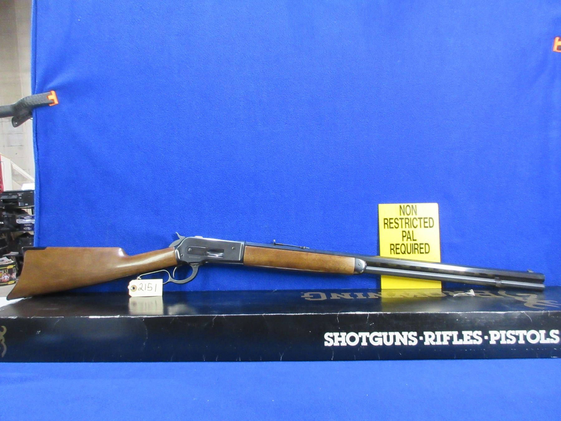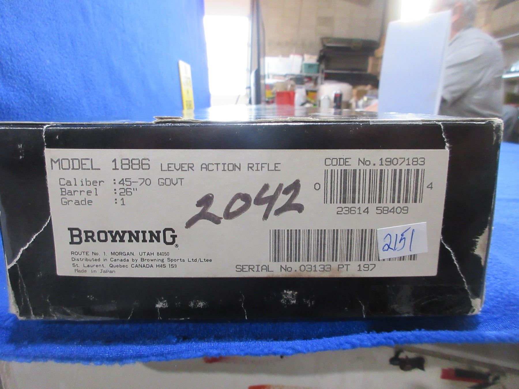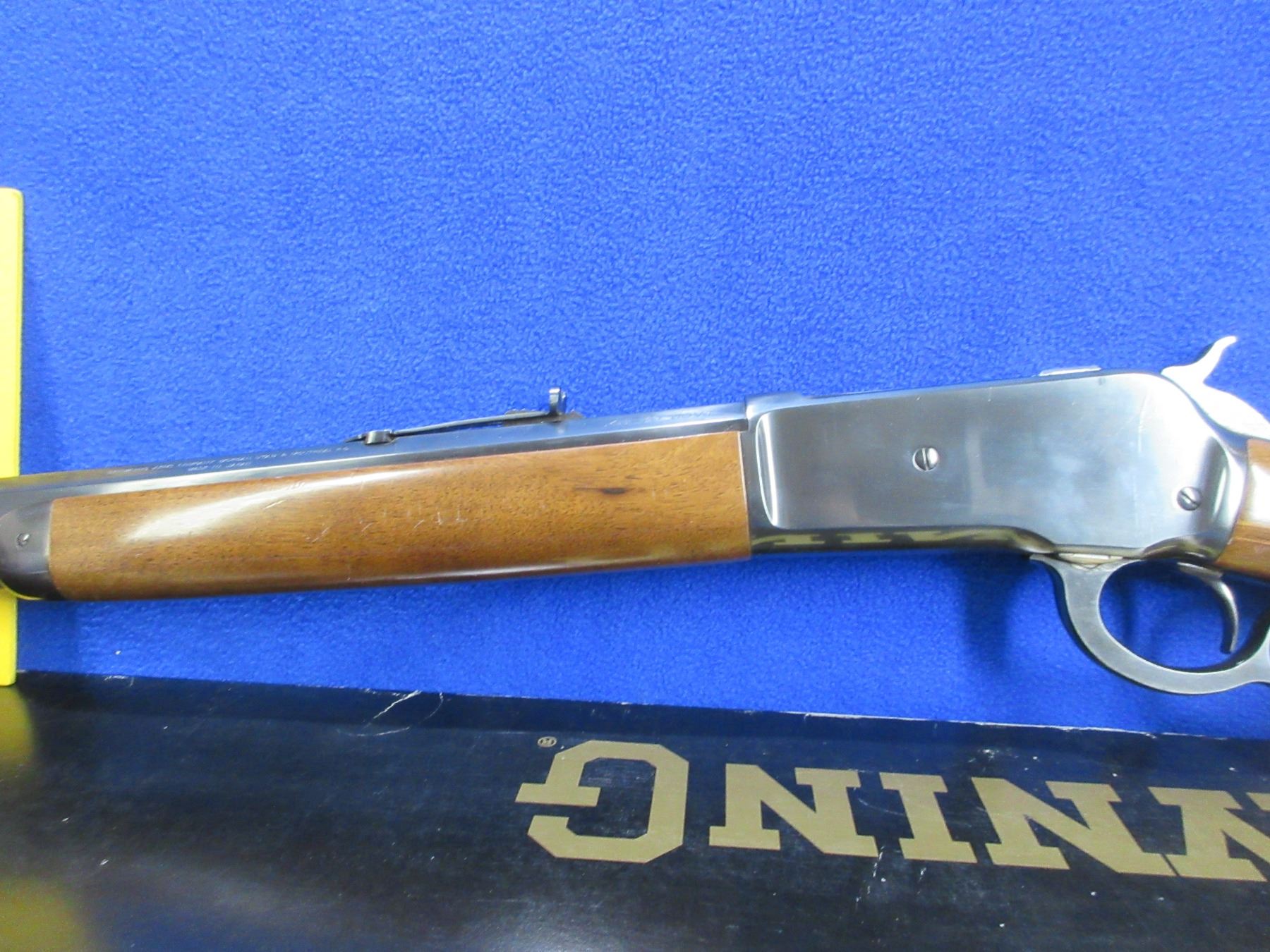 Non-Restricted - Browning Model 1886 in 45-70 GOVT - Made in 1986, this is a lever action rifle with tube magazine, action appears to be in very good working order. Barrel is 26", rifling is very good, bluing is good to very good, has both sights, stock and forearm are good to very good with handling marks, length of pull is 13", crescent metal plate very good. Comes in original box, but is missing paperwork. Ser # 03133PT197