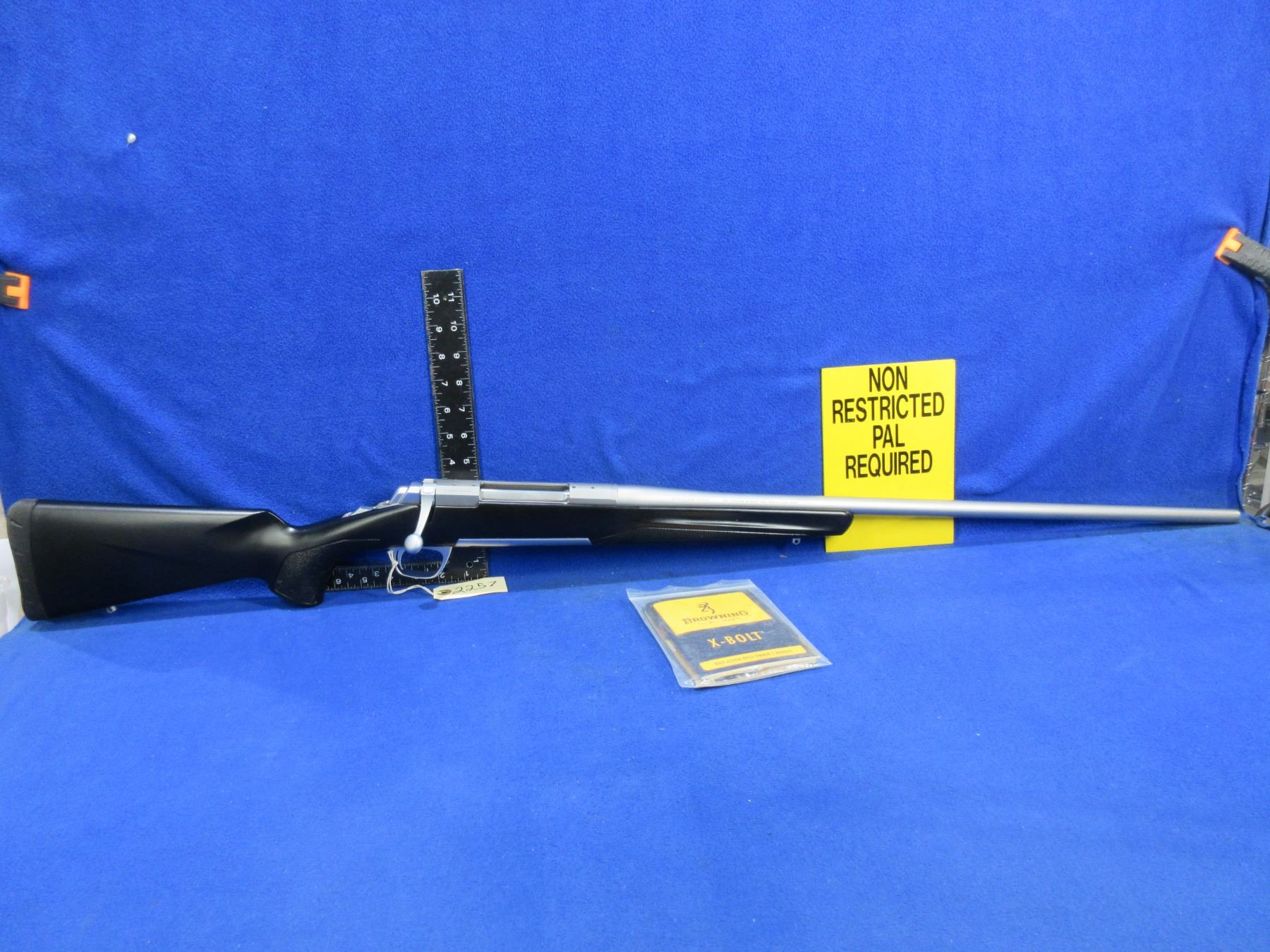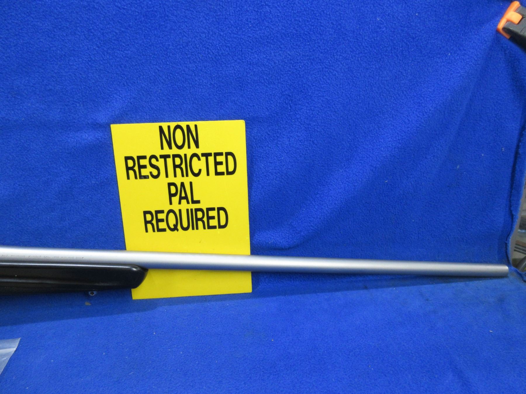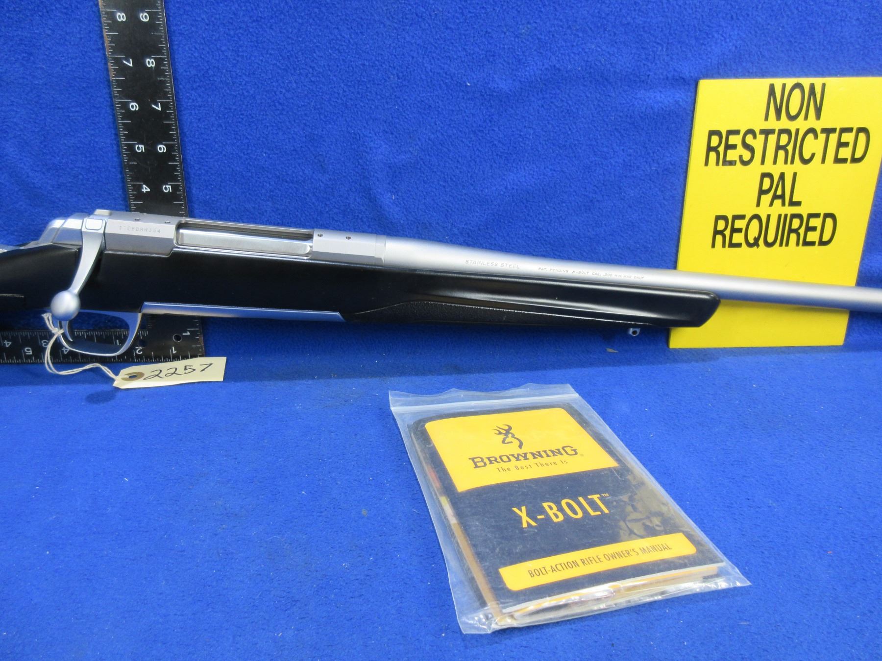Non-Restricted - Browning X-Bolt in 300 Win Mag - This bolt action rifle with removable magazine appears to be in very good working order. Stainless barrel is 26", rifling is good to very good, stainless finish is good to very good, has both sights, stock is new as replaced by Browning because of Dura-Kote, rubber recoil pad new, comes with swivel studs. Ser # 11060MN354