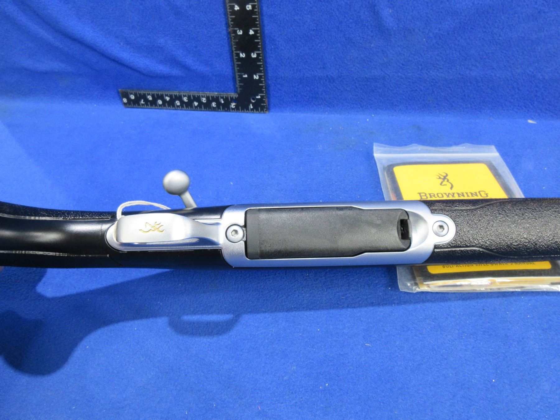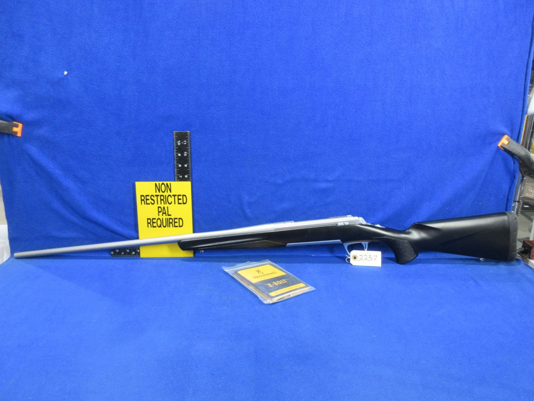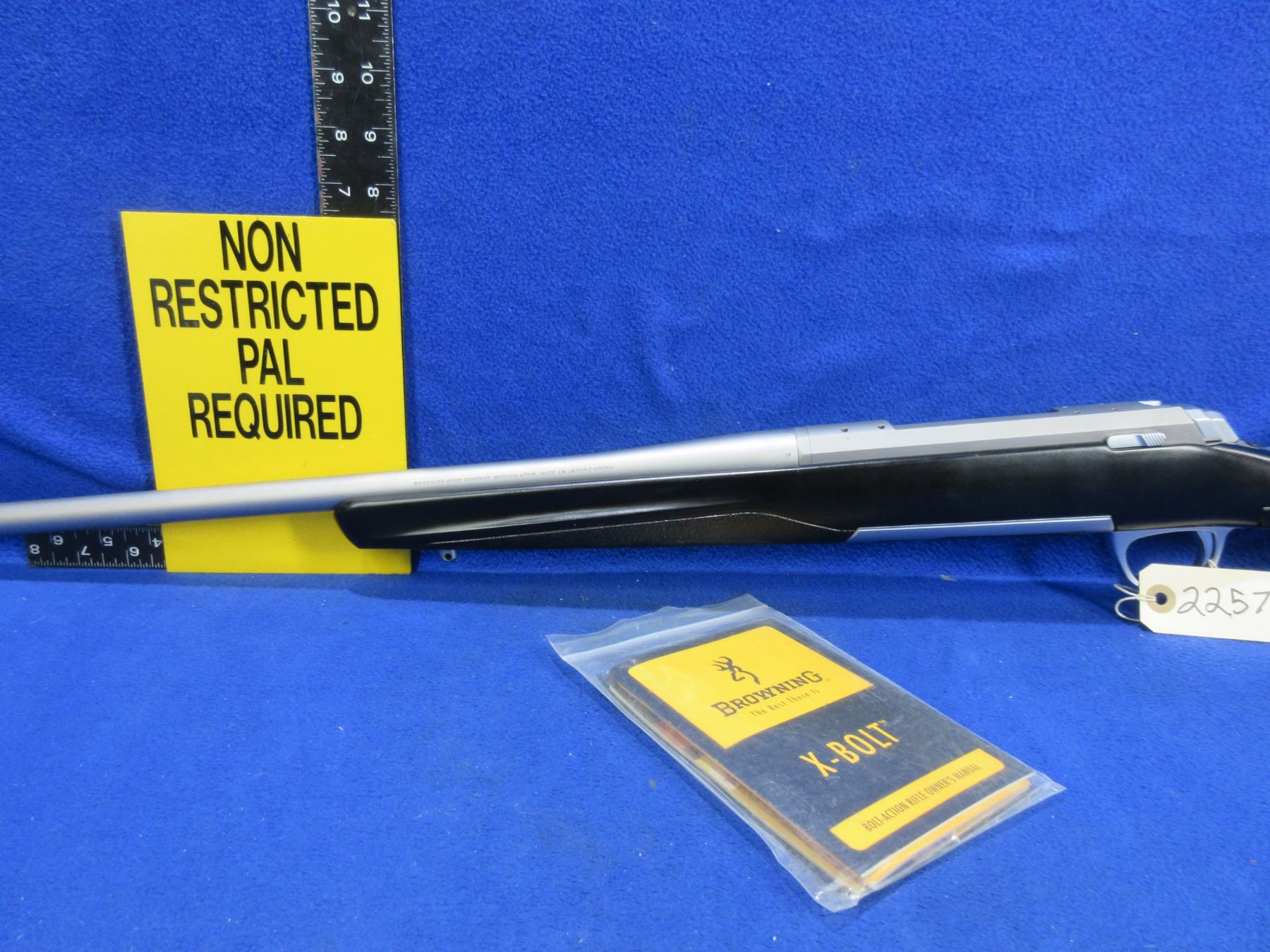 Non-Restricted - Browning X-Bolt in 300 Win Mag - This bolt action rifle with removable magazine appears to be in very good working order. Stainless barrel is 26", rifling is good to very good, stainless finish is good to very good, has both sights, stock is new as replaced by Browning because of Dura-Kote, rubber recoil pad new, comes with swivel studs. Ser # 11060MN354