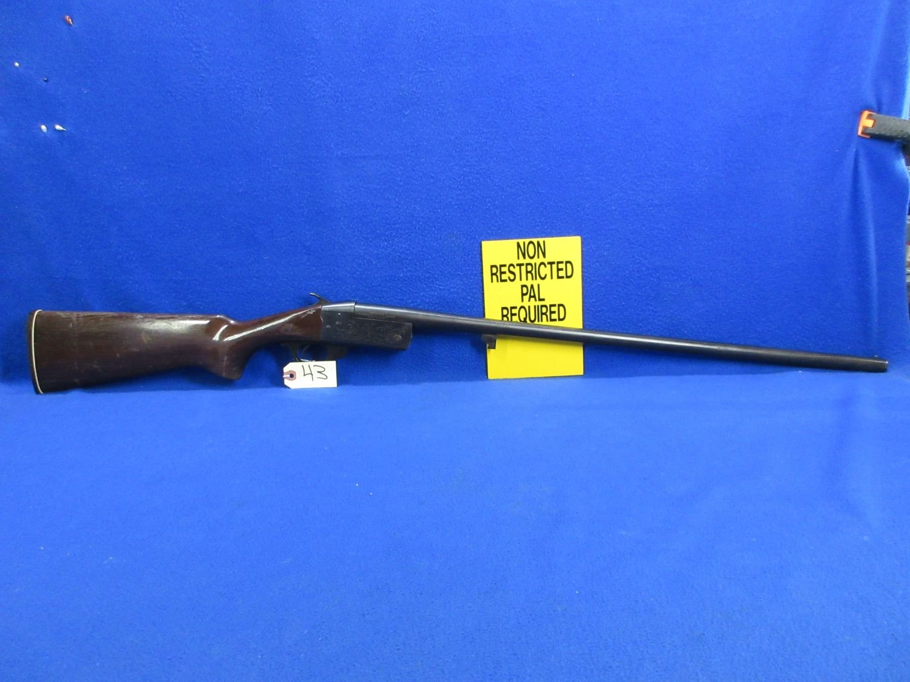 Non-Restricted - CIL Model 402 in 20 Ga. 2 3/4" Full - This tip up single shot shotgun appears to be in good to very good working order, action is tight. Barrel is 28", bore is good to very good, bluing is good with some light pitting, has bead front sight, stock is good with many usage marks, trigger guard has a crack near the rear screw, forearm is missing, butt plate appears incorrect and is oversize. Ser # 4112
