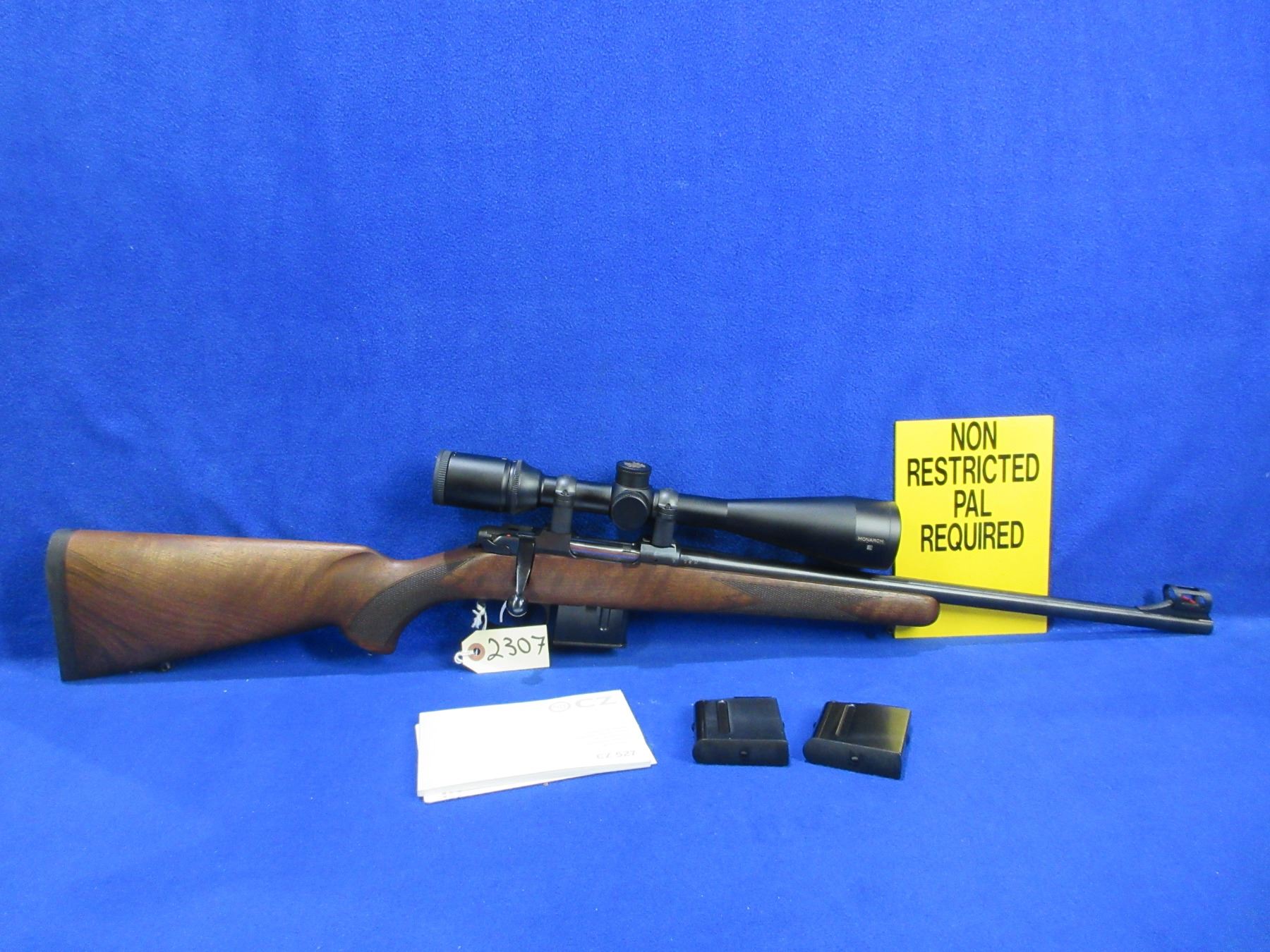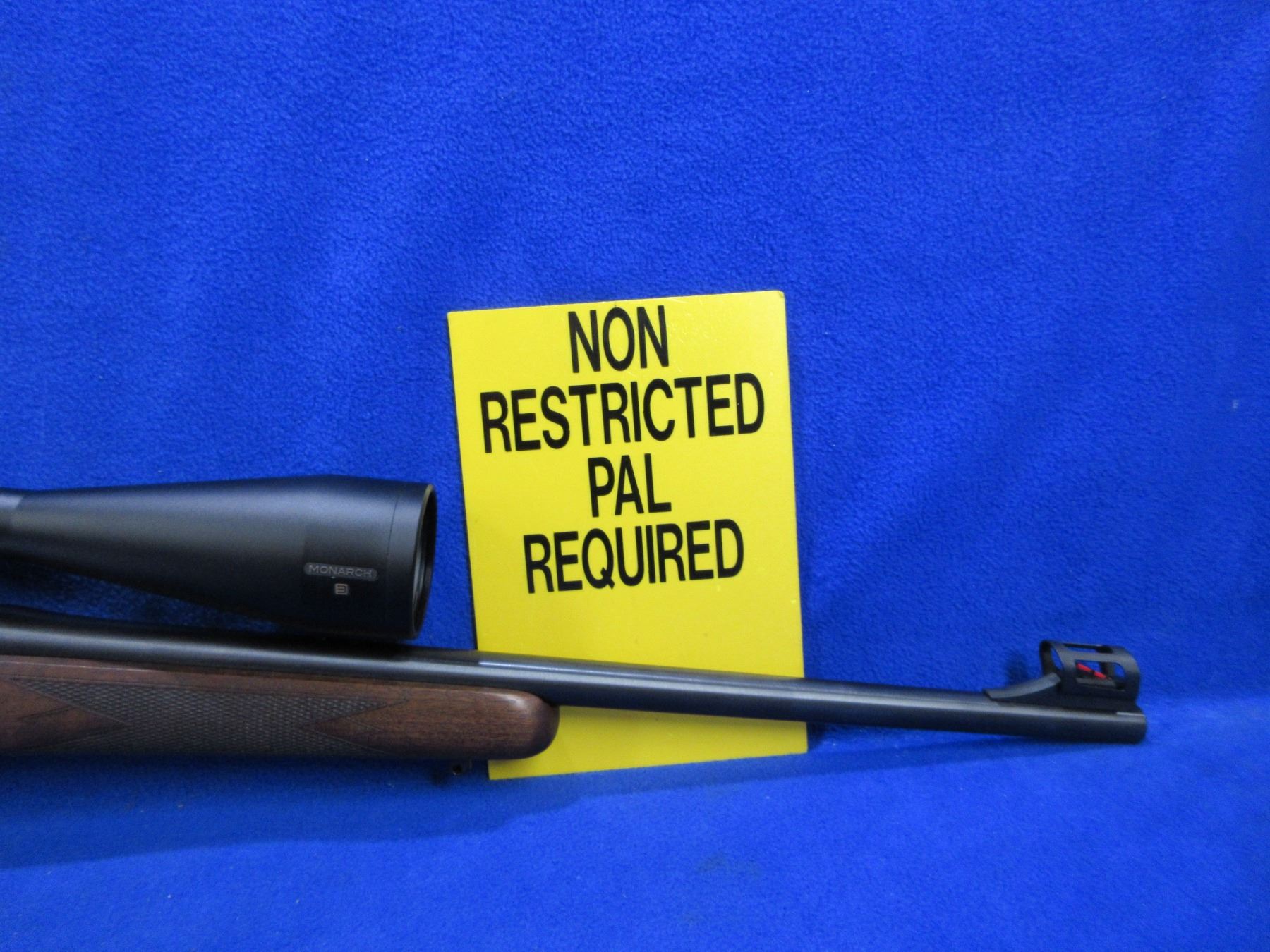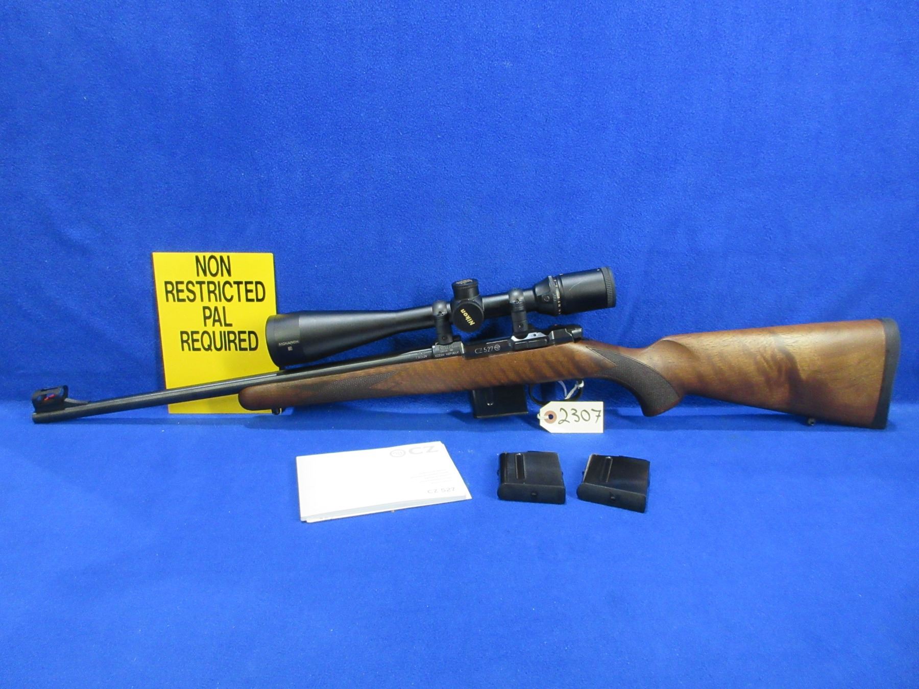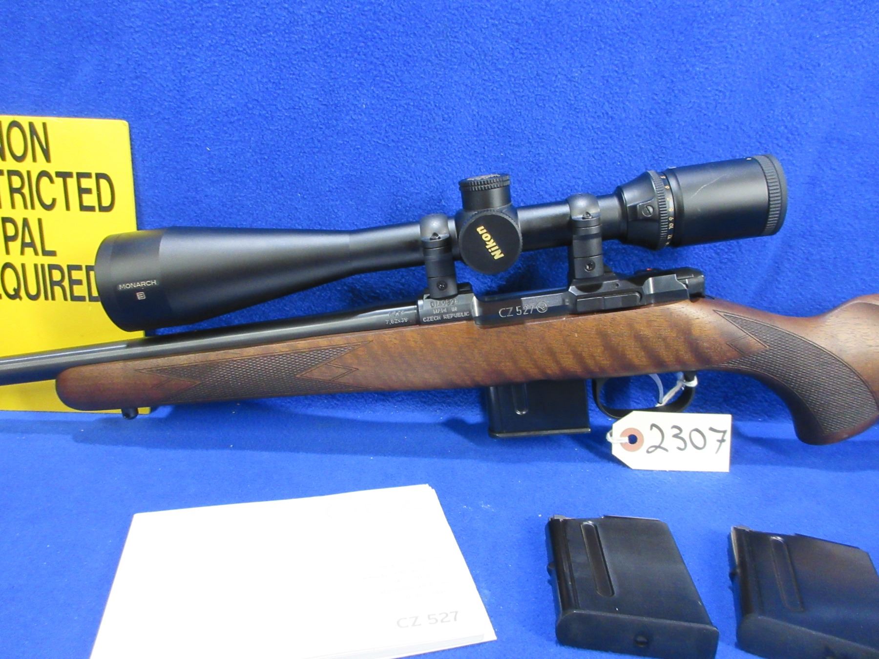 Non-Restricted - CZ Model 527 in 7.62x39 - This bolt action rifle with removable magazine appears to be in very good working order. Barrel is 18 1/2", rifling is very good, bluing is very good, has fiber optic front sight, missing rear sight but has a Nikon Monarch 4-16x50 scope - appears clear, duplex reticle, stock is very good, butt plate very good, comes with swivel studs, three magazines and owner's manual. Ser #D149328