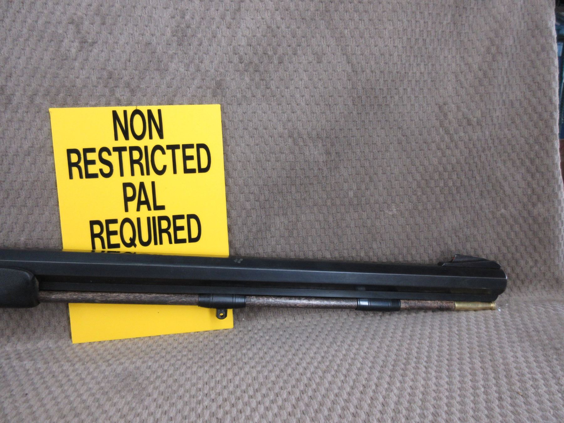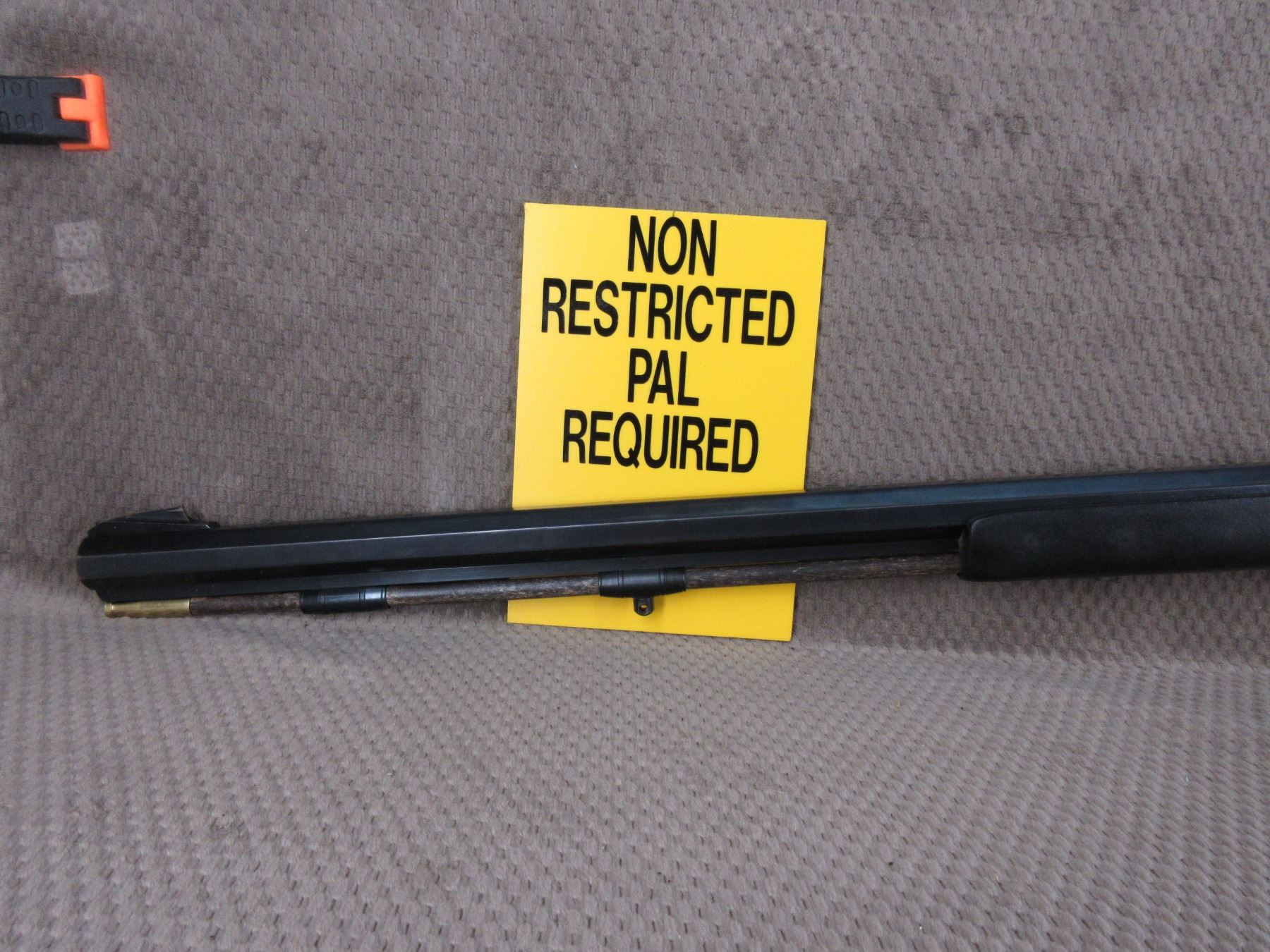 Non-Restricted - Cap & Ball Muzzle Loader in 69 Caliber - This muzzle loading single shot rifle with doulbe set triggers appears to be in good to very good working order. Barrel is 29", rifling is good, to very good, bluing is good to very good but has various marks, has both sights rear is a peep sight, stock a Precision Grips Inc. synthectic and is good to very good, has butt plate, has swivels and ramrod, Ser # None