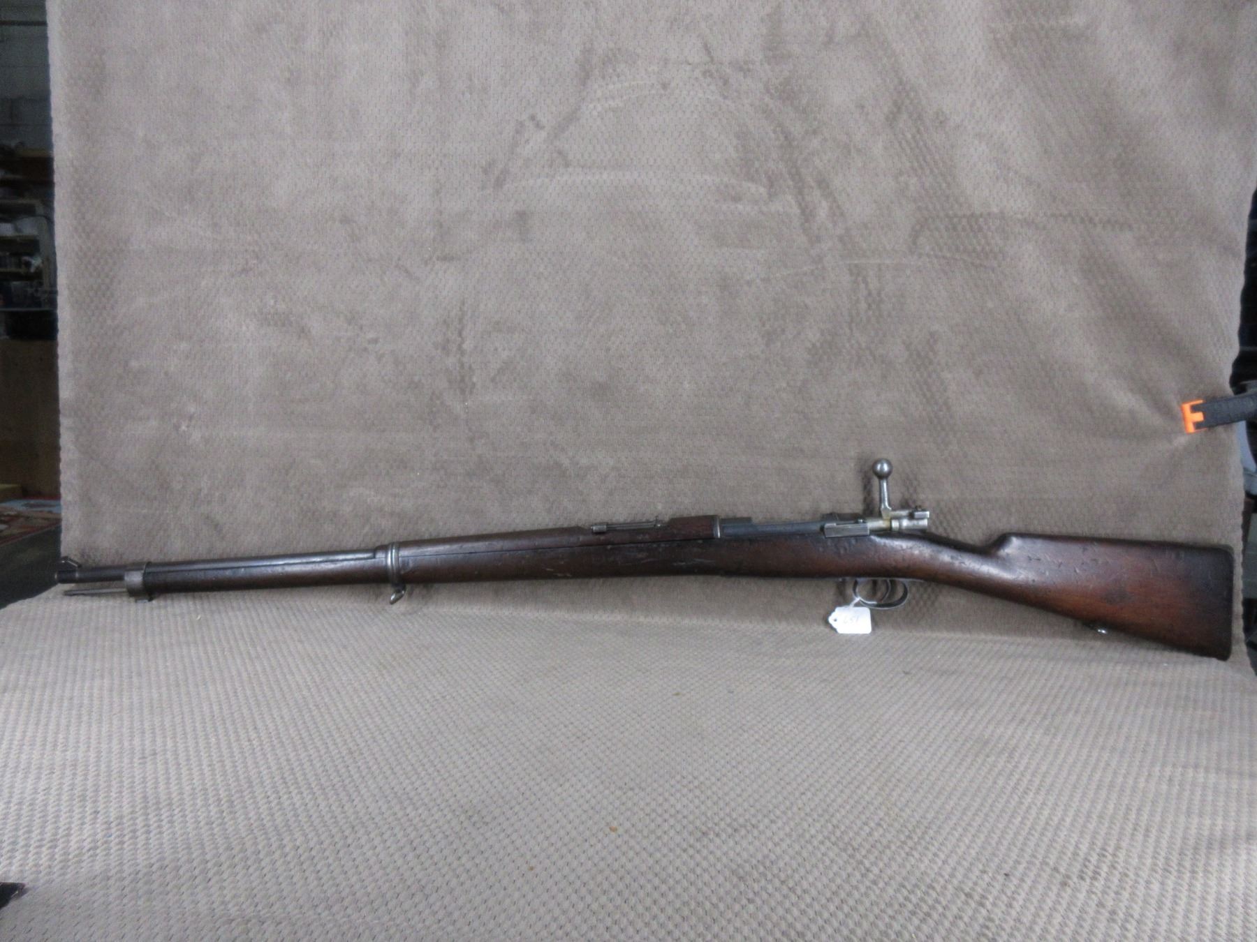 Non-Restricted - Chilean Mauser Model 1895 in 7X57 Mauser - This bolt action rifle with floor plate magazine appears to be in good working order. Barrel 28 1/2", rifling is there but it is very dark, bluing is turning grey, has both sights, stock good with many usage marks, metal butt plate.