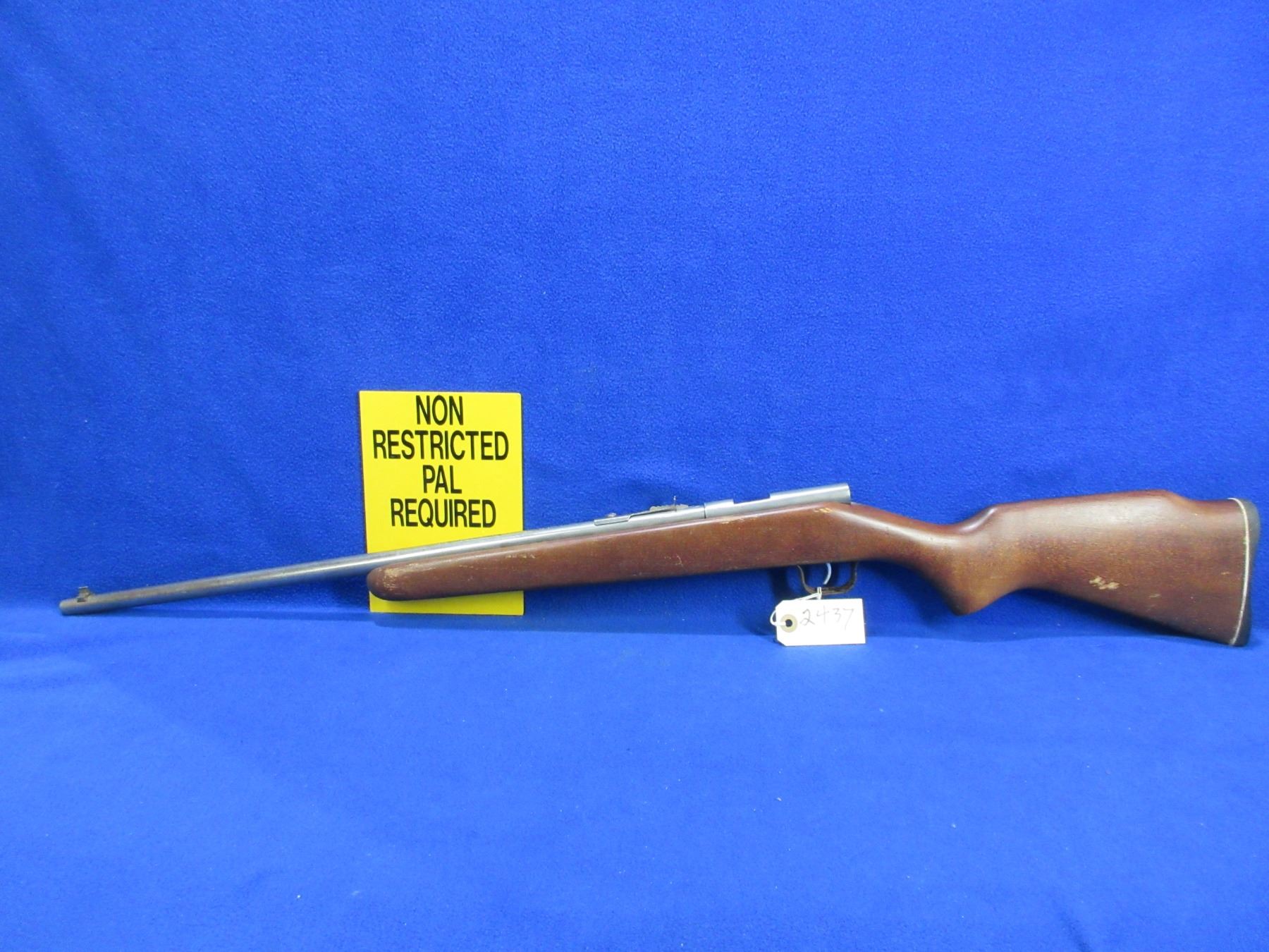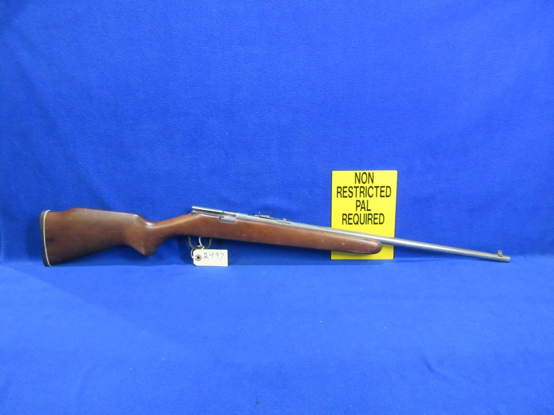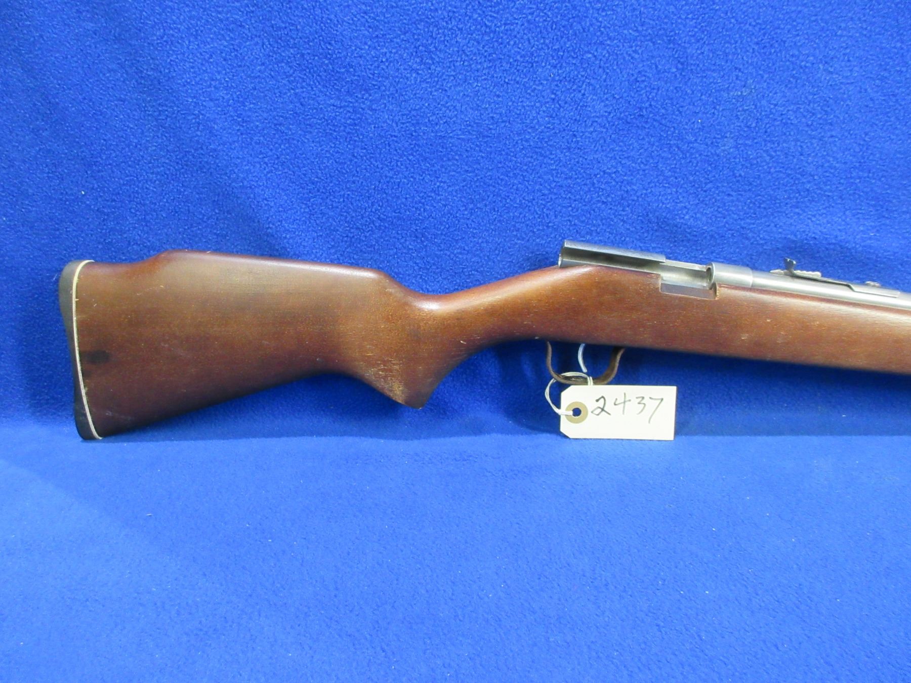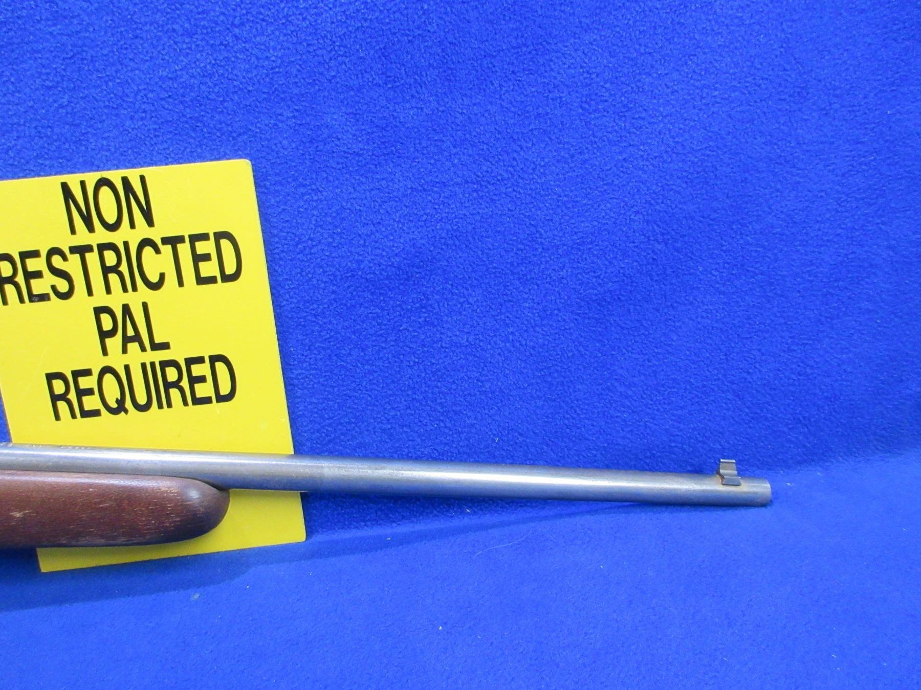 Non-Restricted - Cooey Model 39 in 22 LR - This is a single shot bolt action rifle, action appears to be in working order but bolt is missing. Barrel is 22", rifling is fair as barrel is ringed, bluing is gone, has both sights, stock is good to very good with finish flaking, length of pull is 12 1/2", butt plate good. Ser # None